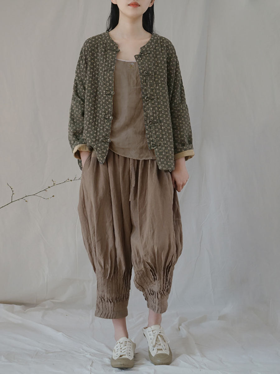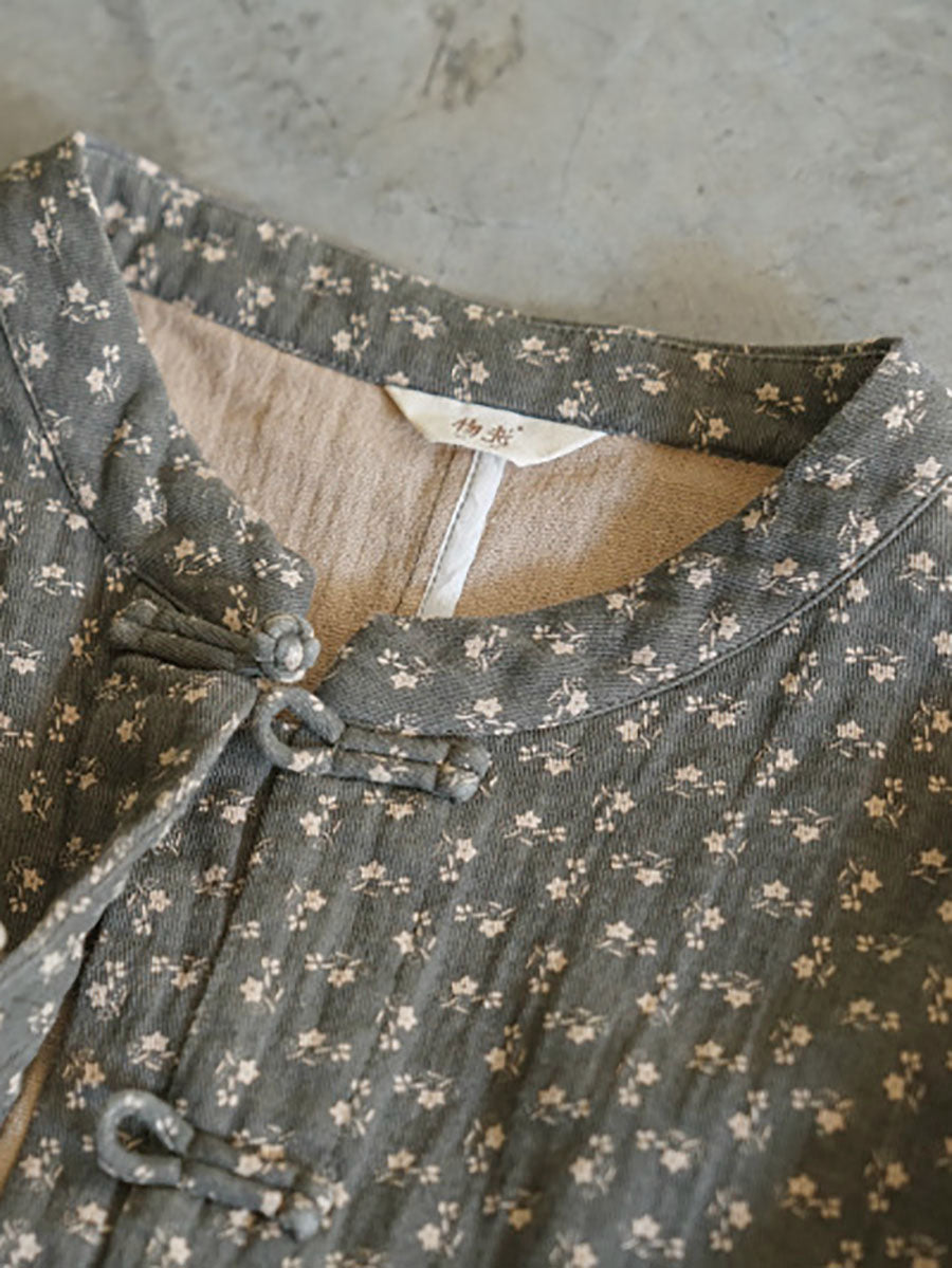 Este casaco é feito de algodão e apresenta um padrão floral. Ele tem uma gola alta e mangas compridas estilo raglan, dando a ele um visual vintage. Perfeito para as estações de primavera e outono.