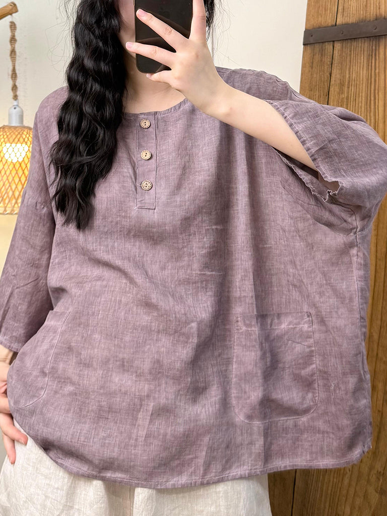 Camisa feminina de linho retrô de verão com gola redonda e cor pura