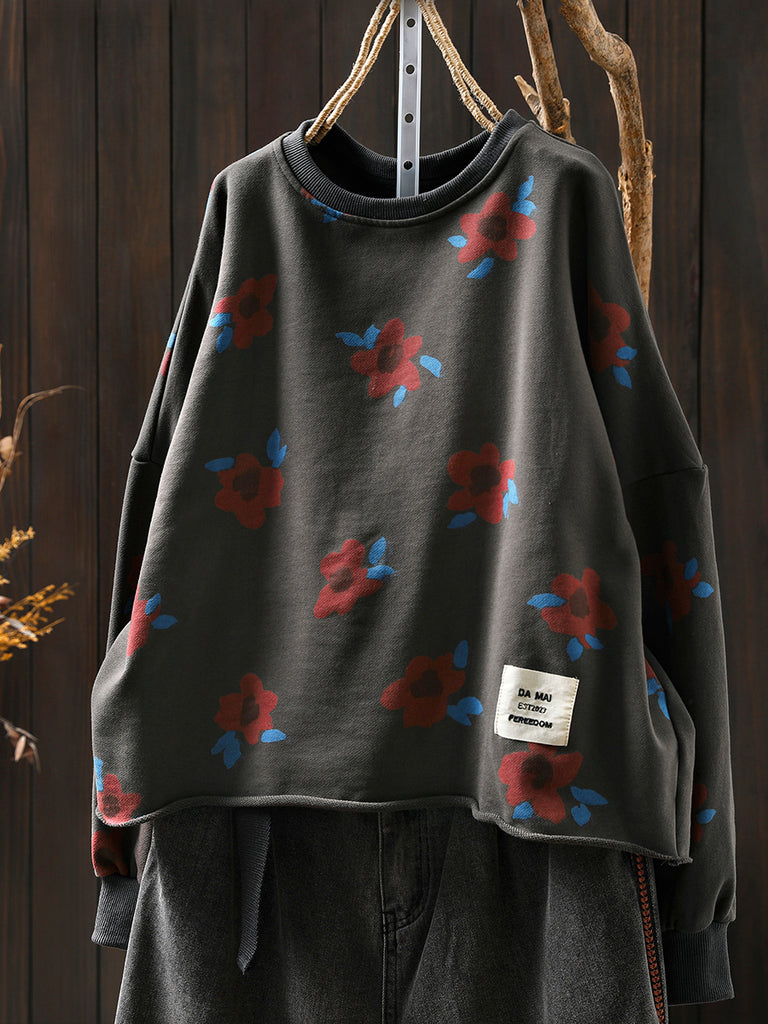 Blusa feminina de algodão com gola redonda e flores artísticas de outono