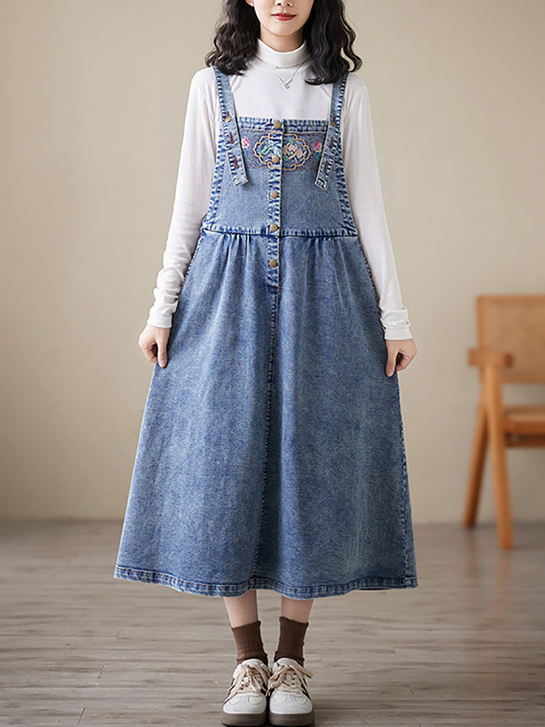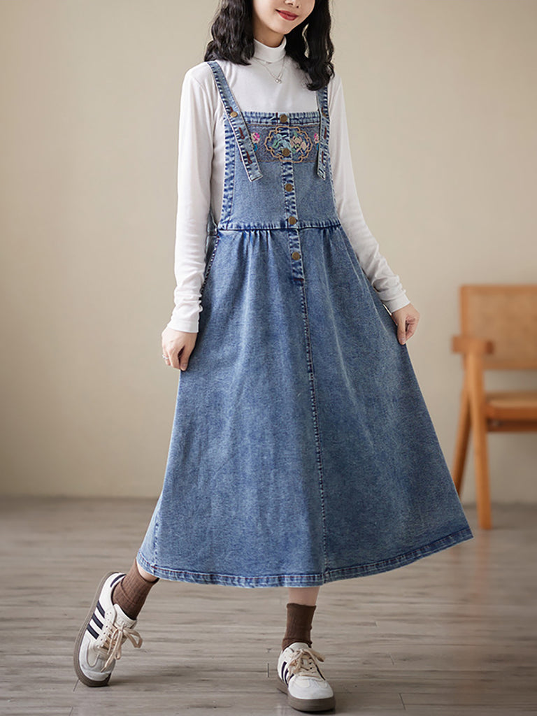 Vestido de linho feminino com gola alta e flores artísticas para o verão