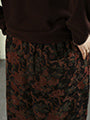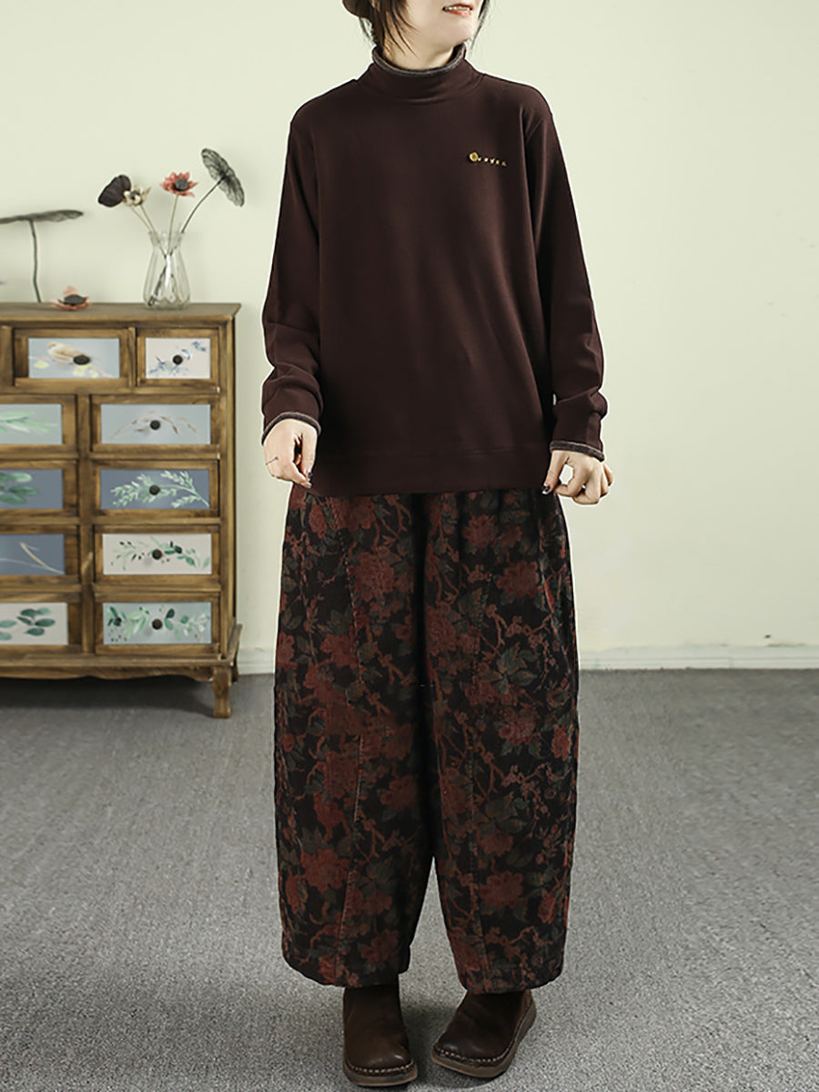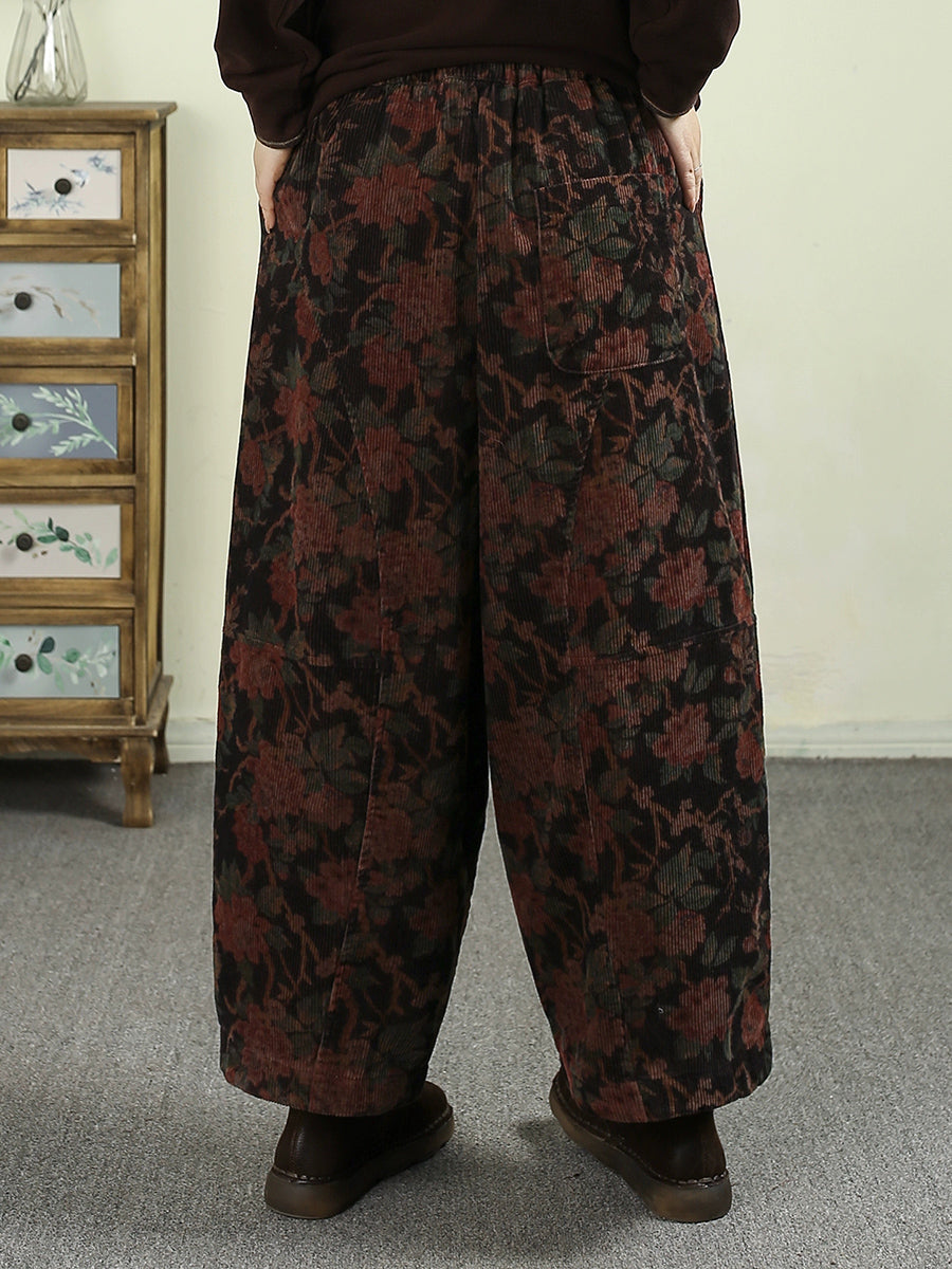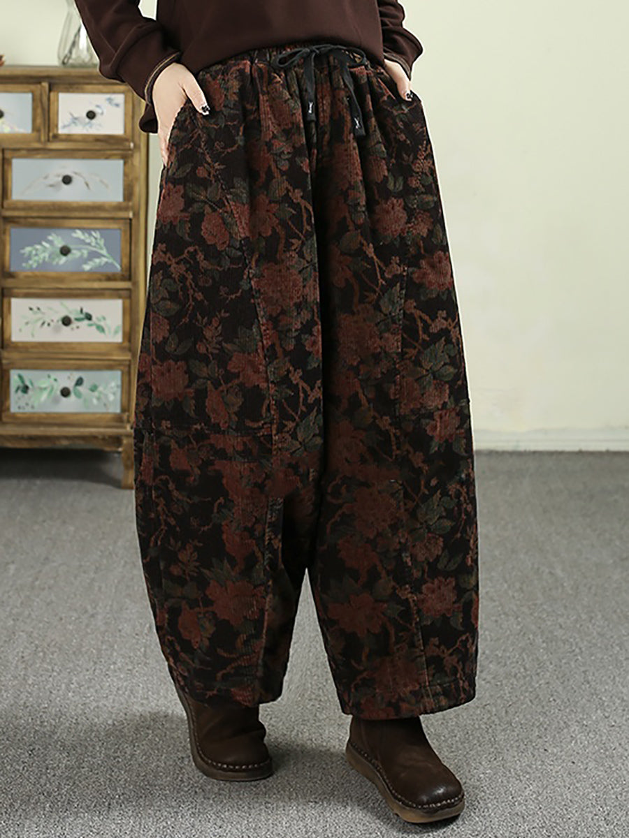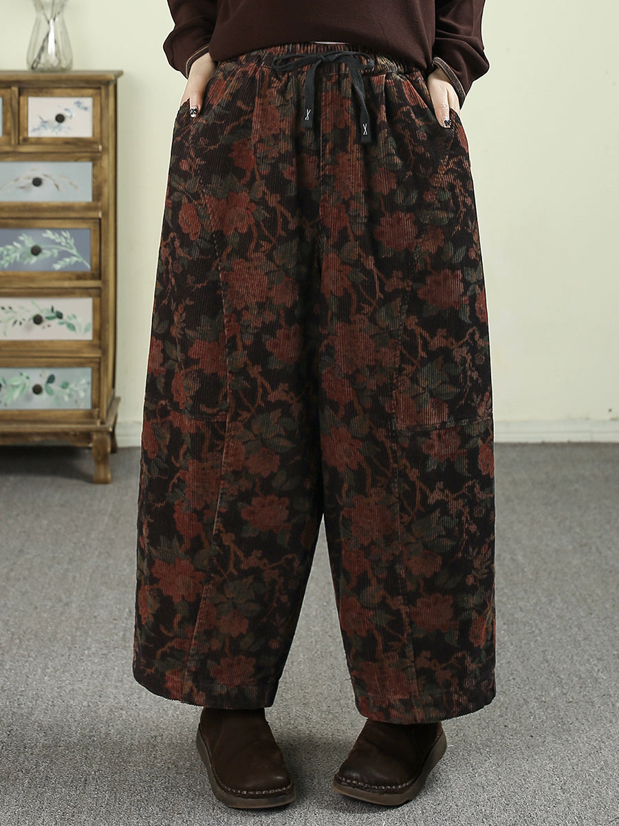 Calças de inverno femininas de veludo cotelê com estampa floral e acolchoamento nas pernas.
