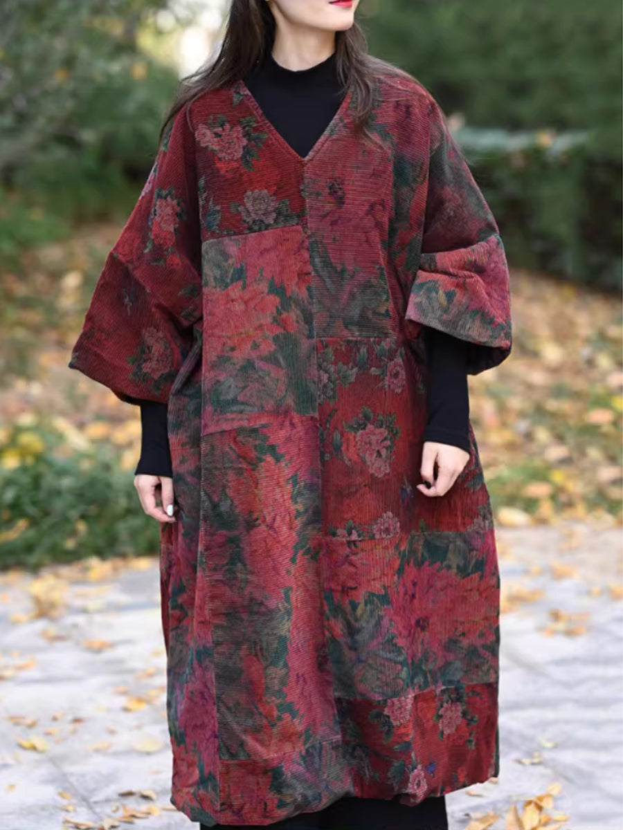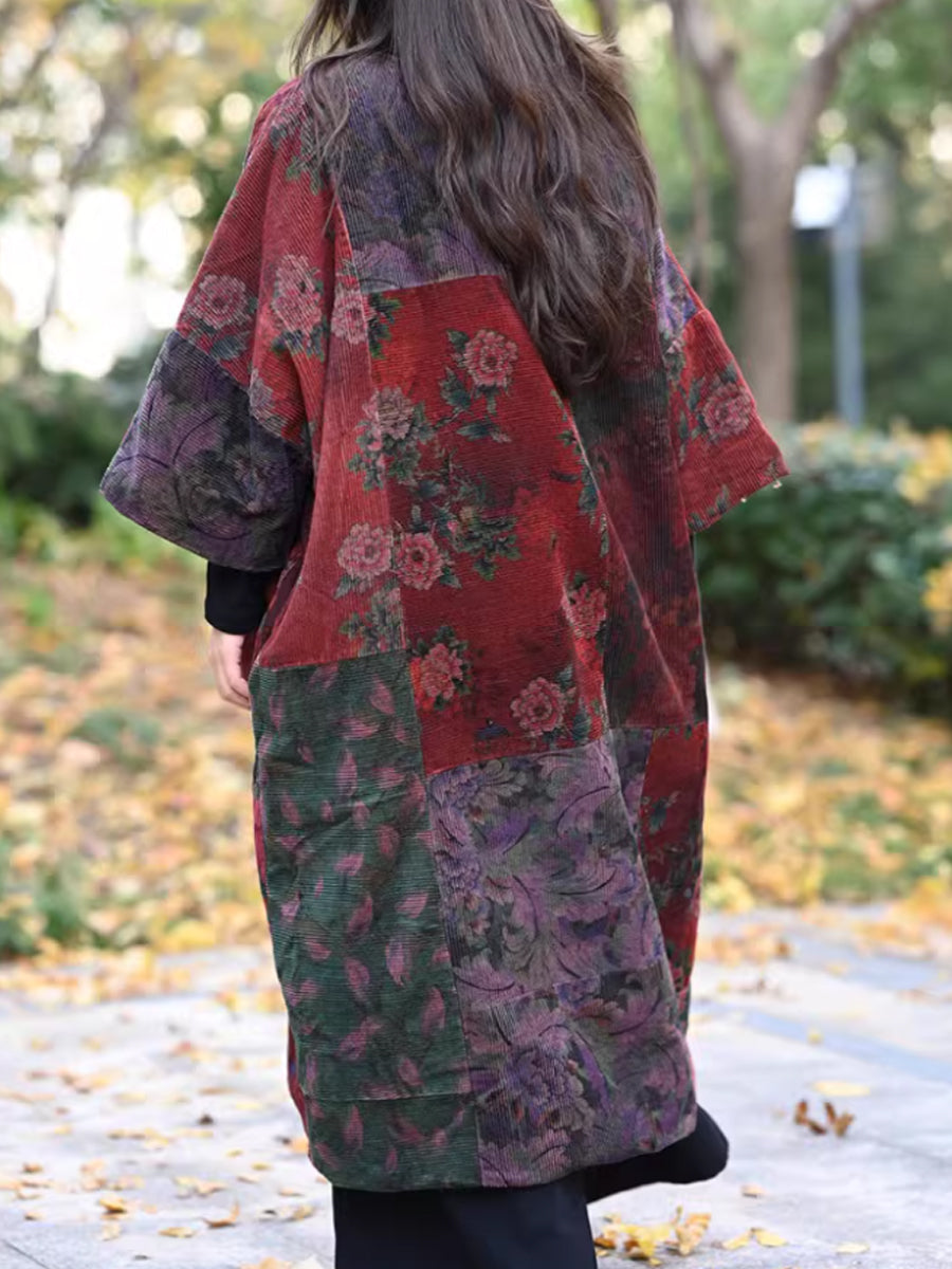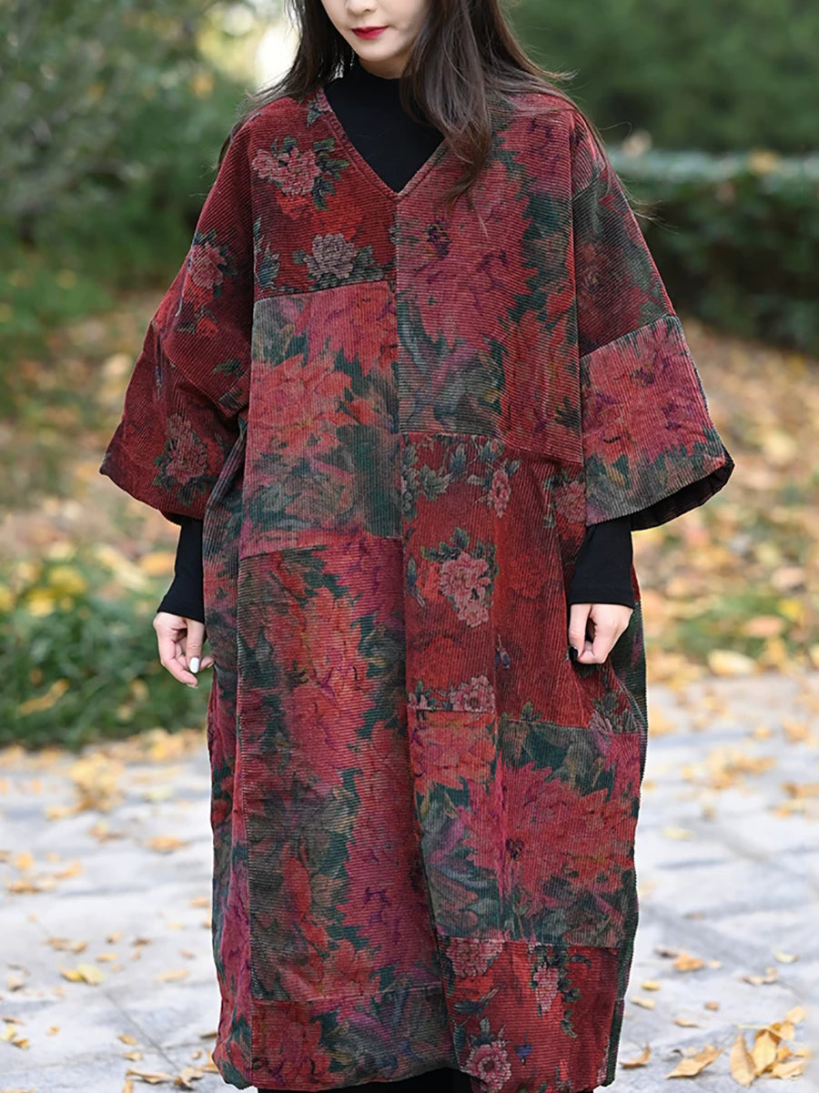 Casaco feminino de inverno vintage com decote em V e aplicações florais.