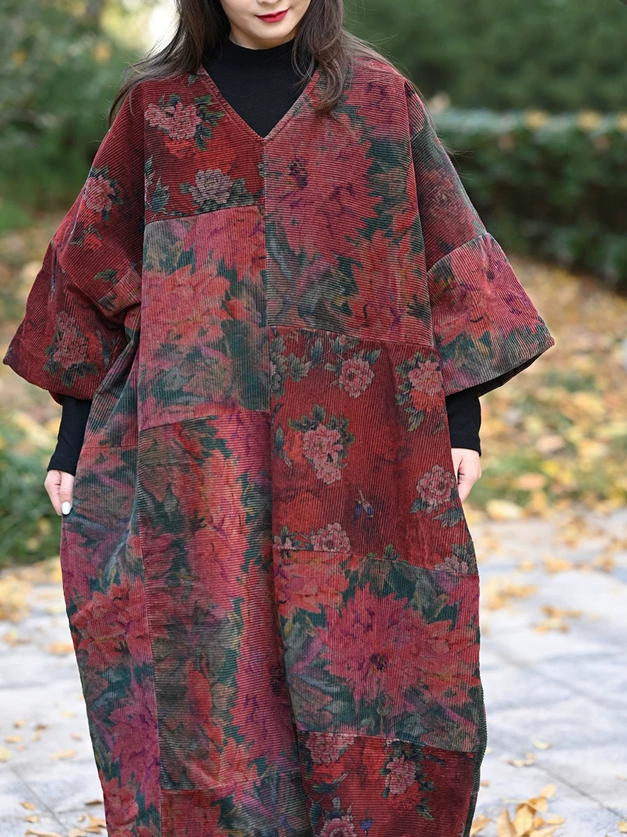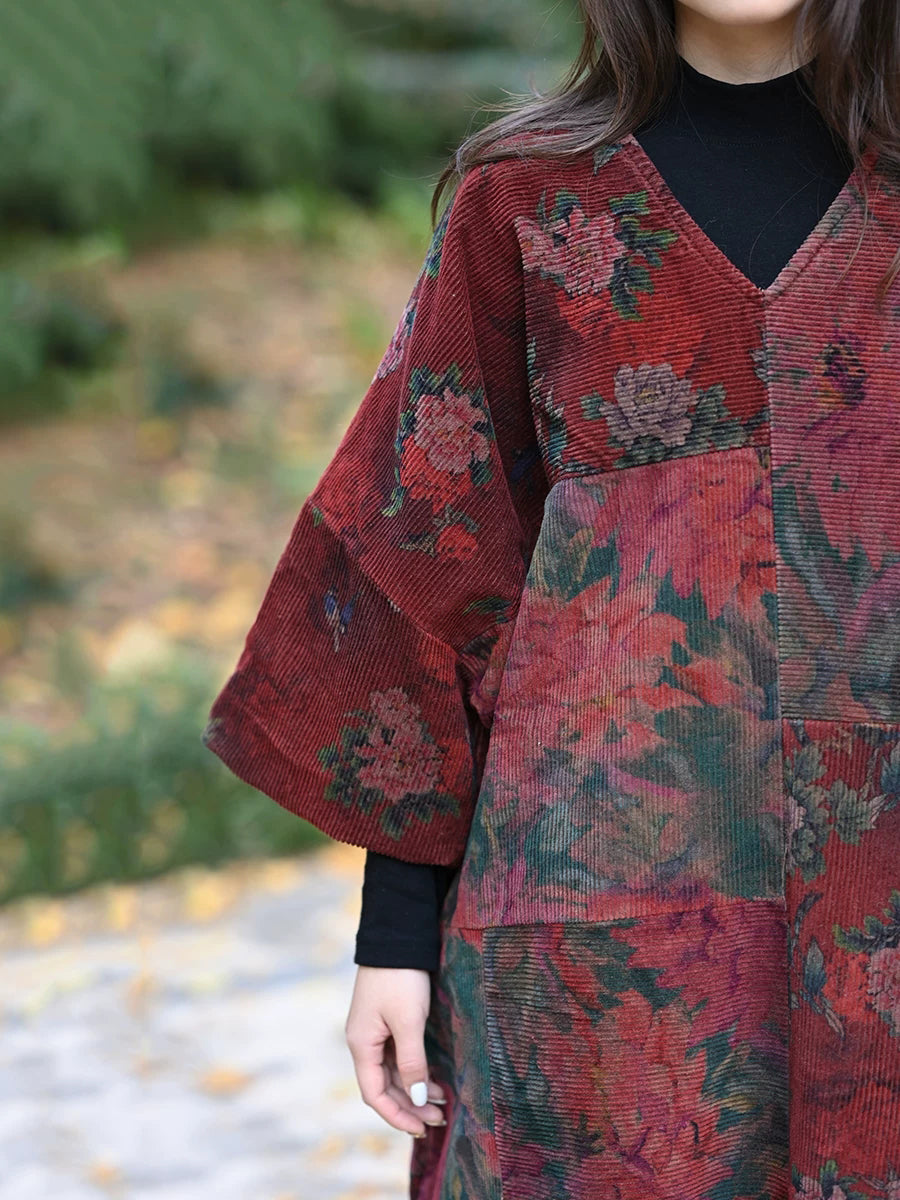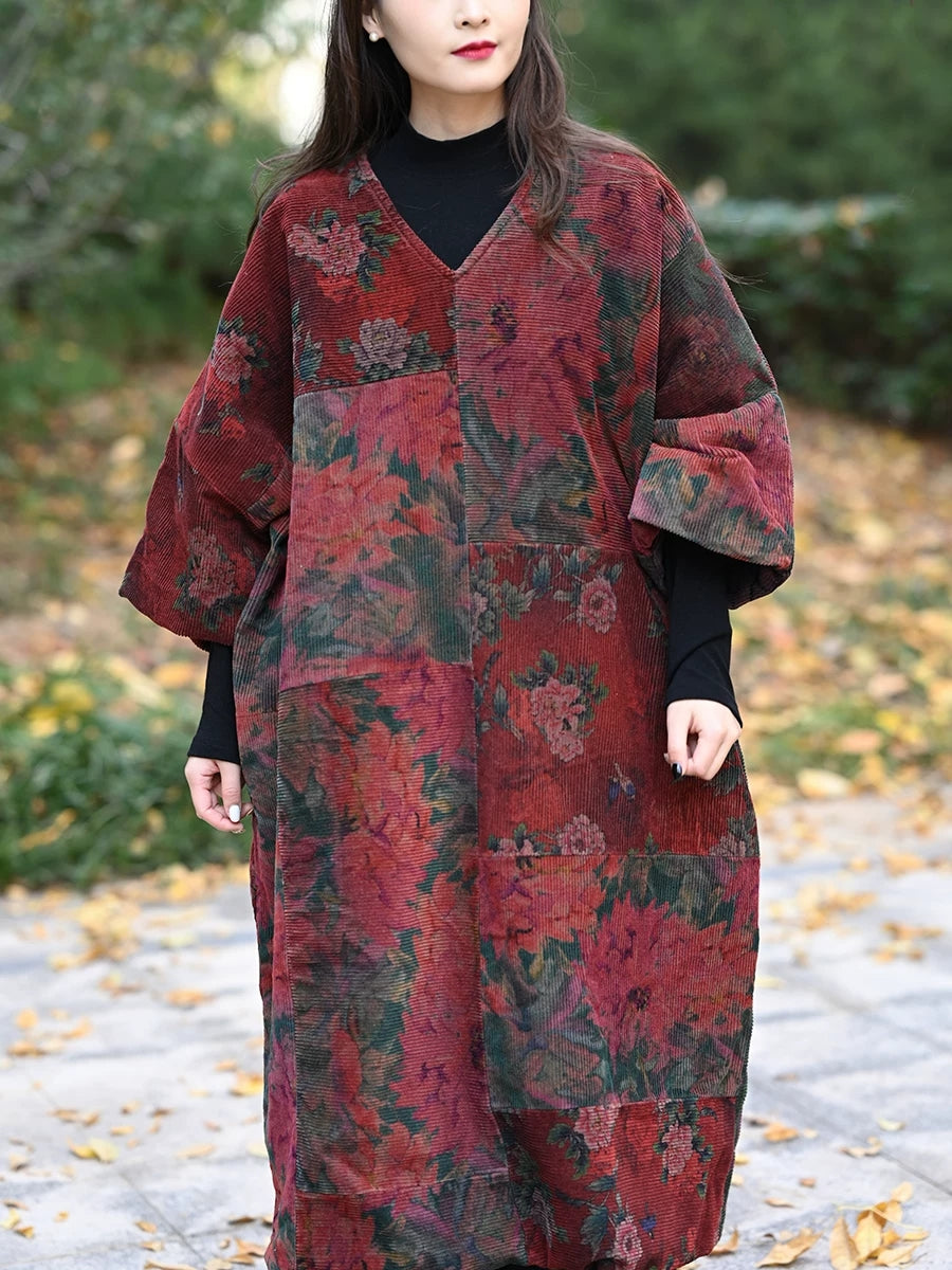 Casaco feminino de inverno vintage com decote em V e aplicações florais.