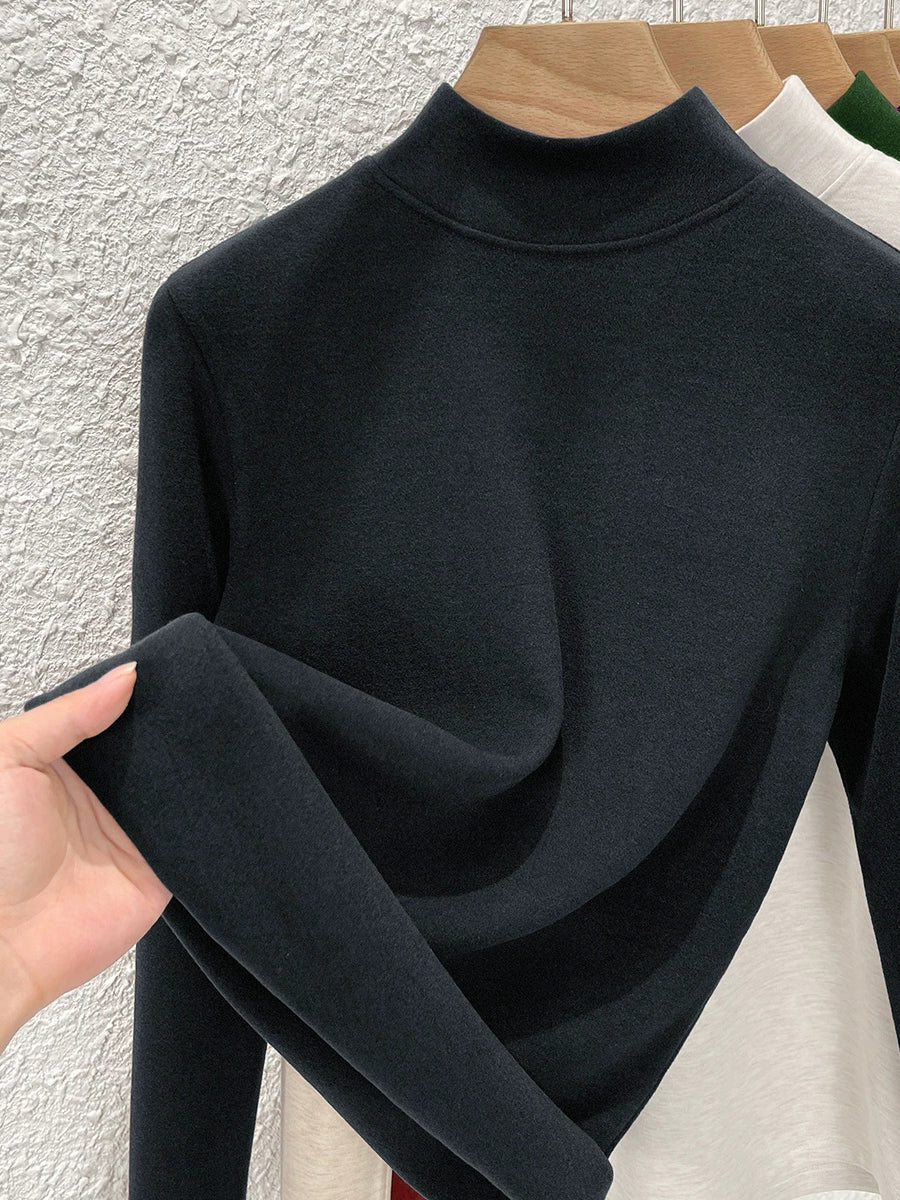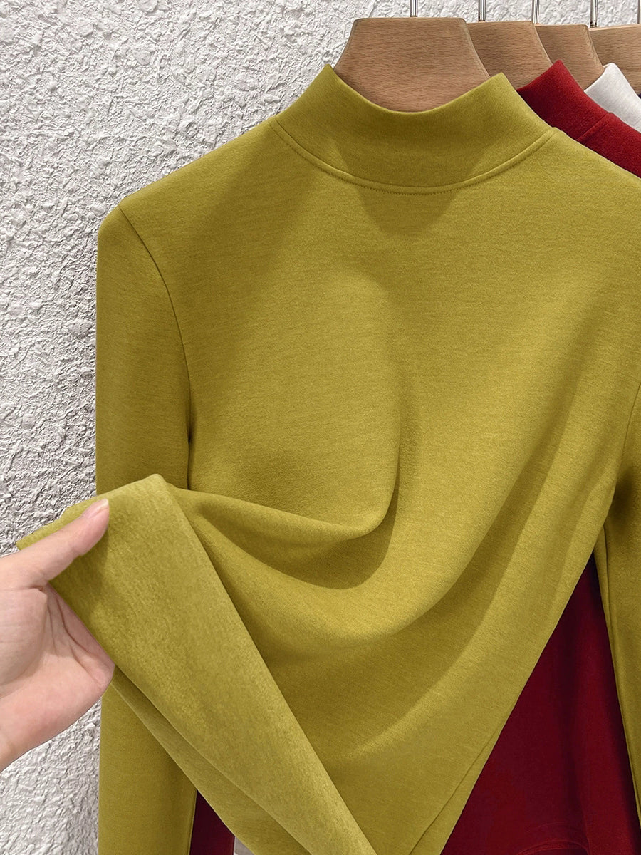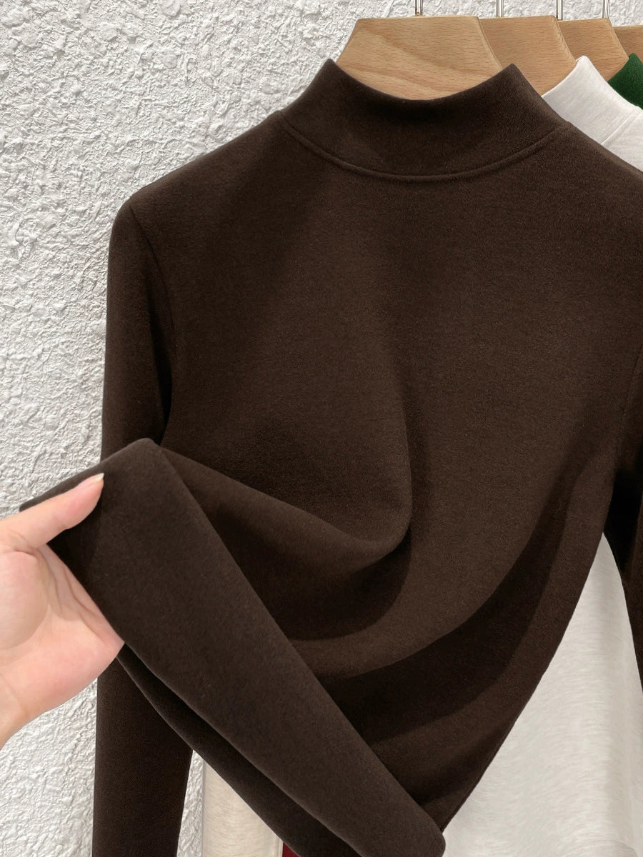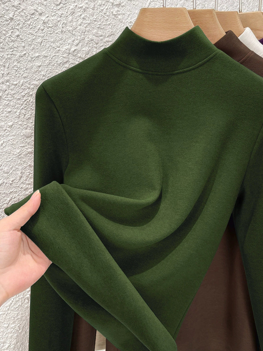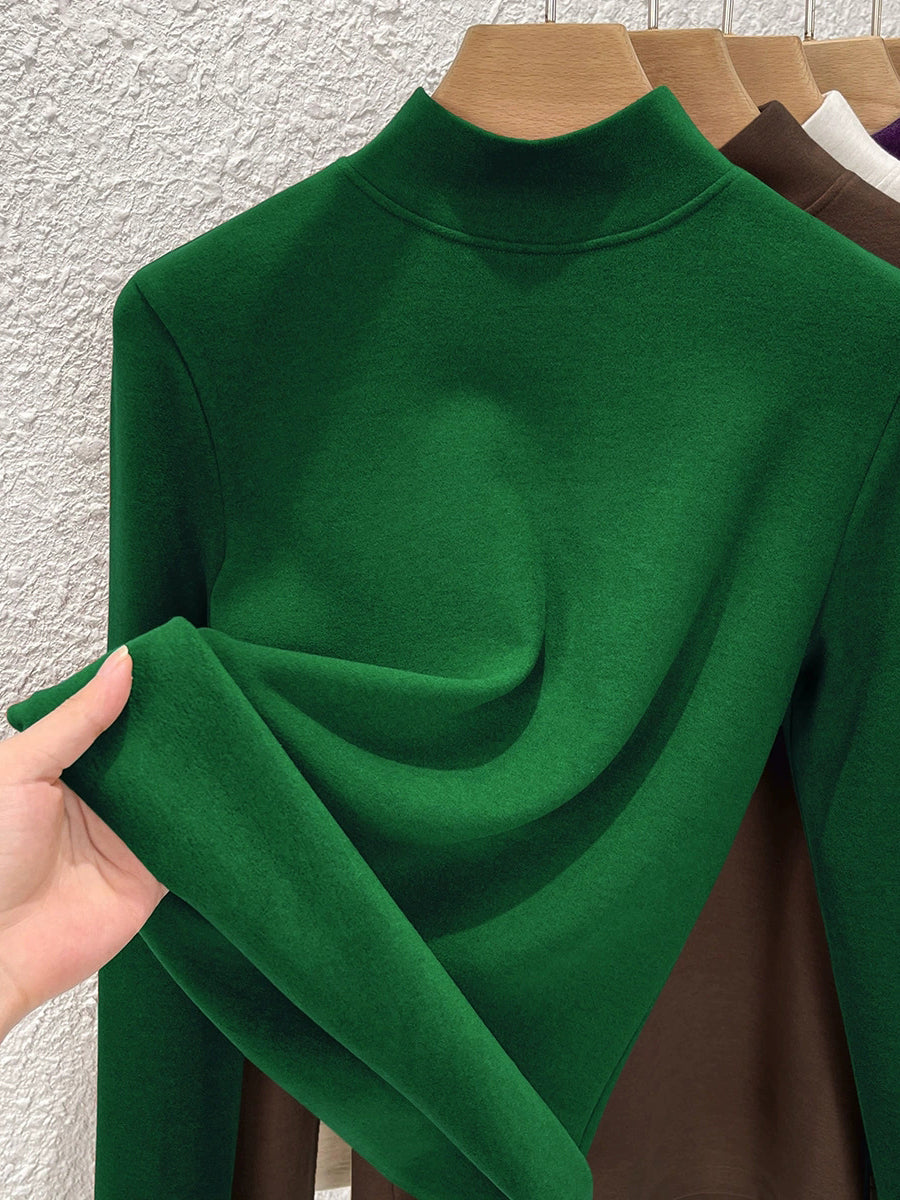 Blusa feminina de inverno de cor lisa com gola alta até a metade da coxa.