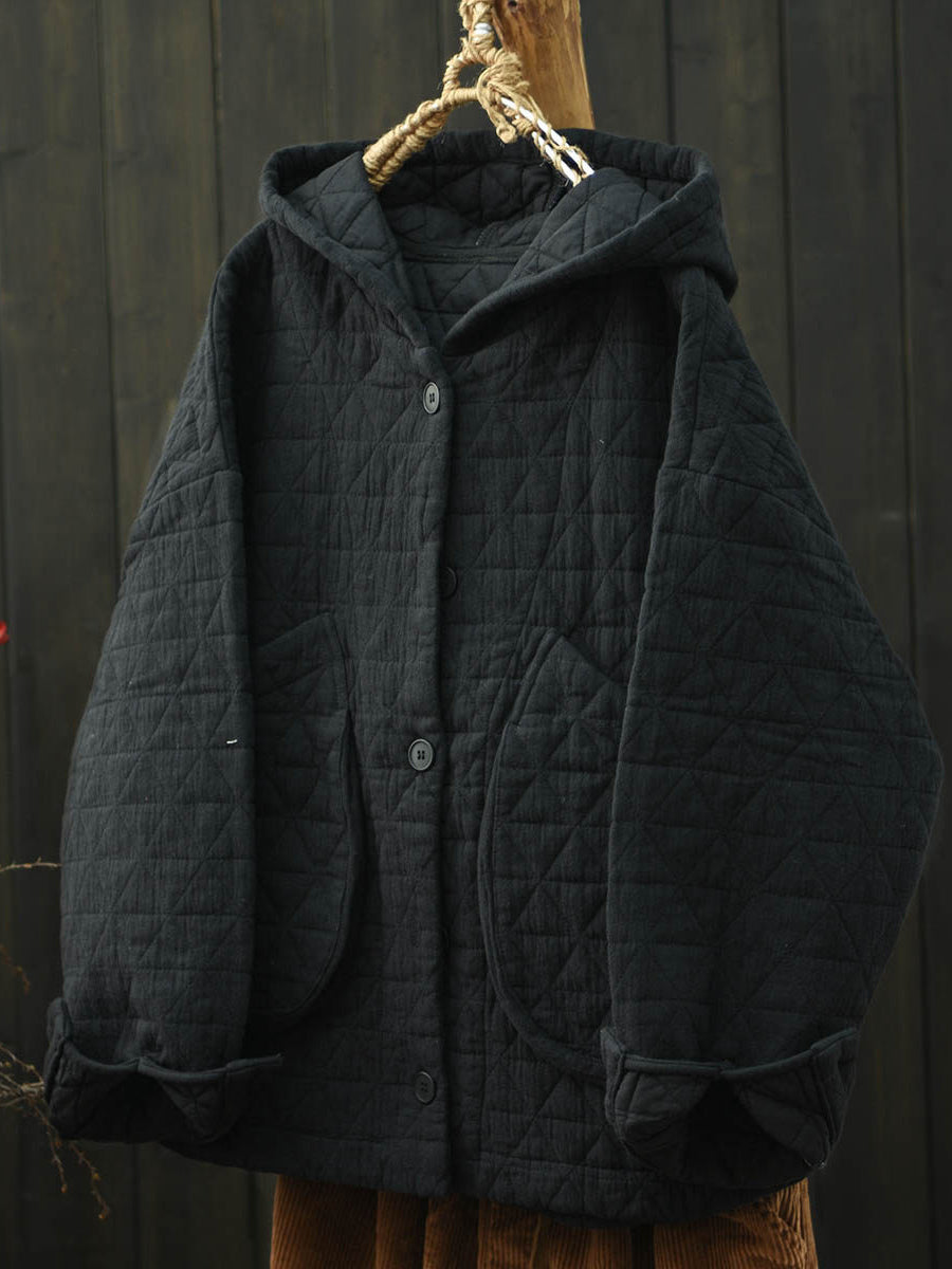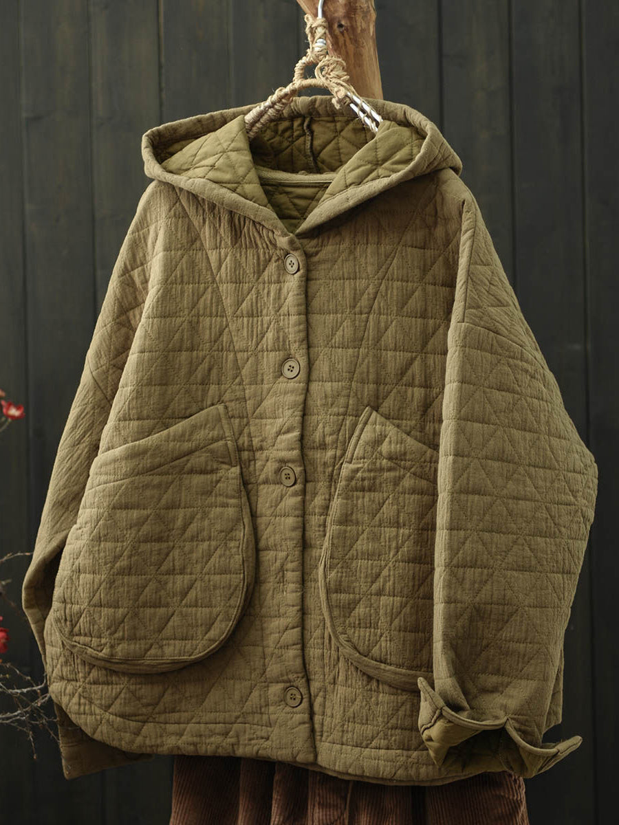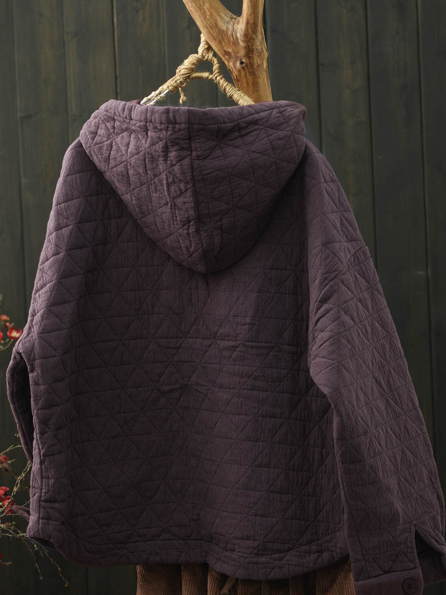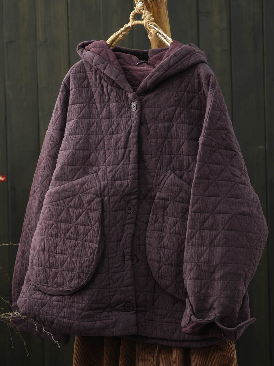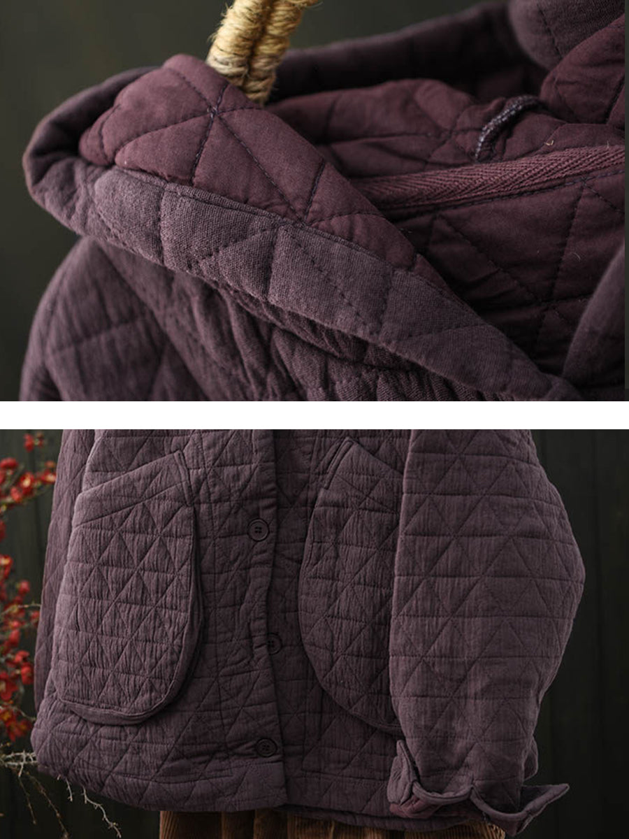 Casaco acolchoado com capuz feminino retrô de algodão em cores lisas para o inverno.