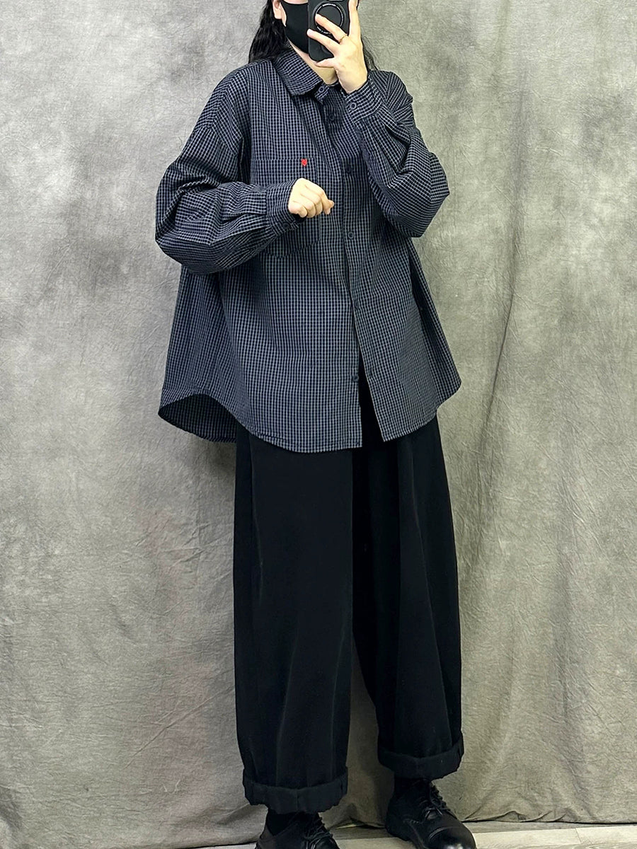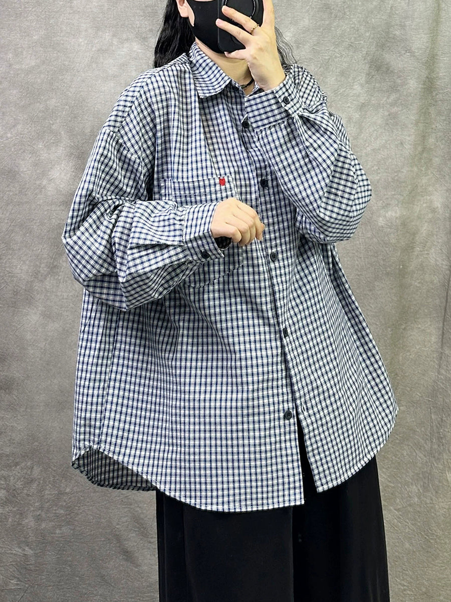 Camisa feminina de algodão com estampa floral e gola dobrável em treliça.