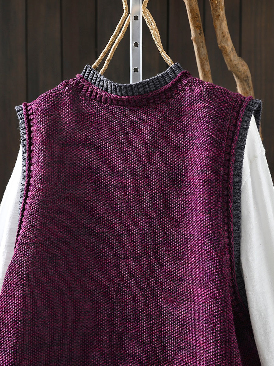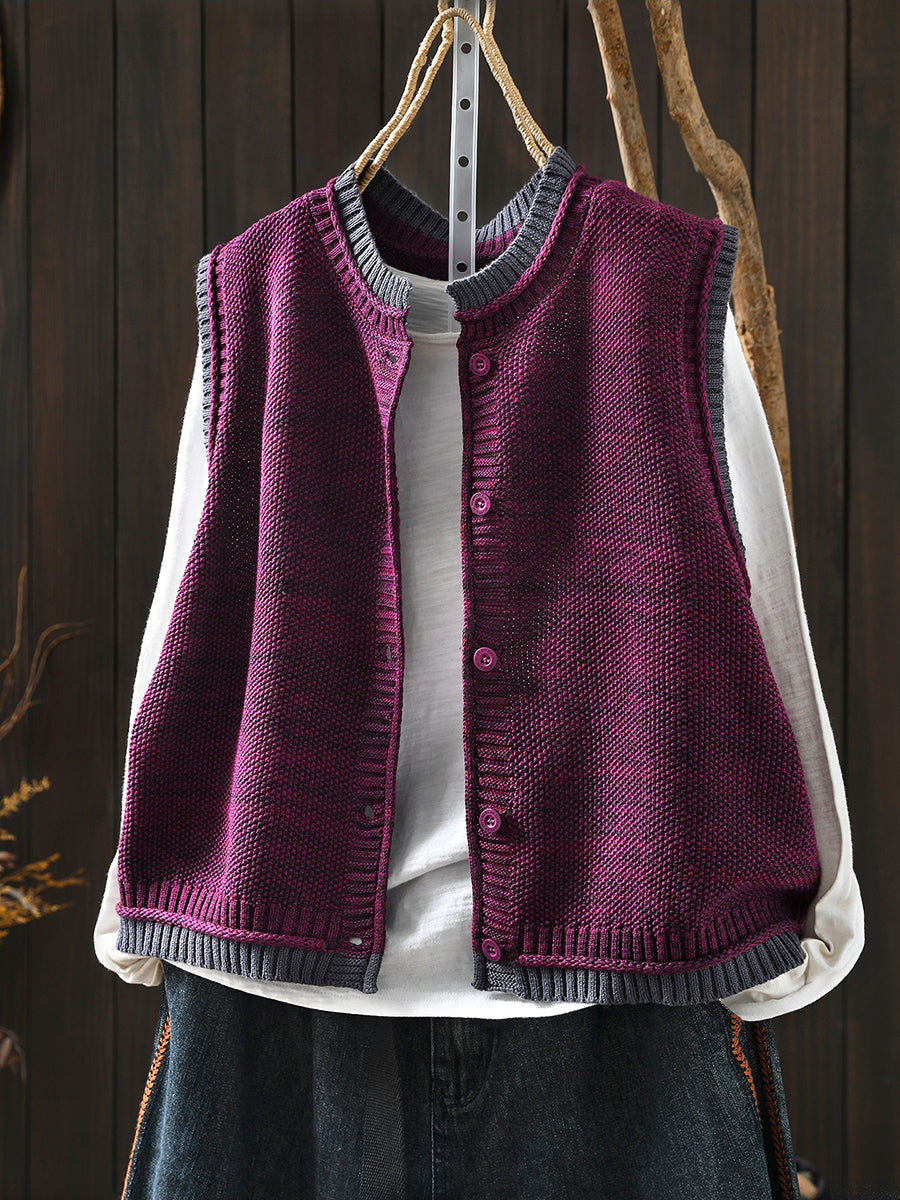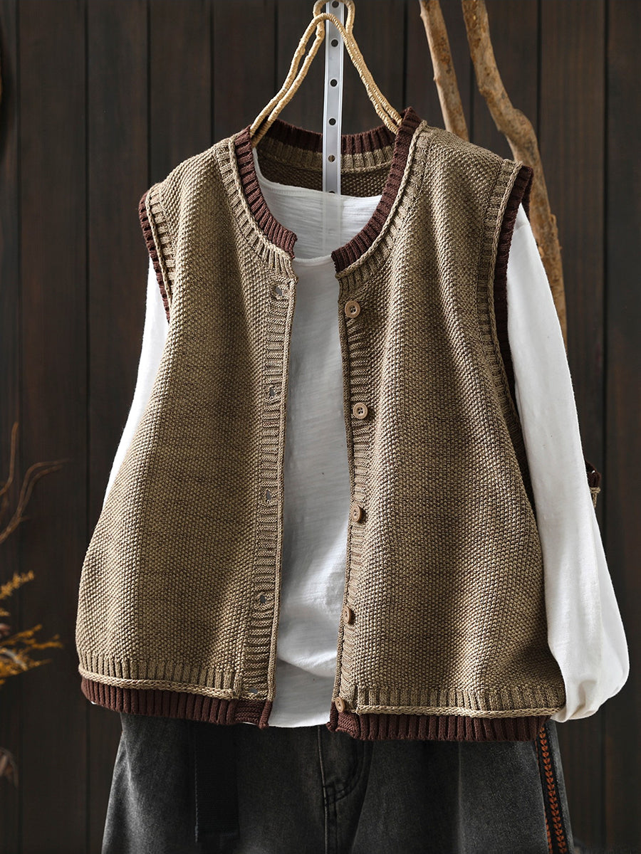 Colete feminino de tricô com decote redondo e blocos de cores, estilo artístico para a primavera
