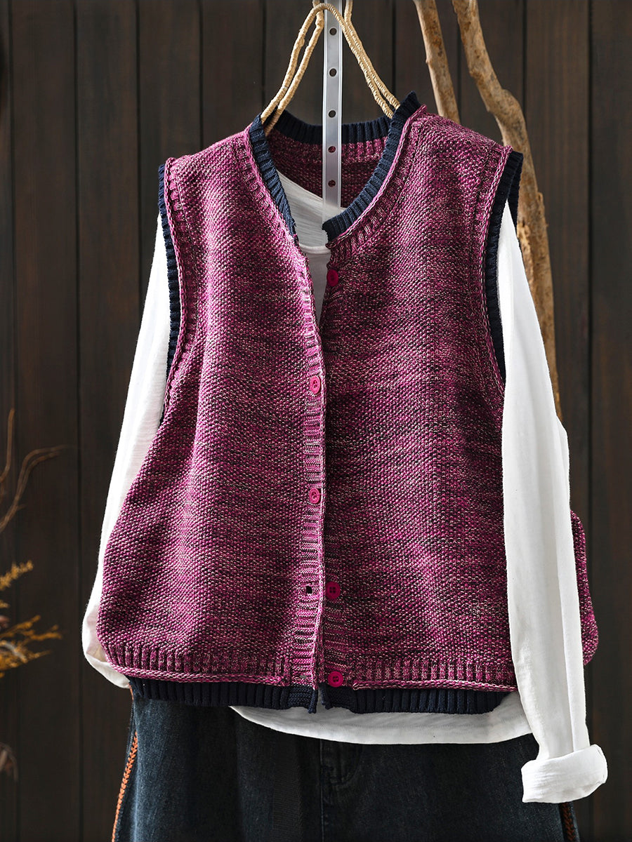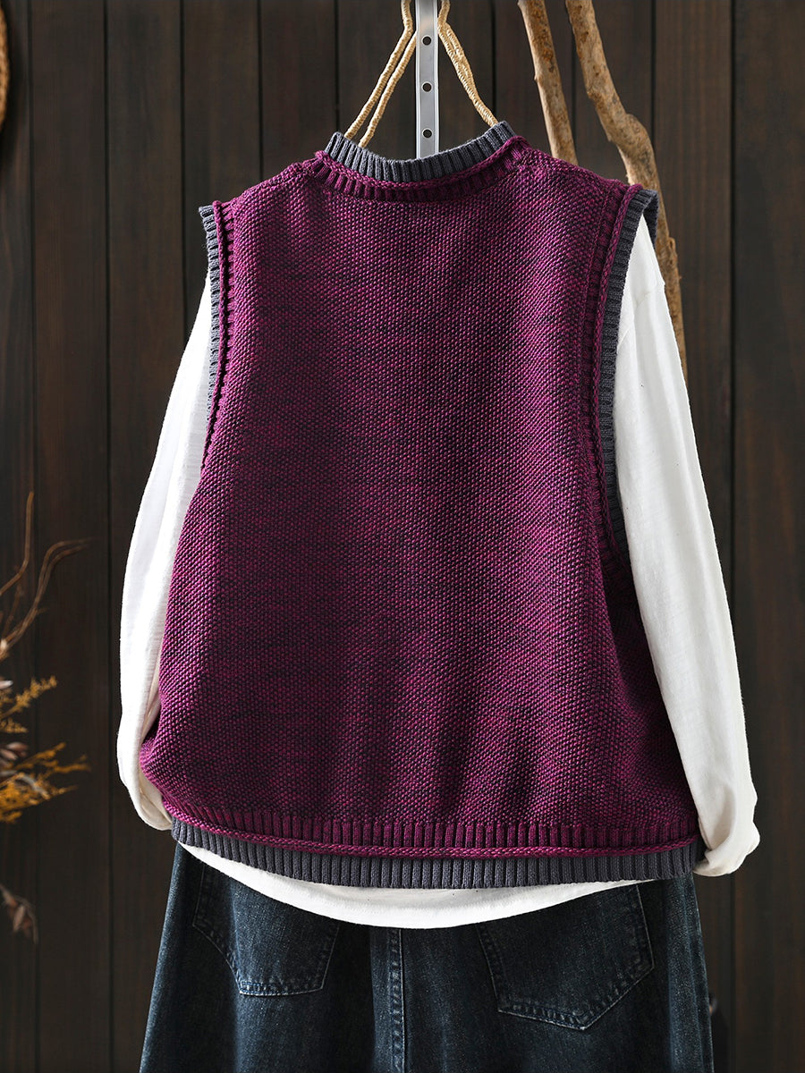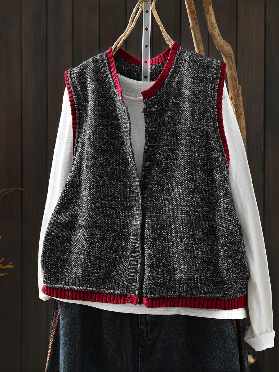 Colete feminino de tricô com decote redondo e blocos de cores, estilo artístico para a primavera