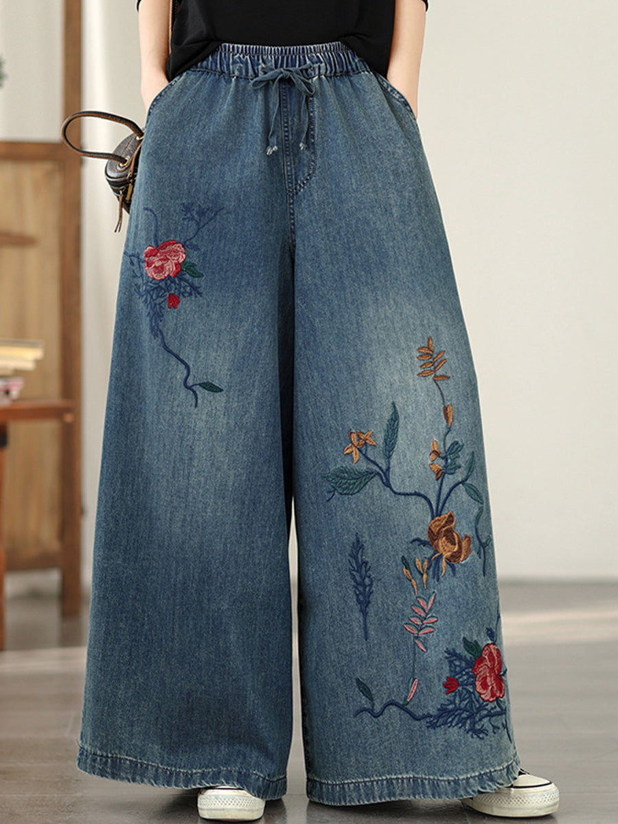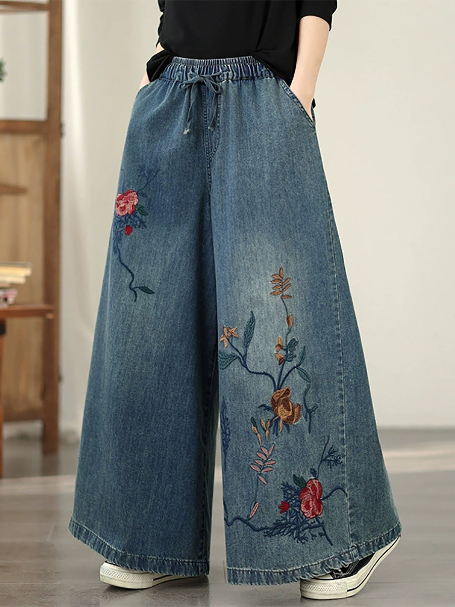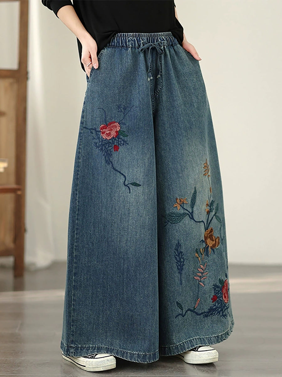 Calça feminina vintage de primavera em jeans com bordado floral e pernas largas