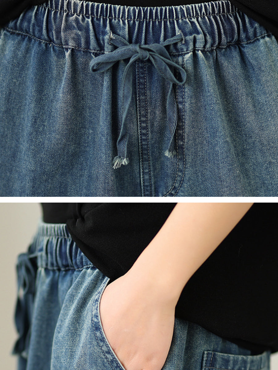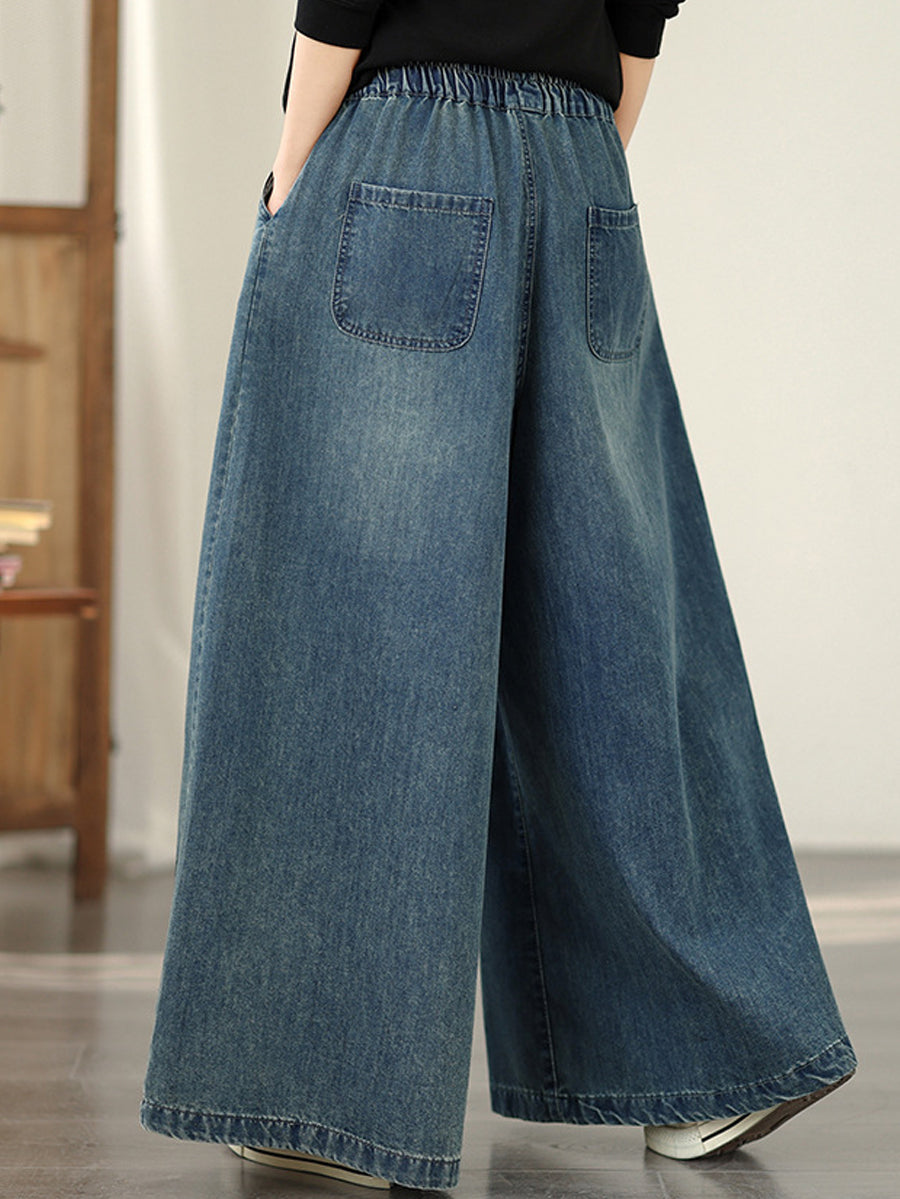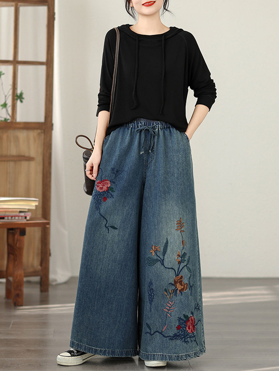 Calça feminina vintage de primavera em jeans com bordado floral e pernas largas
