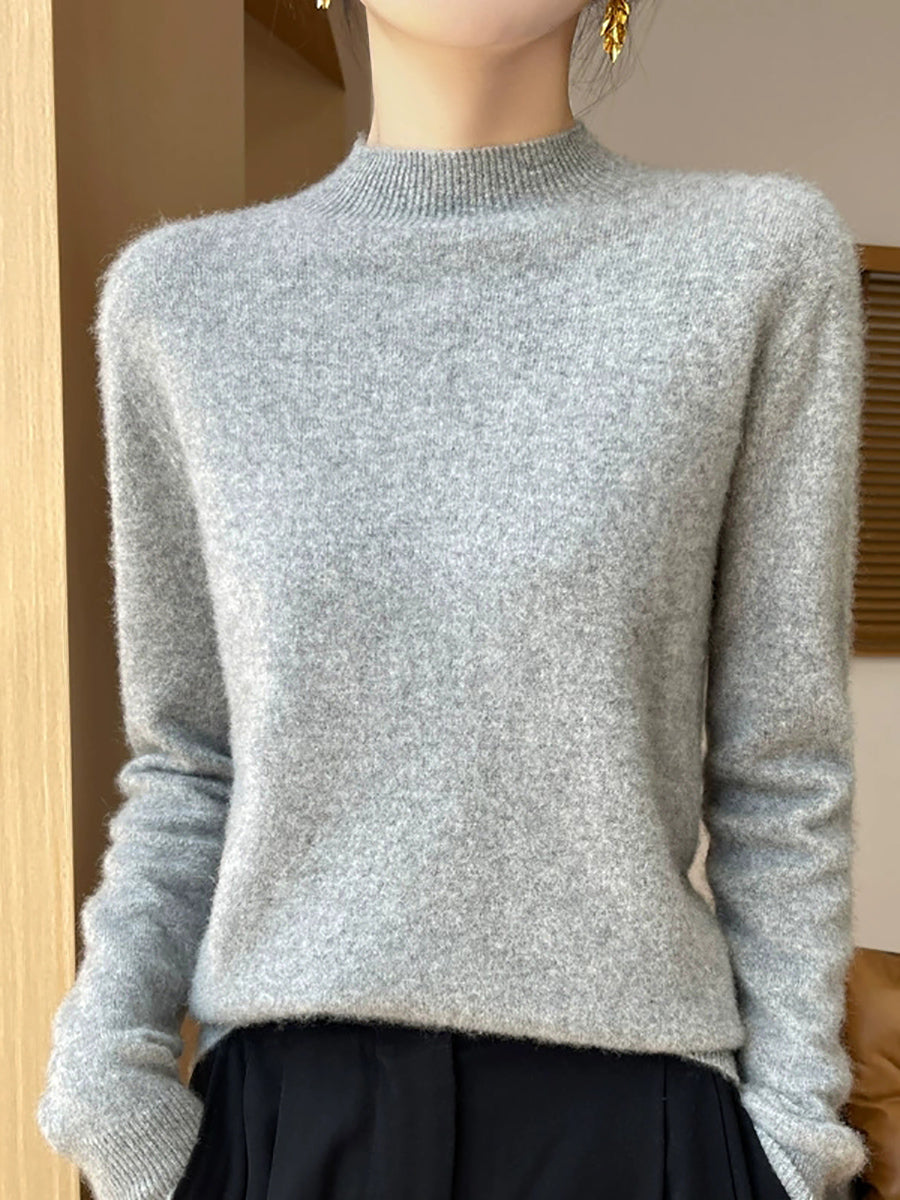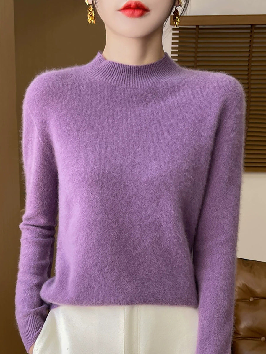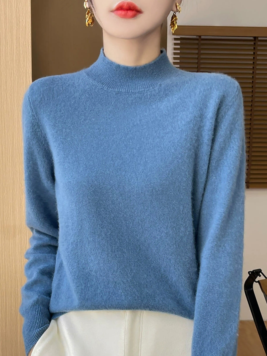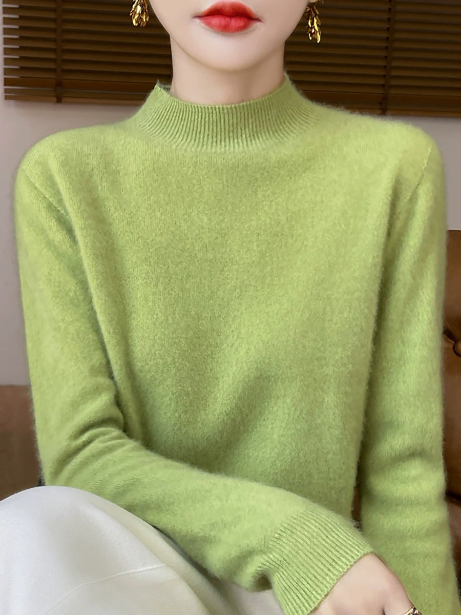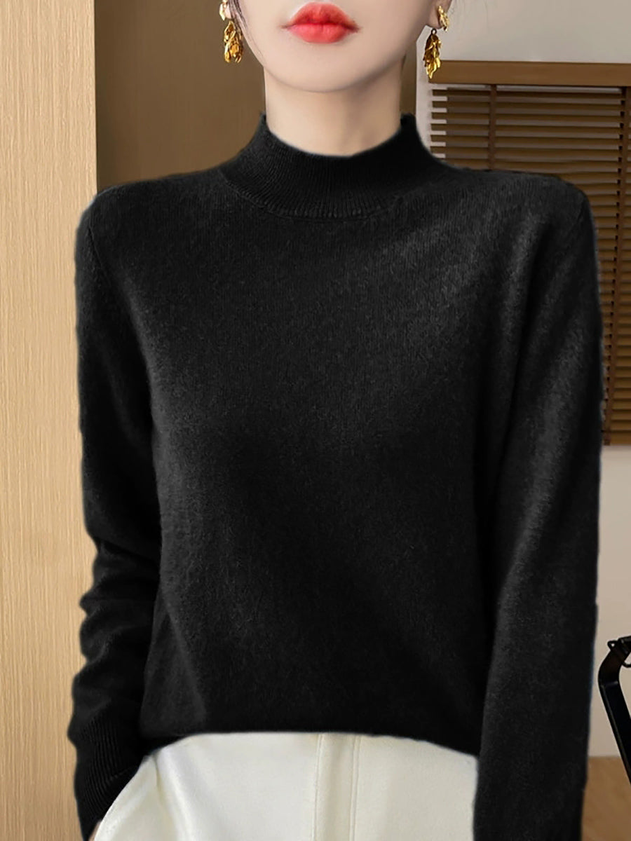 Suéter feminino de gola alta curta em cores lisas, estilo artístico outonal.