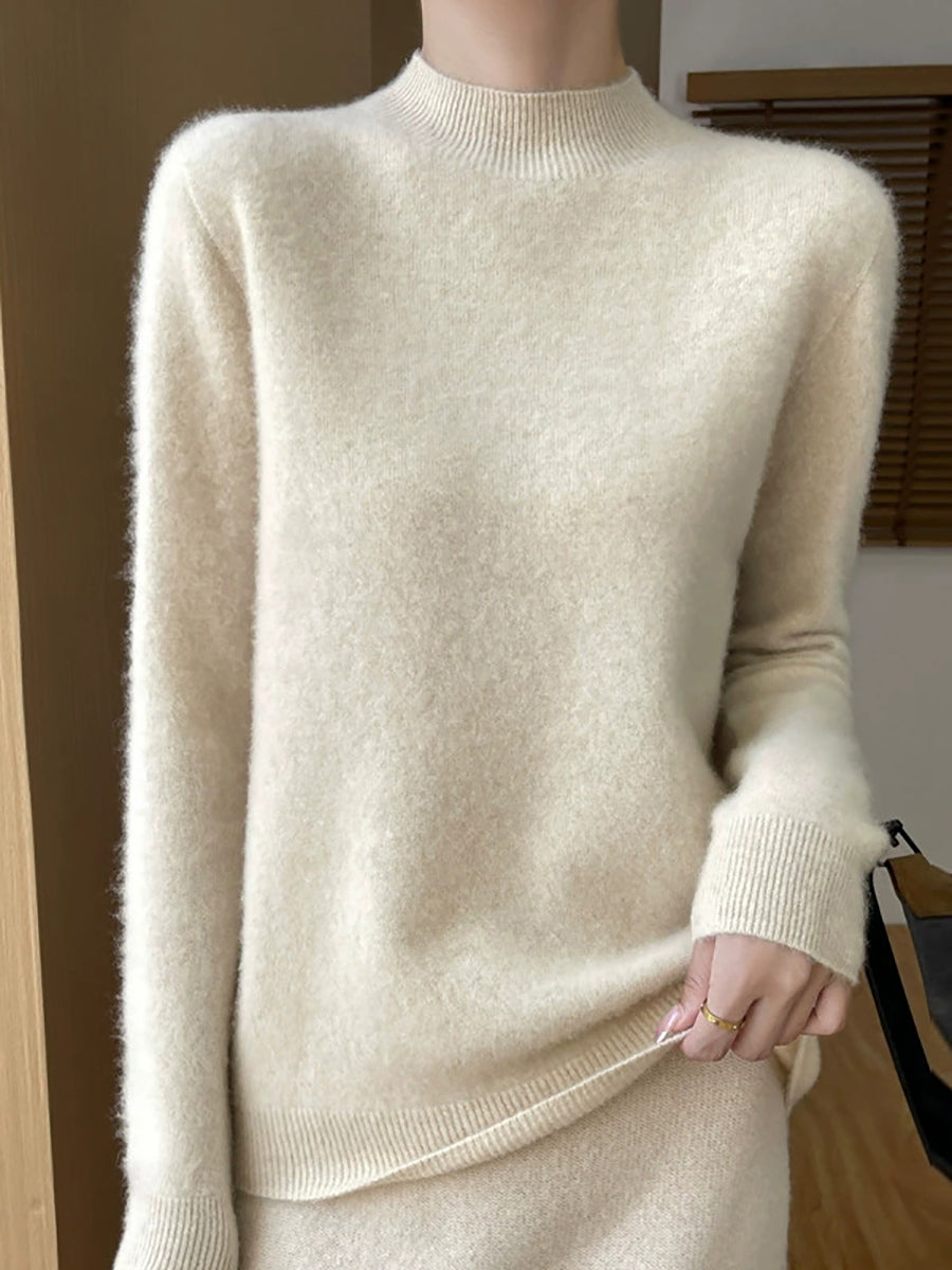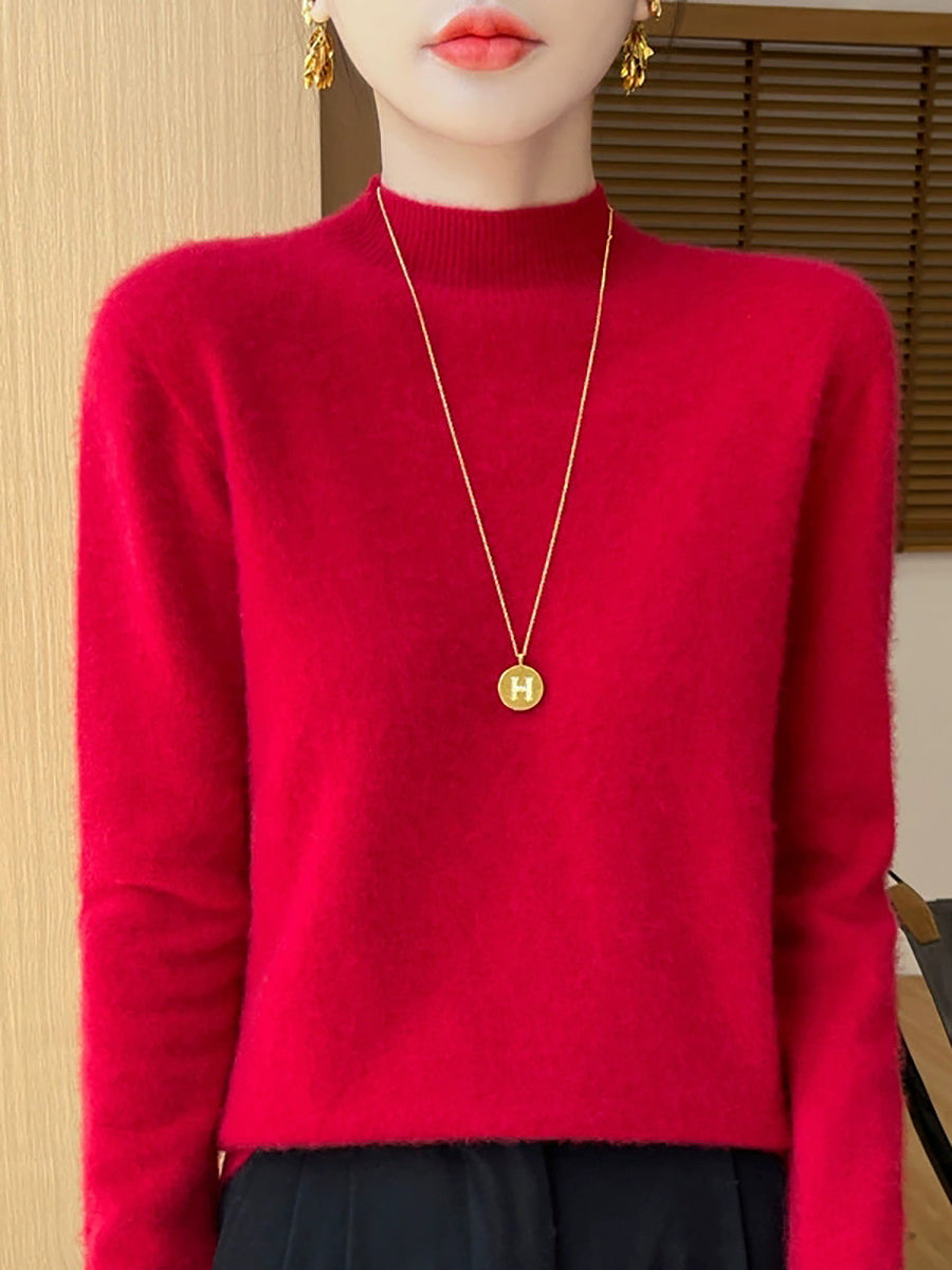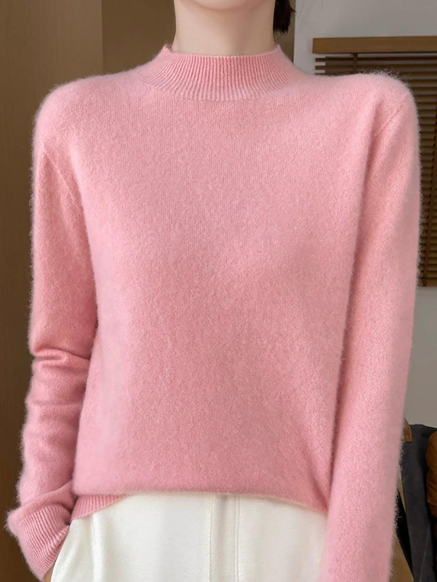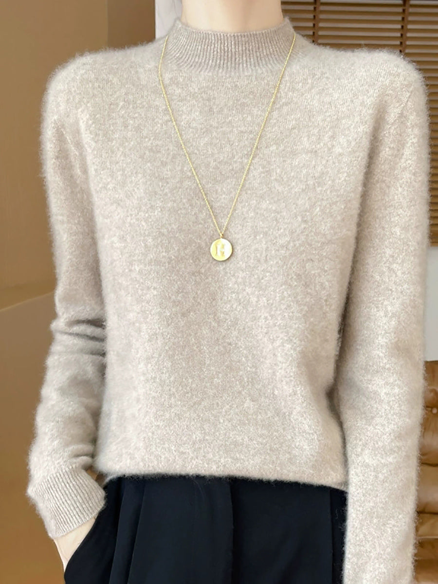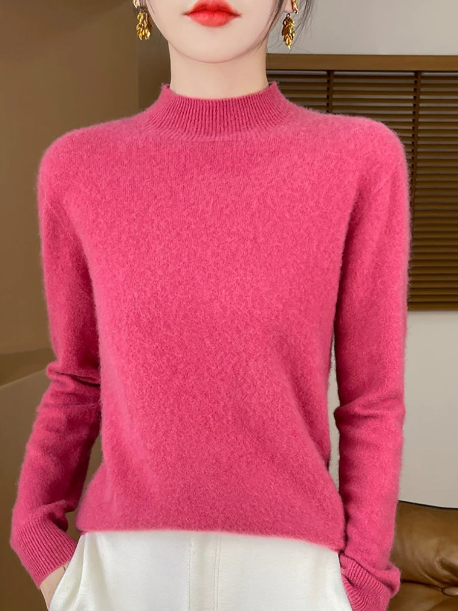 Suéter feminino de gola alta curta em cores lisas, estilo artístico outonal.