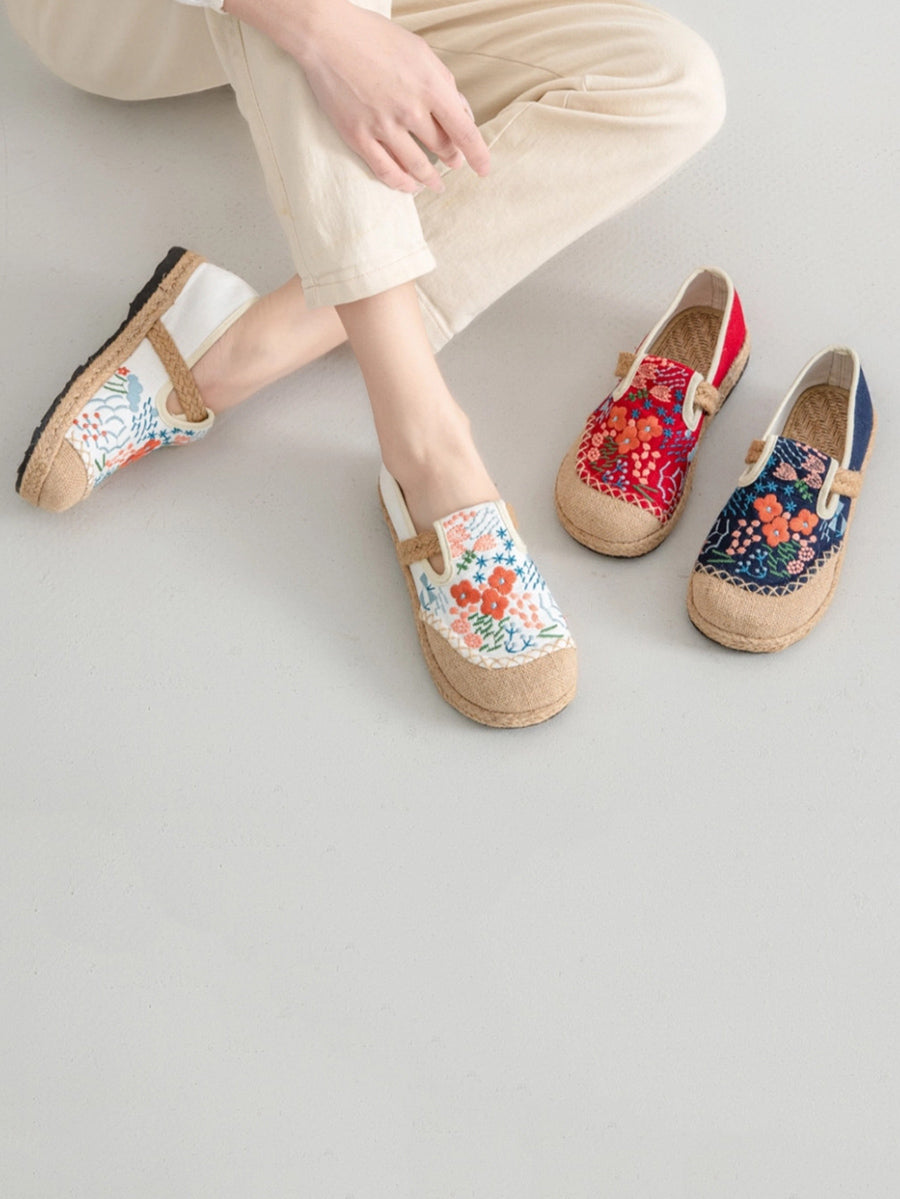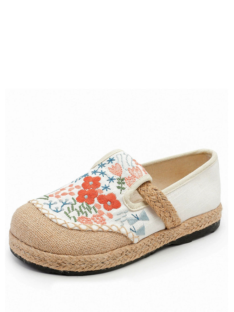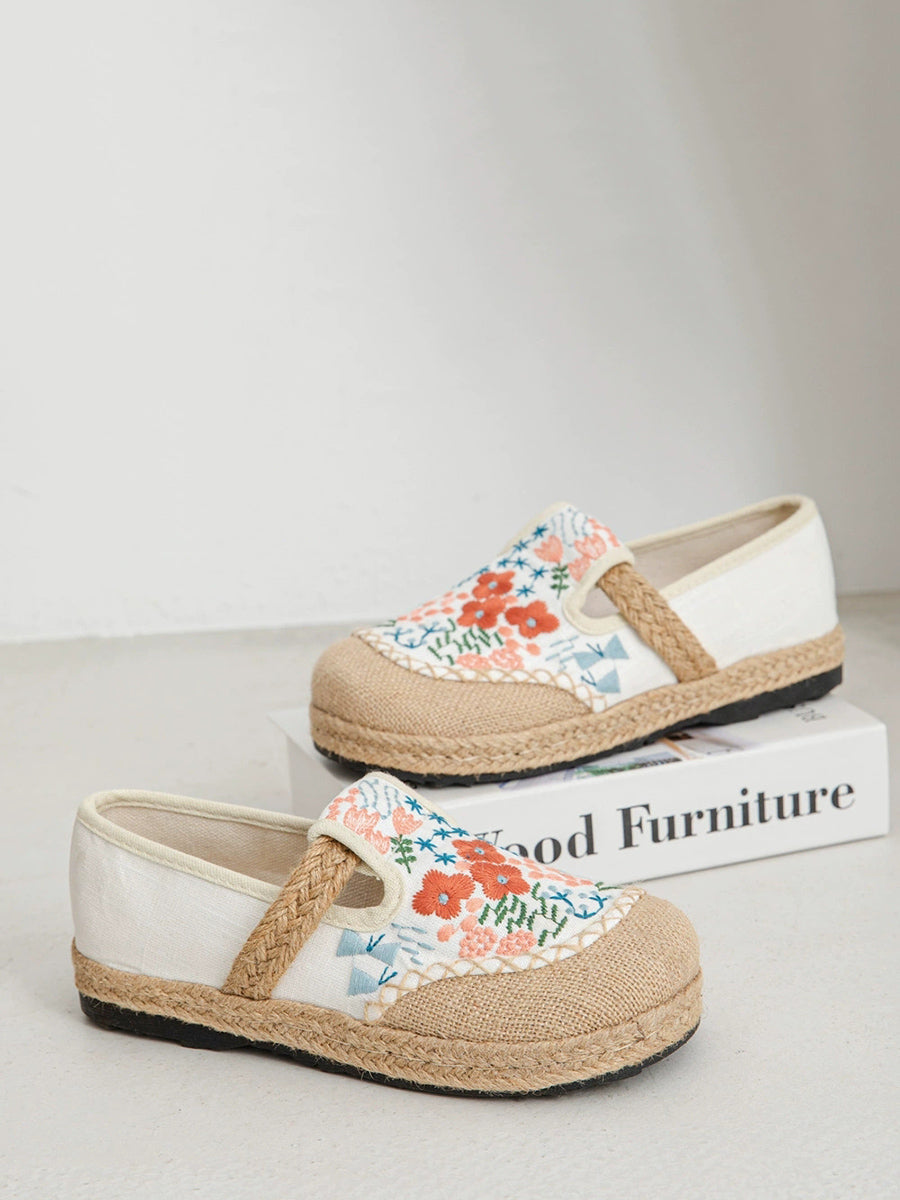 Sapatos femininos de verão em linho e lona com bordado étnico de flores