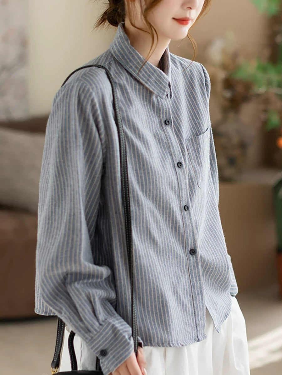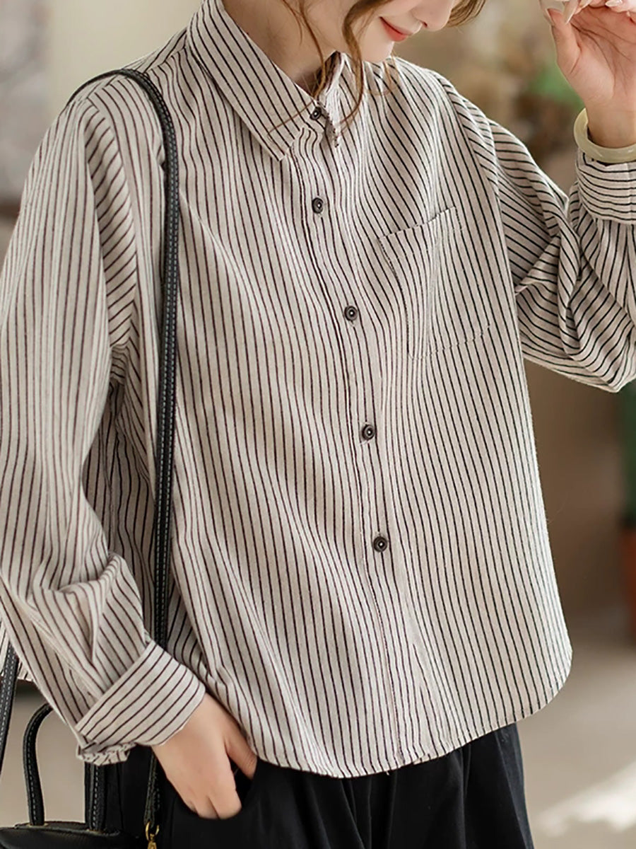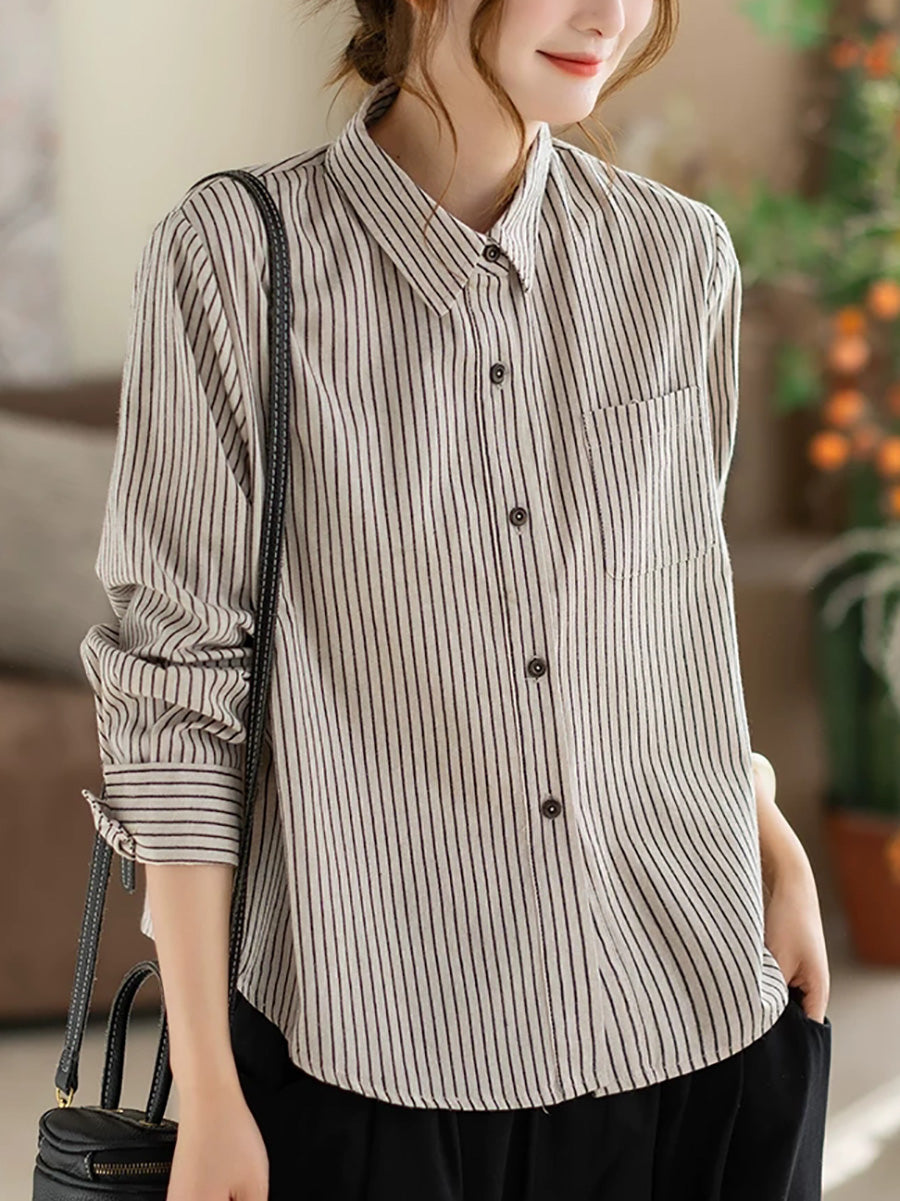 Camisa feminina de algodão listrada com estilo artístico para a primavera