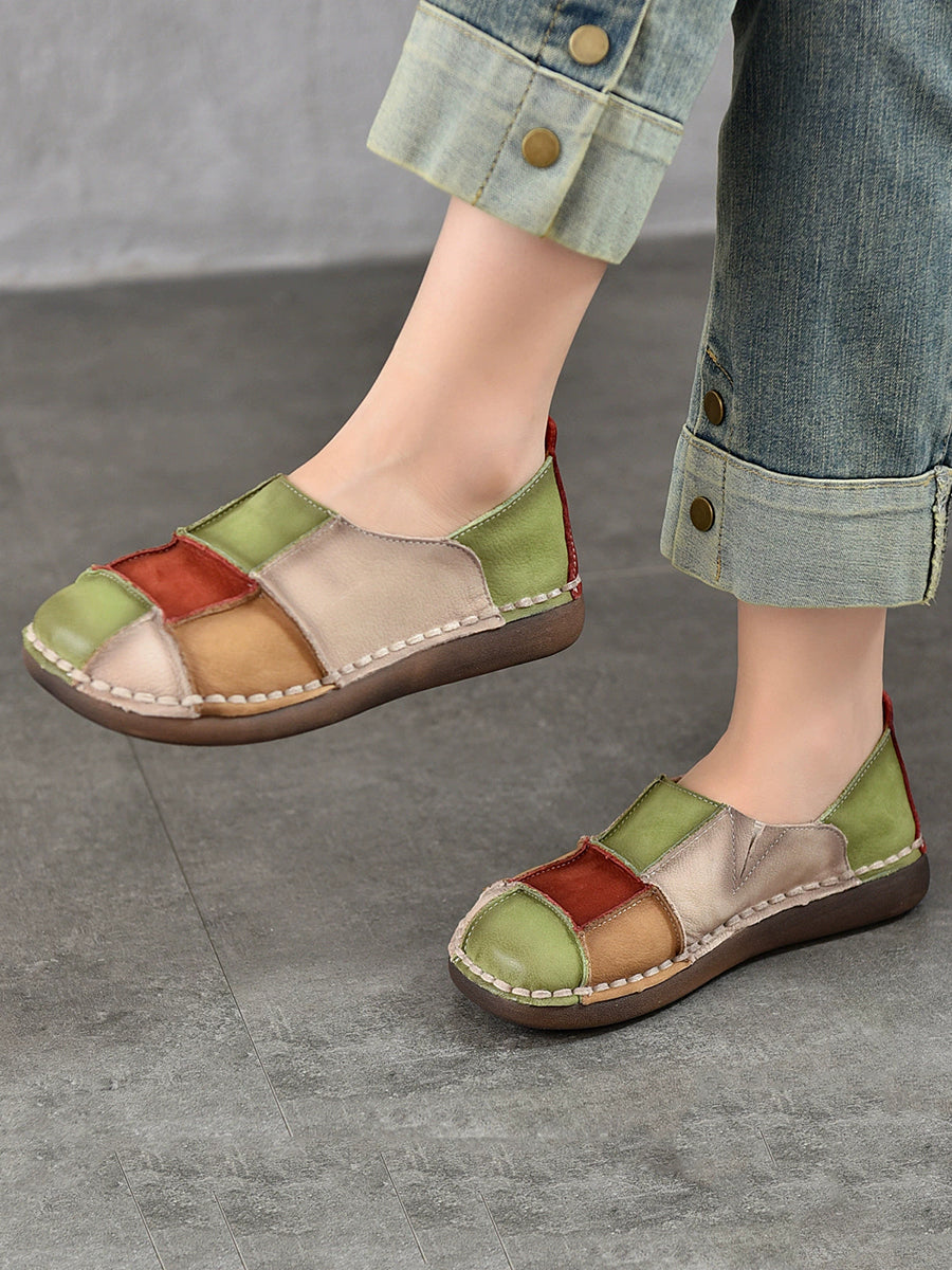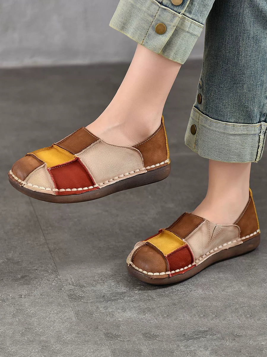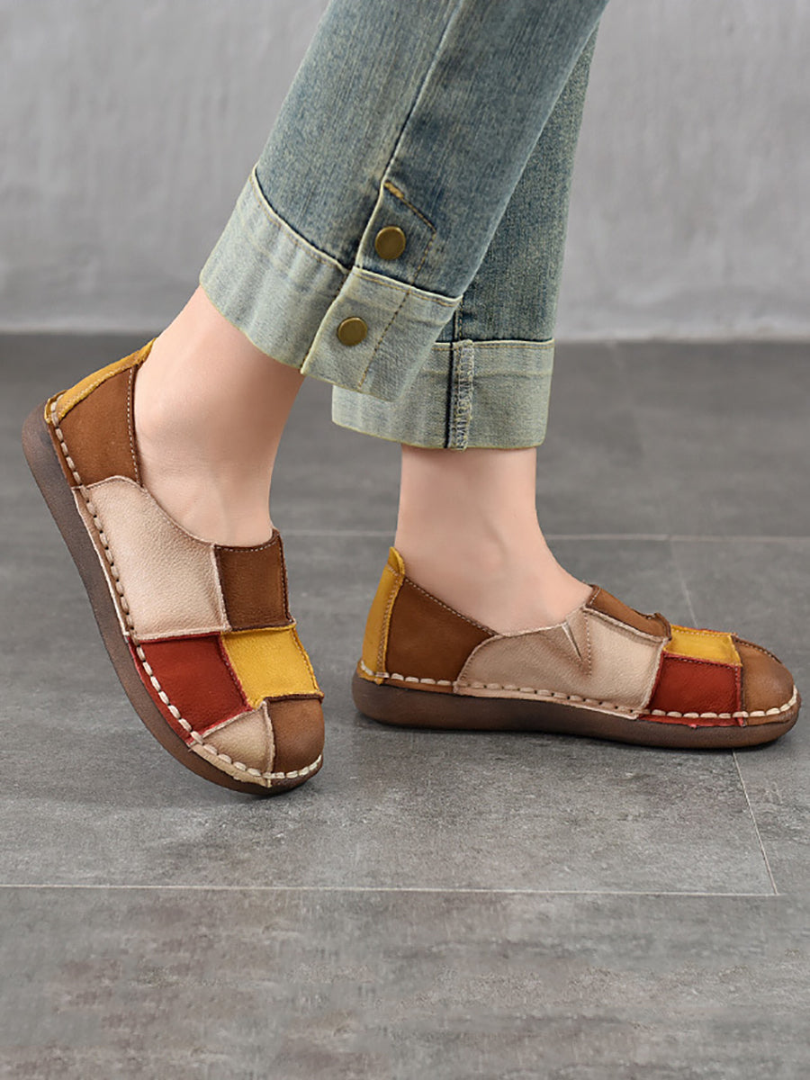 Sapatos femininos de primavera retrô em couro com blocos de cores