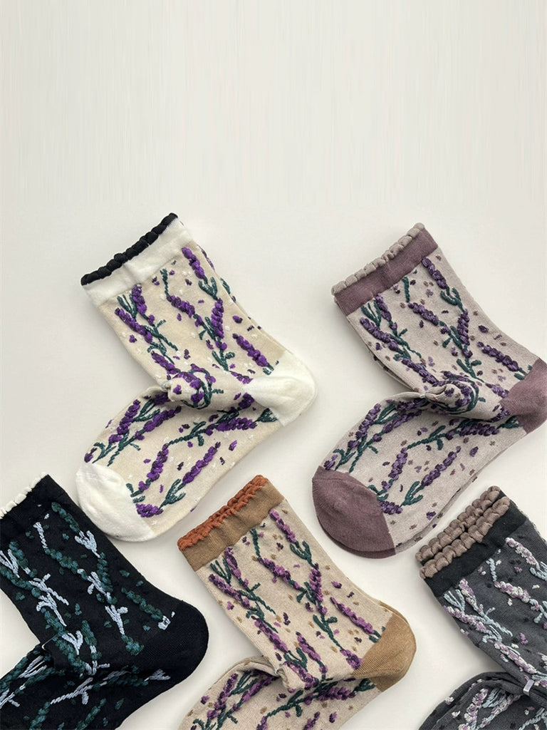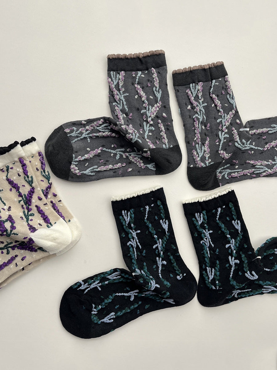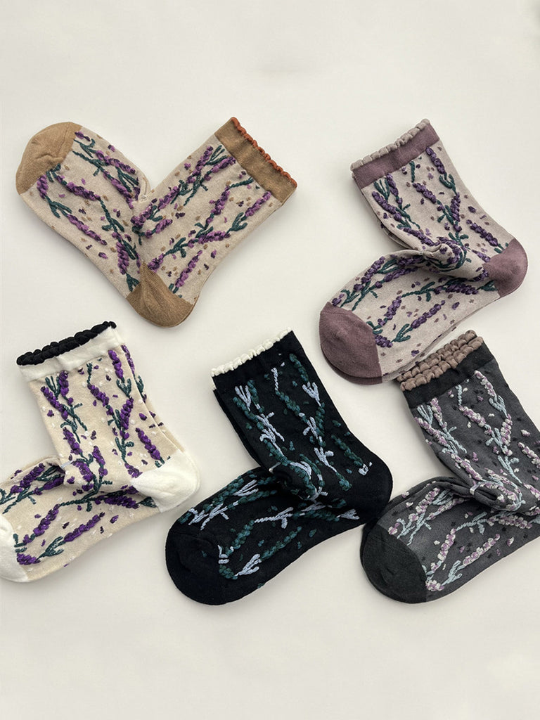 Conjunto de 5 pares de meias femininas de algodão jacquard com estampa floral para o inverno.