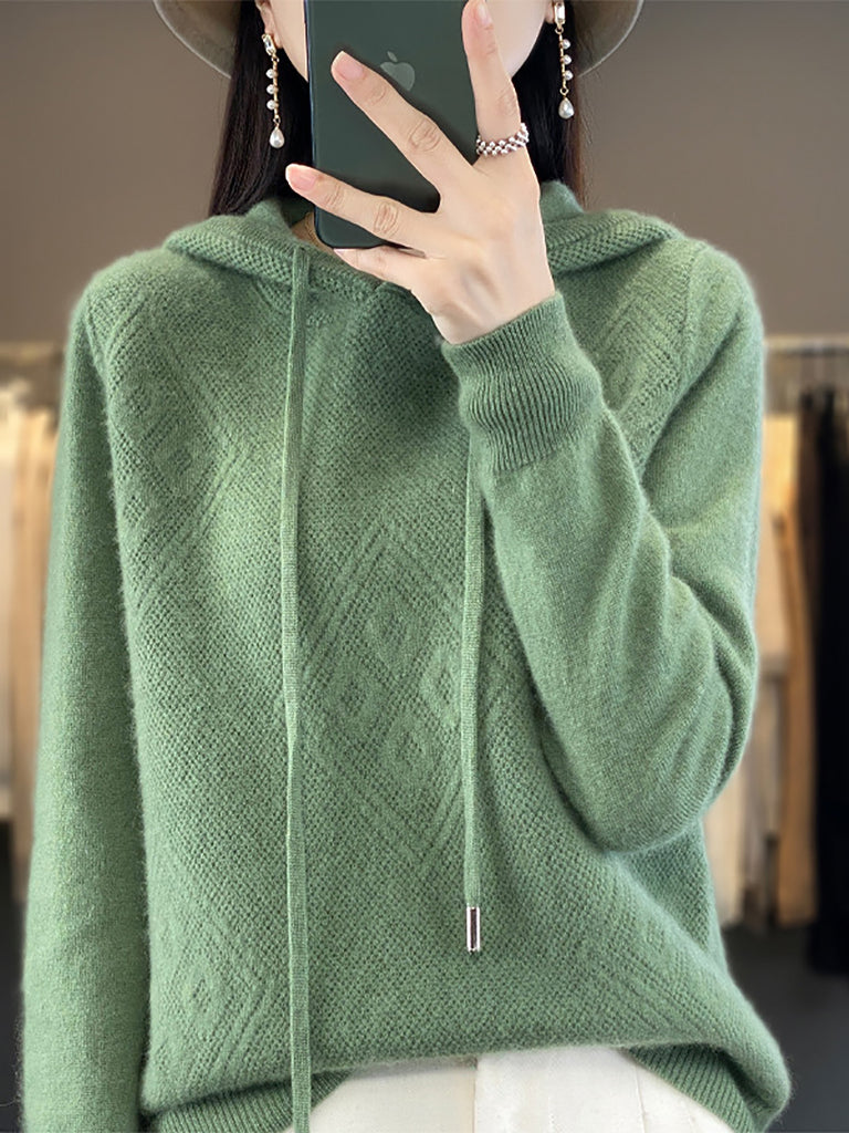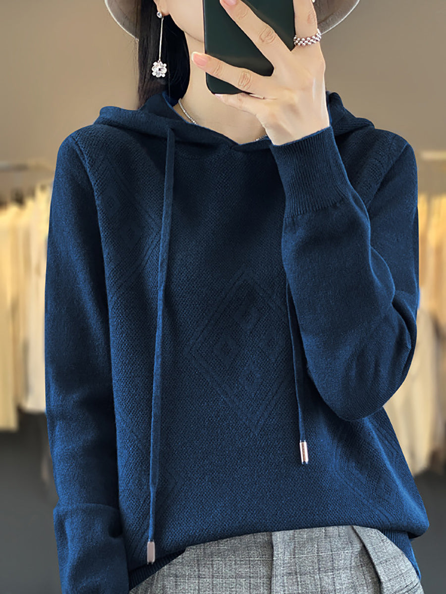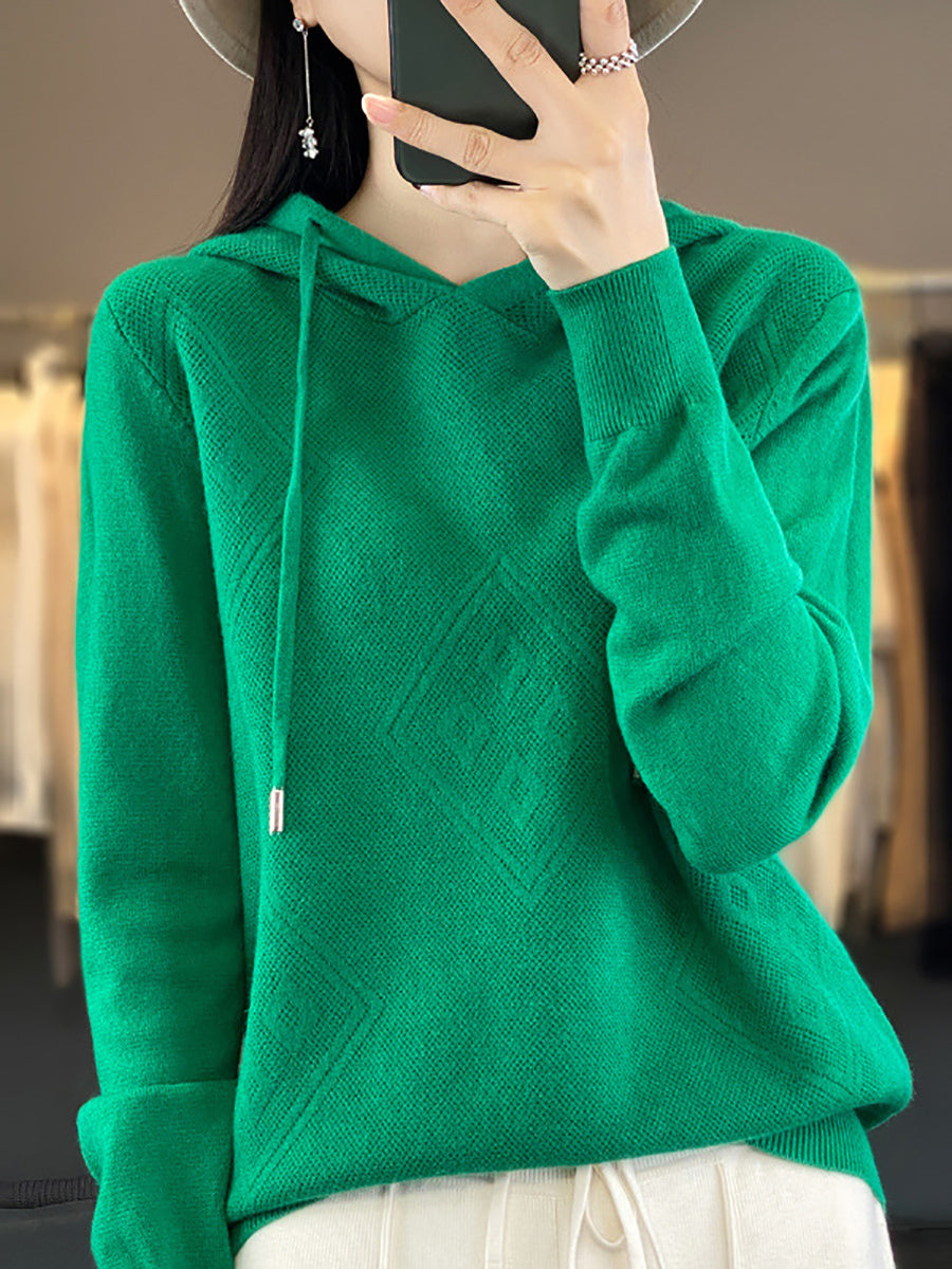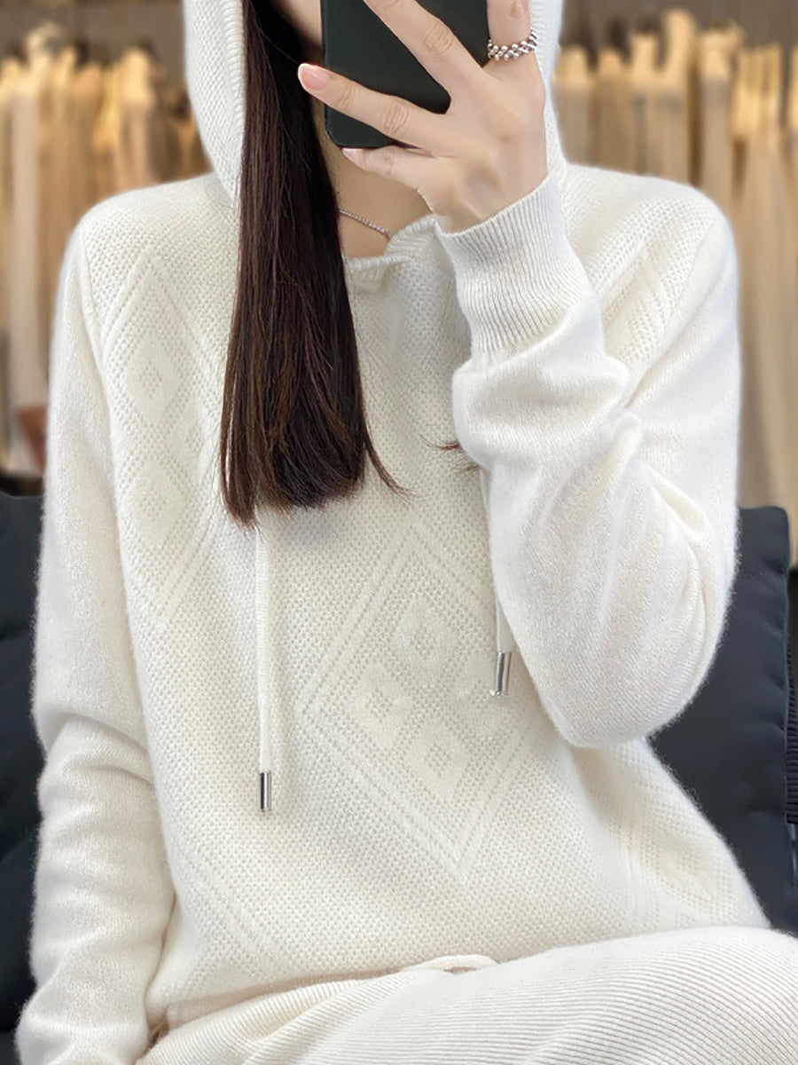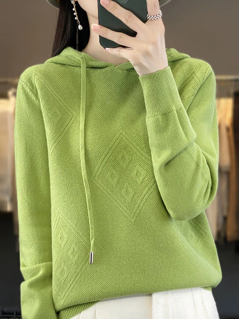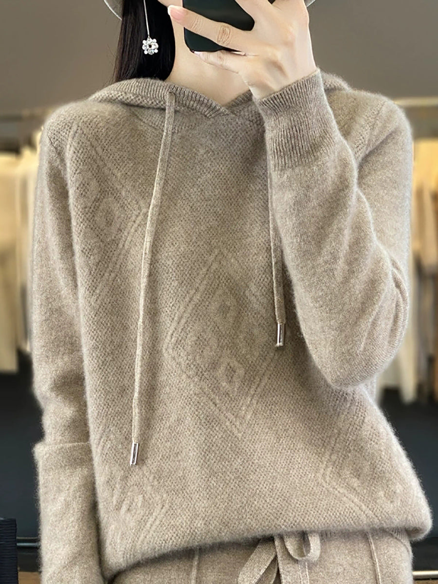 Suéter feminino de inverno com capuz e estampa de losangos em lã tricotada.