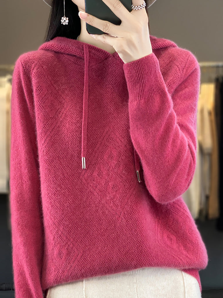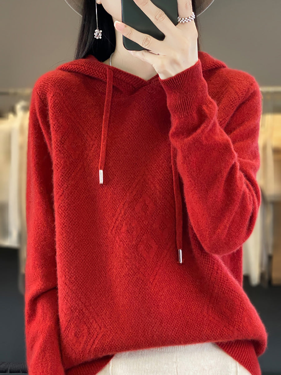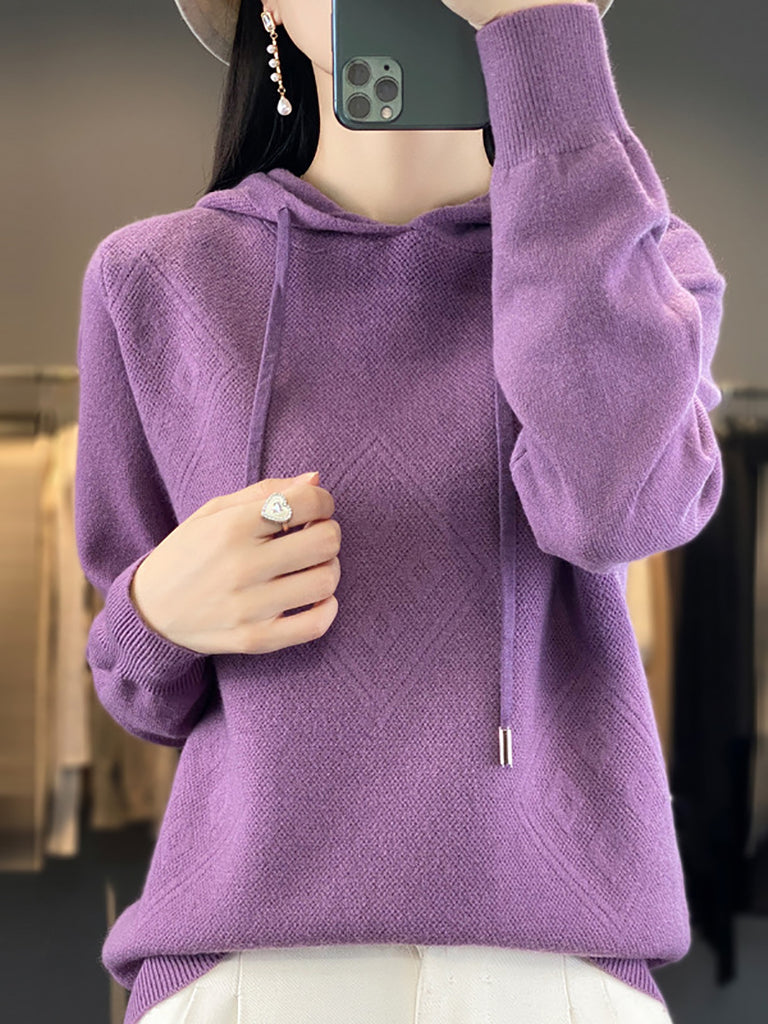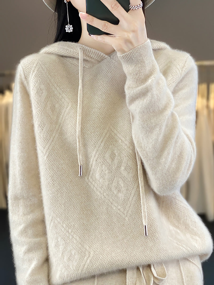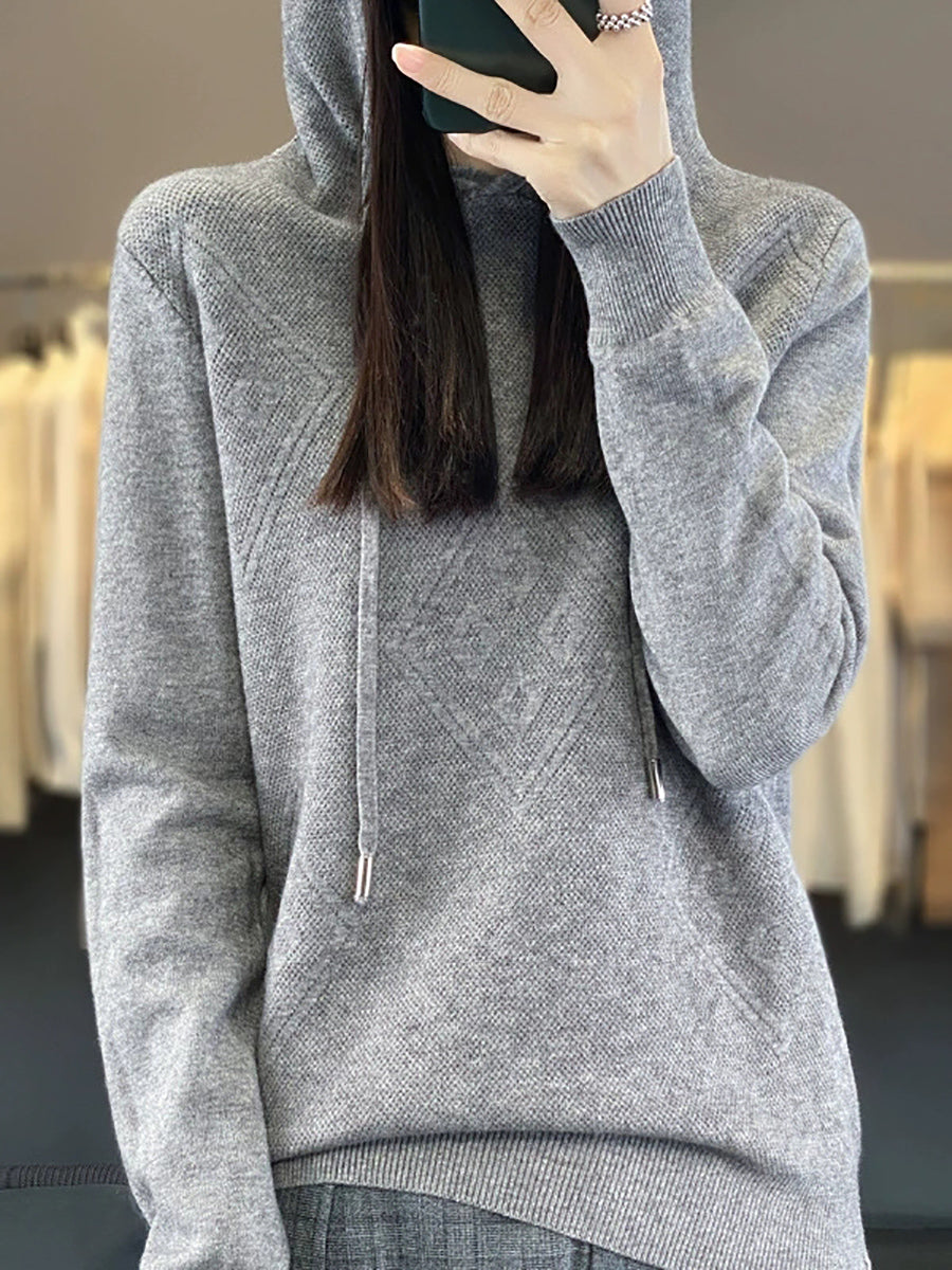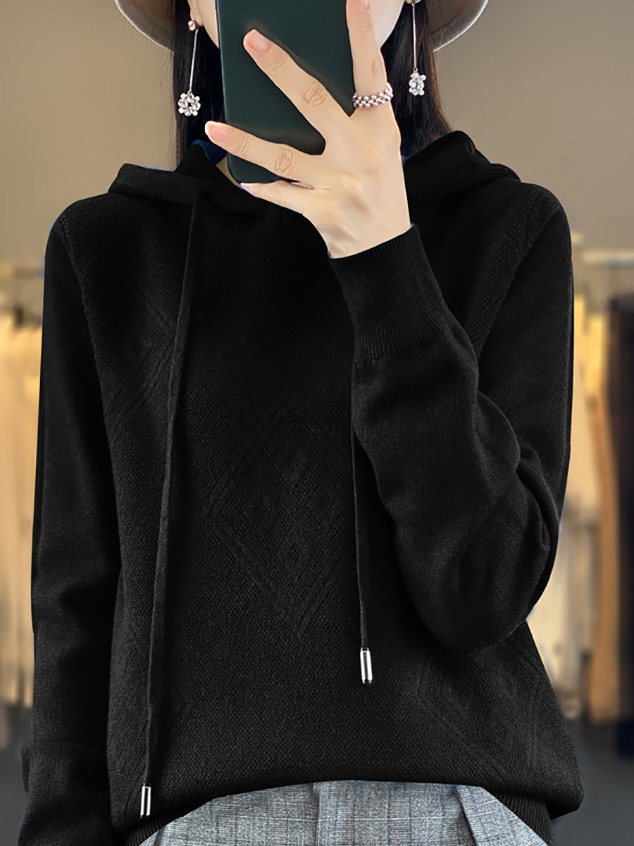 Suéter feminino de inverno com capuz e estampa de losangos em lã tricotada.