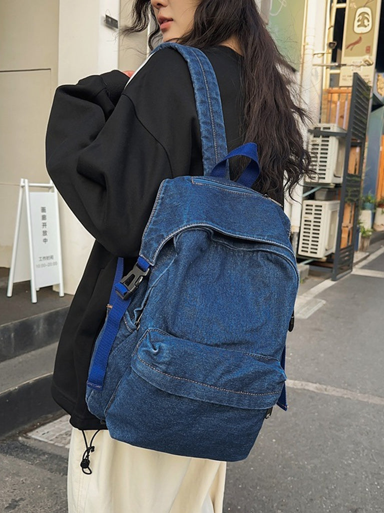 Women Vintage Pure Color Large Capacity Denim Backpack