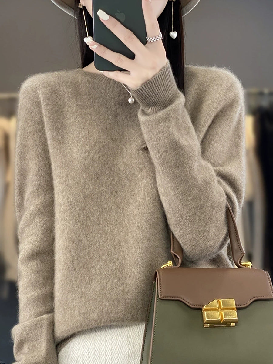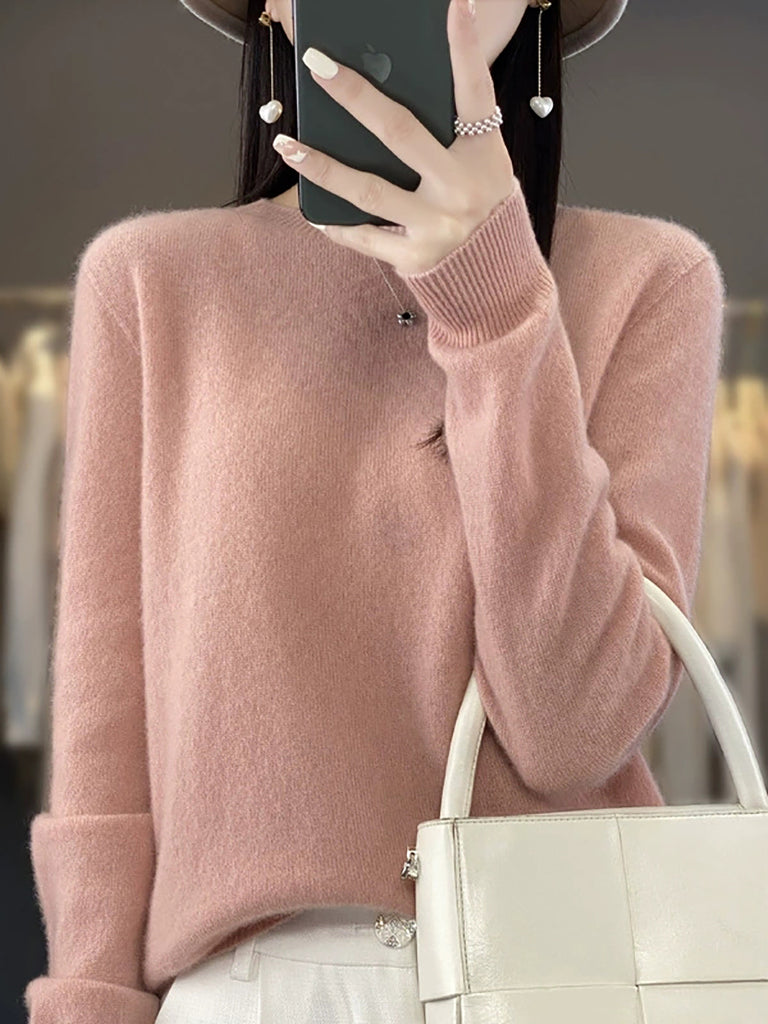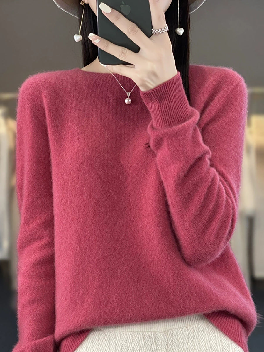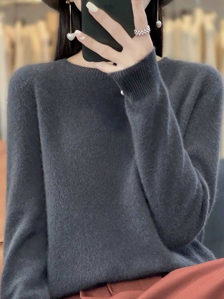 Suéter feminino de lã com gola redonda, cor lisa, estilo casual de inverno.