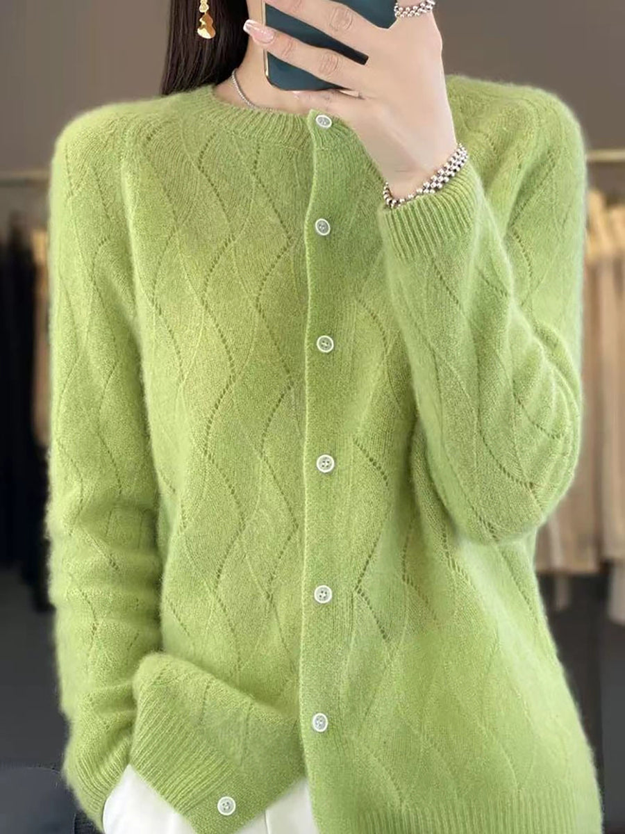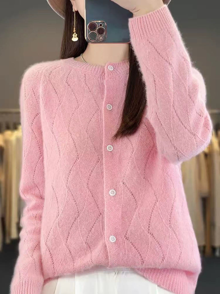Cardigã feminino de inverno em tricô, cor lisa, gola redonda.