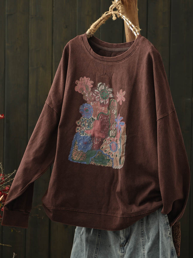 Camisa feminina de outono com estampa floral artística e gola redonda 100% algodão