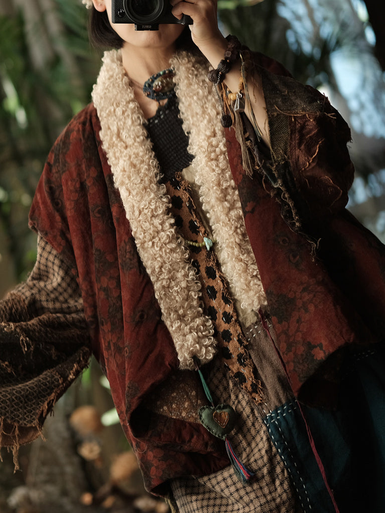 Colete acolchoado feminino de inverno vintage com estampa floral e detalhes em fleece.