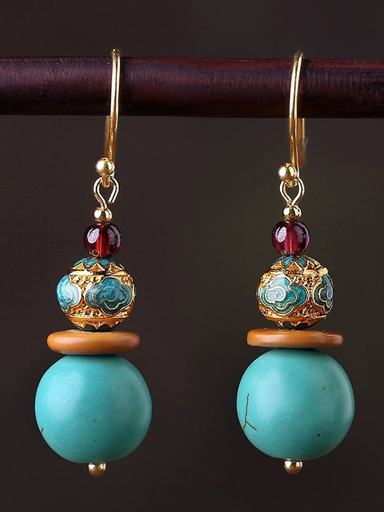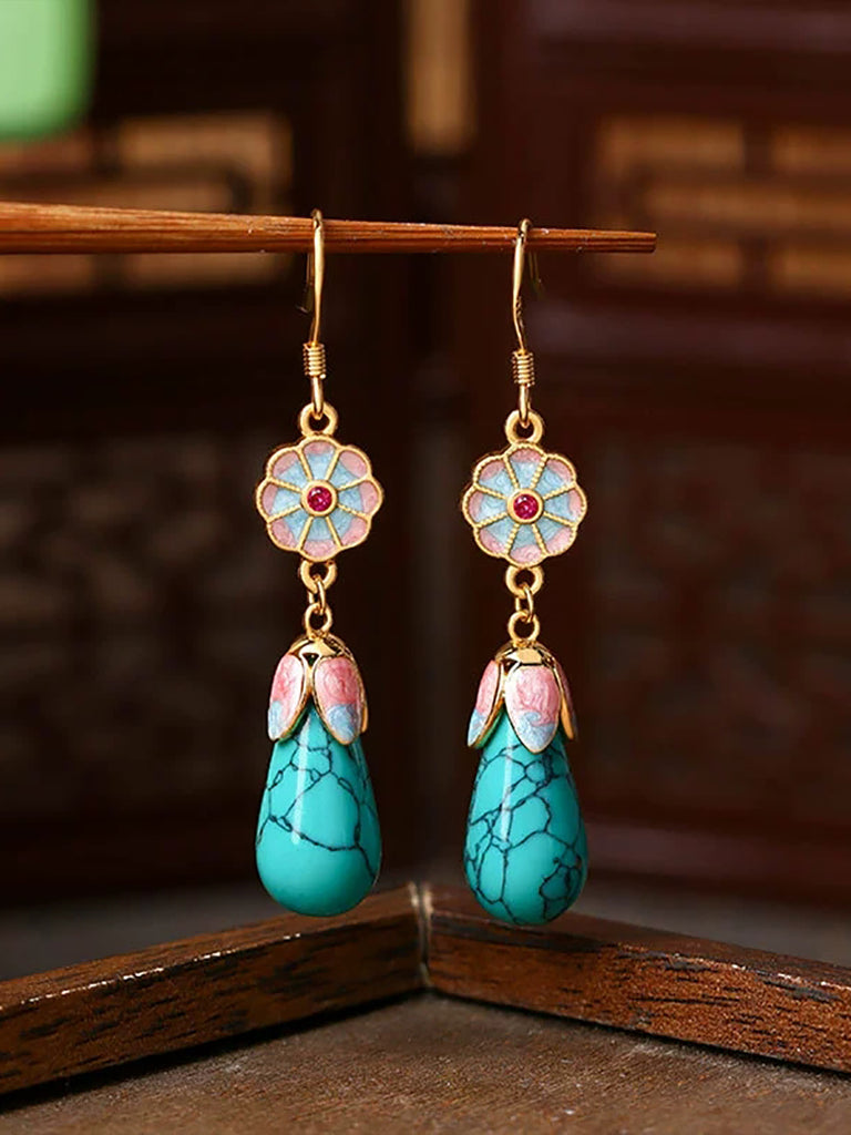 Brincos femininos de turquesa cloisonné S925 banhados a prata