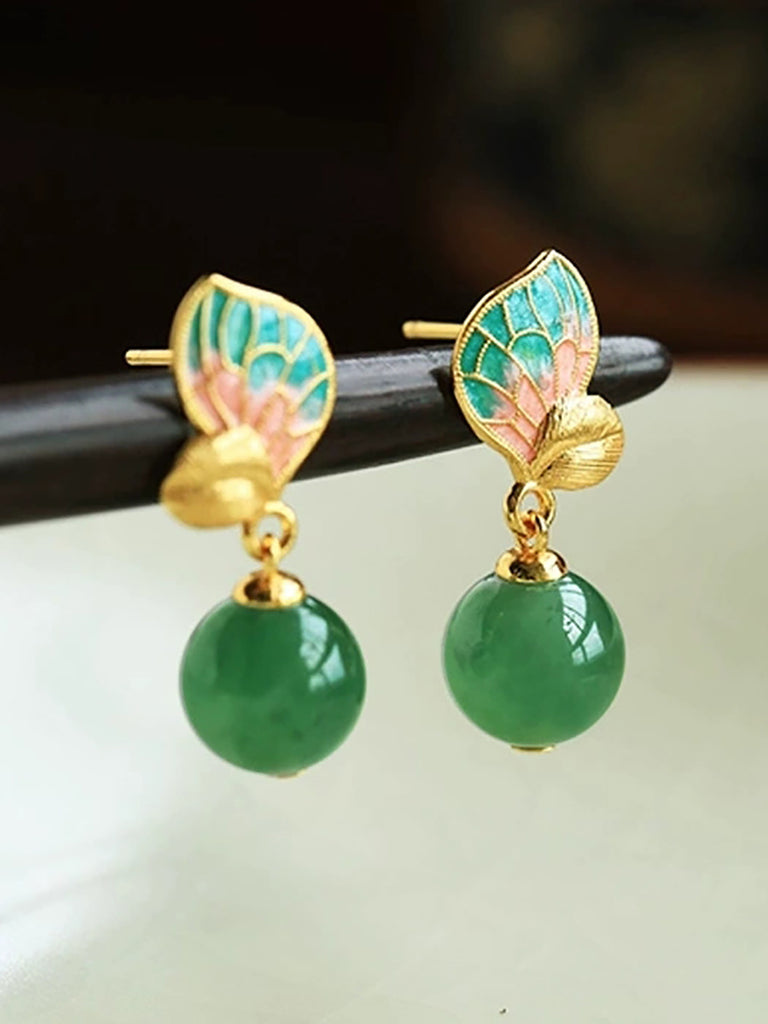Brincos femininos vintage de jade cloisonné em liga metálica