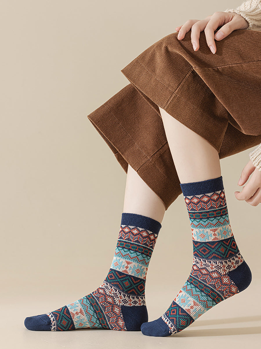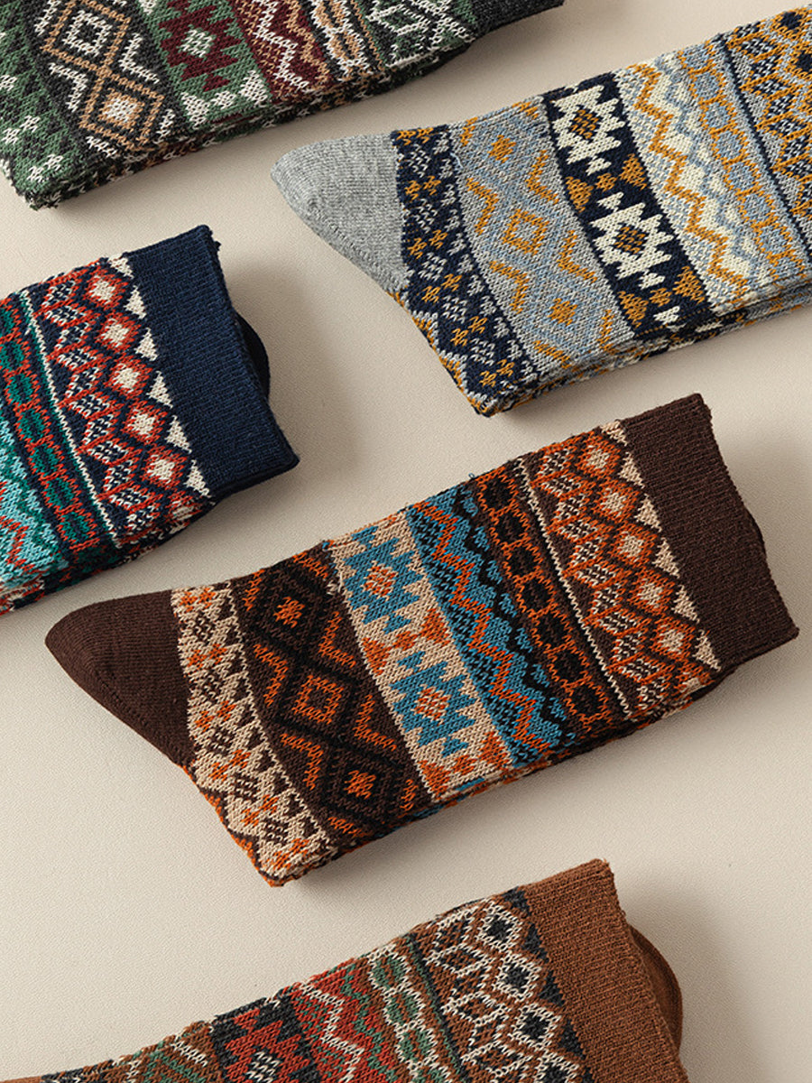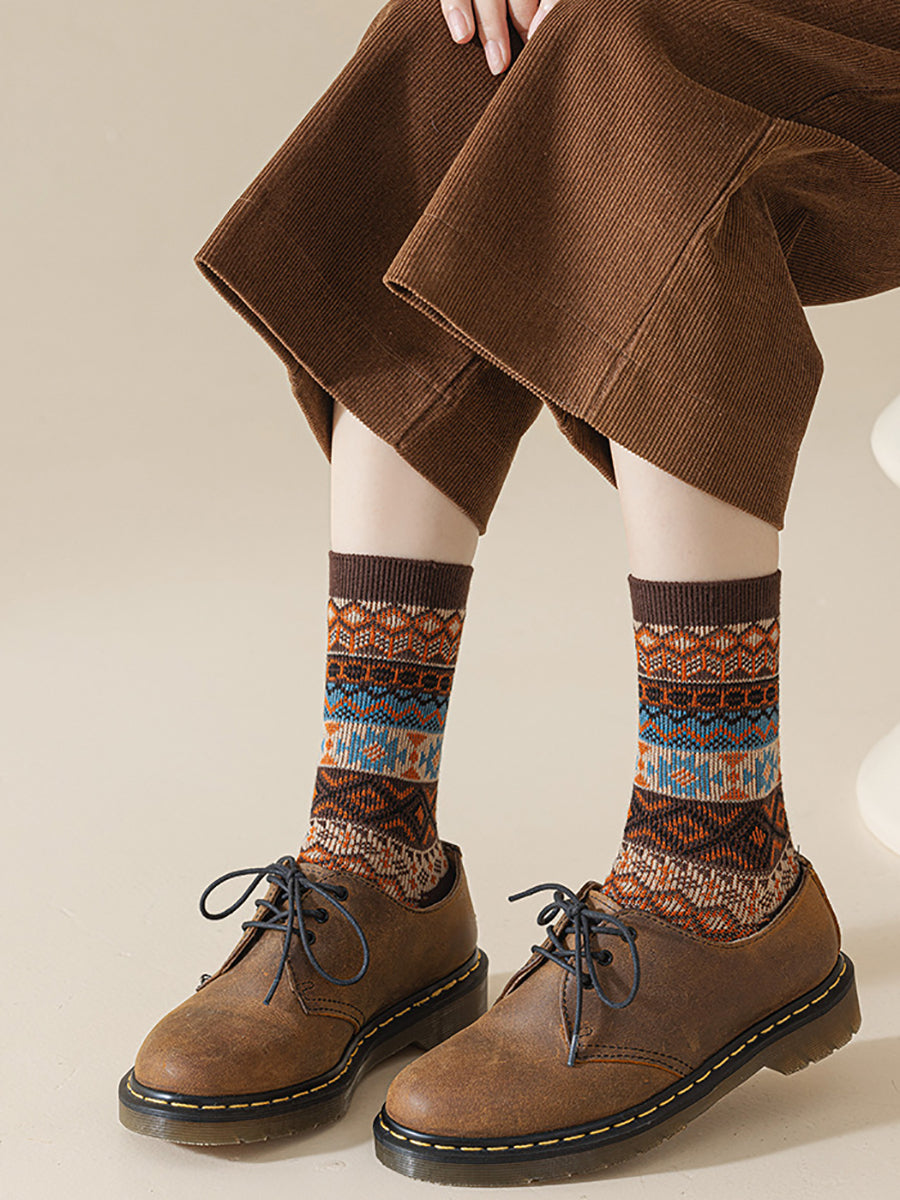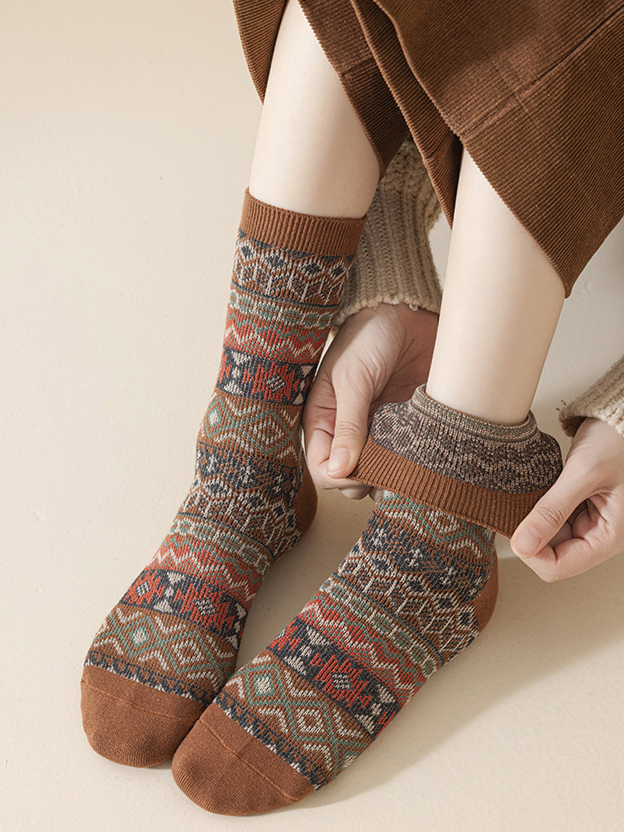 5 pares de meias de inverno com estampa étnica de flores e salto médio