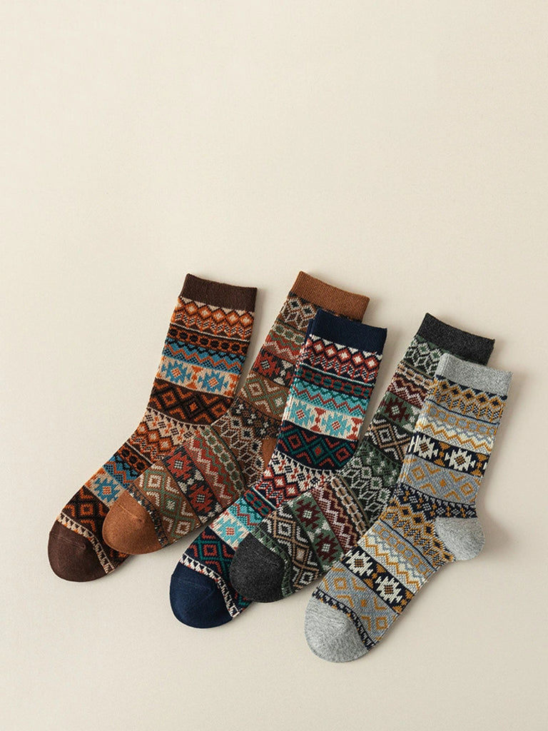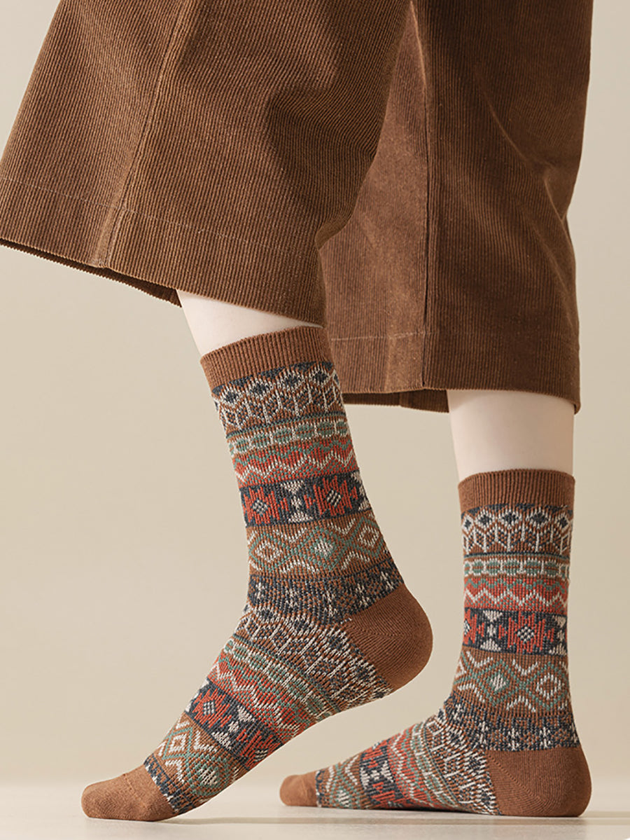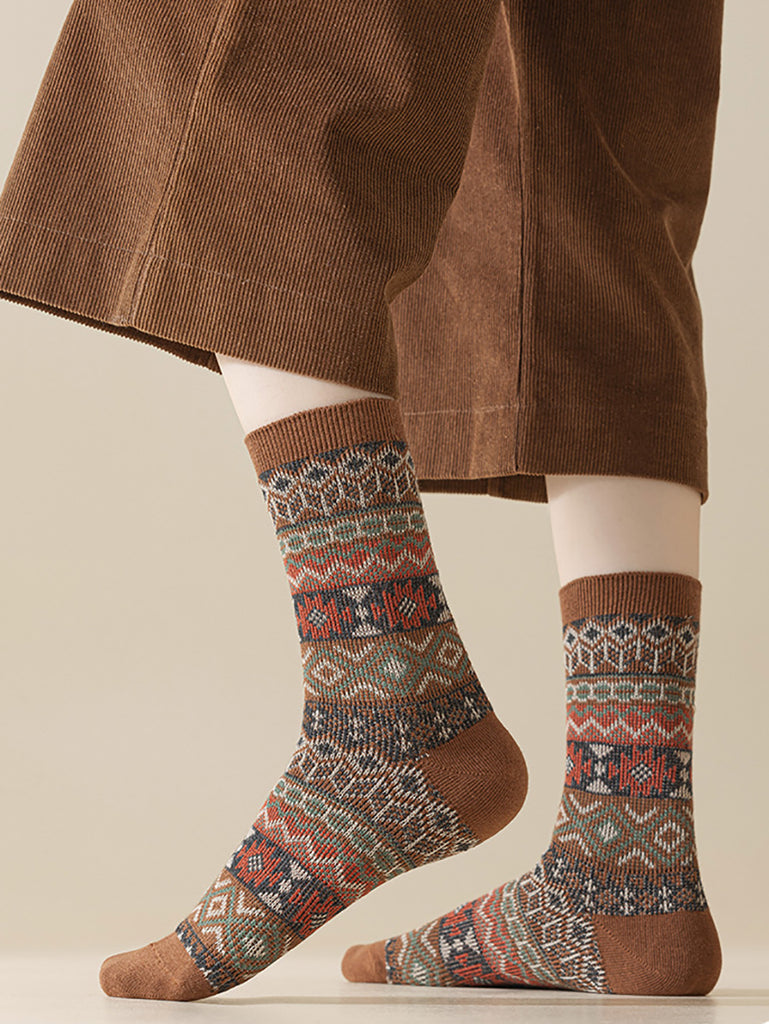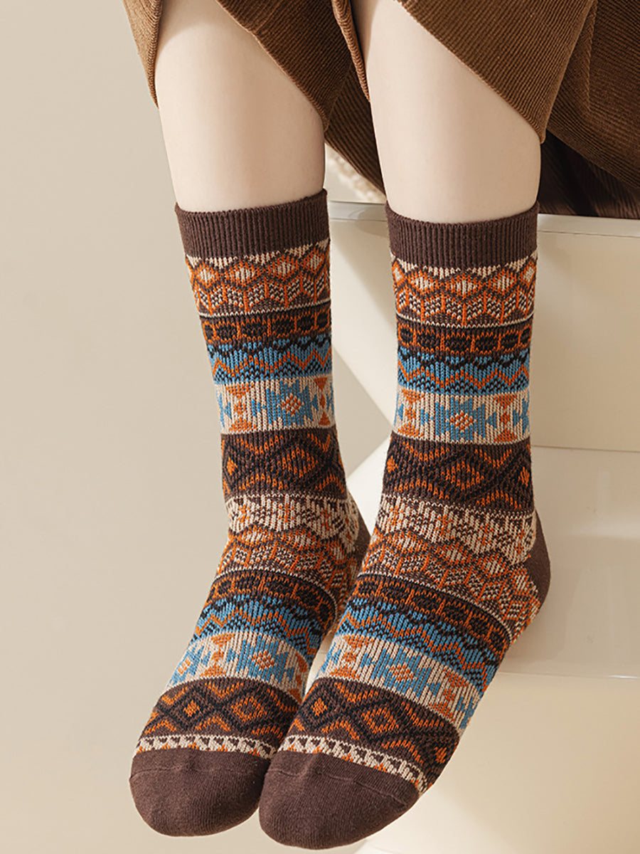 5 pares de meias de inverno com estampa étnica de flores e salto médio