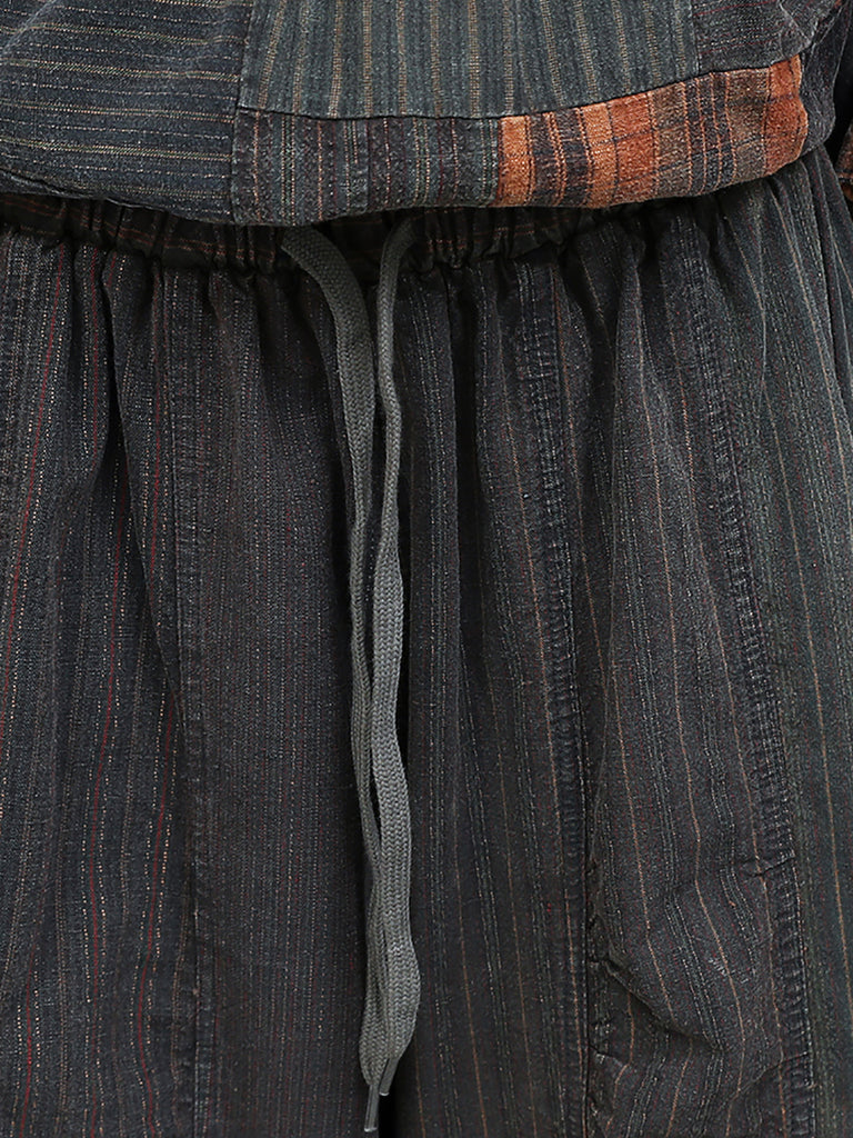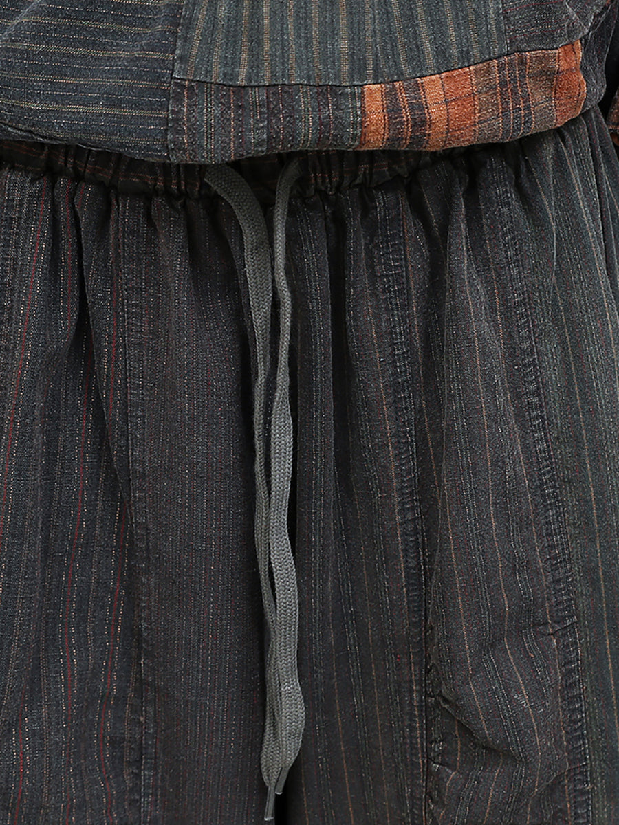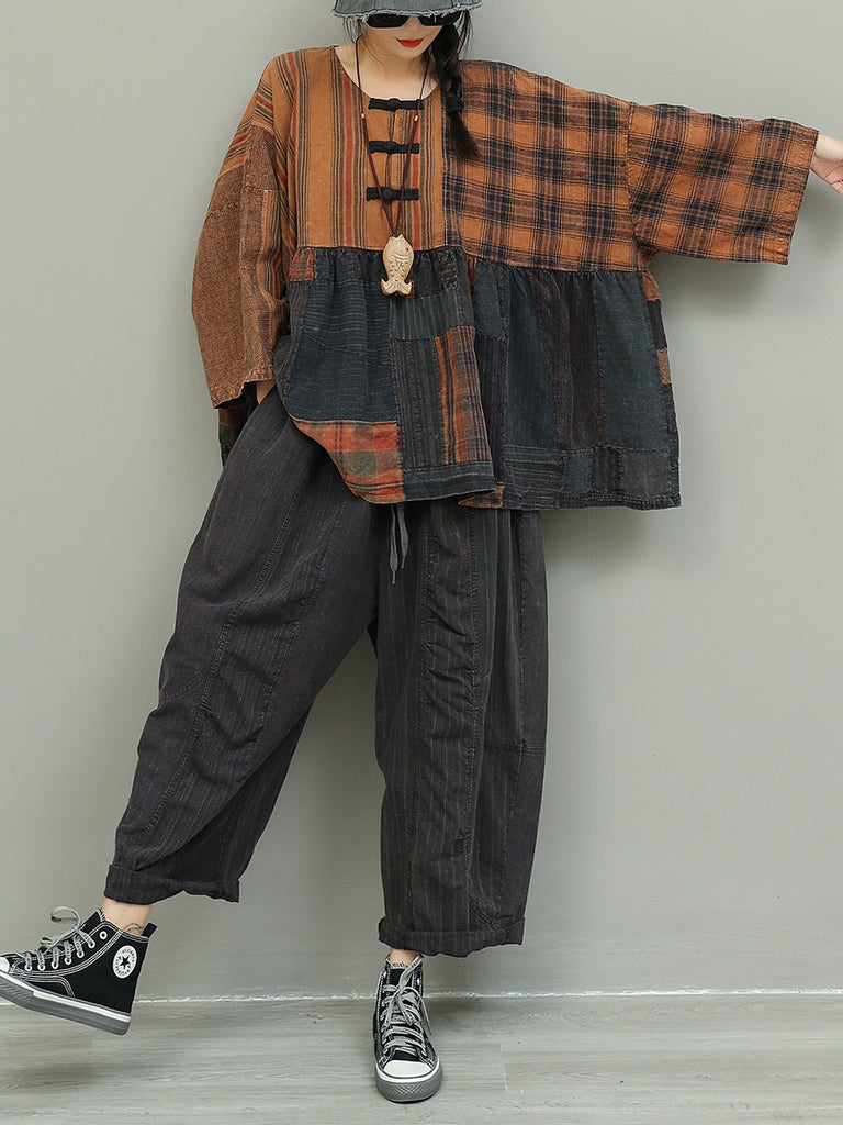 Terno feminino de algodão solto com patchwork retrô e gola redonda para outono