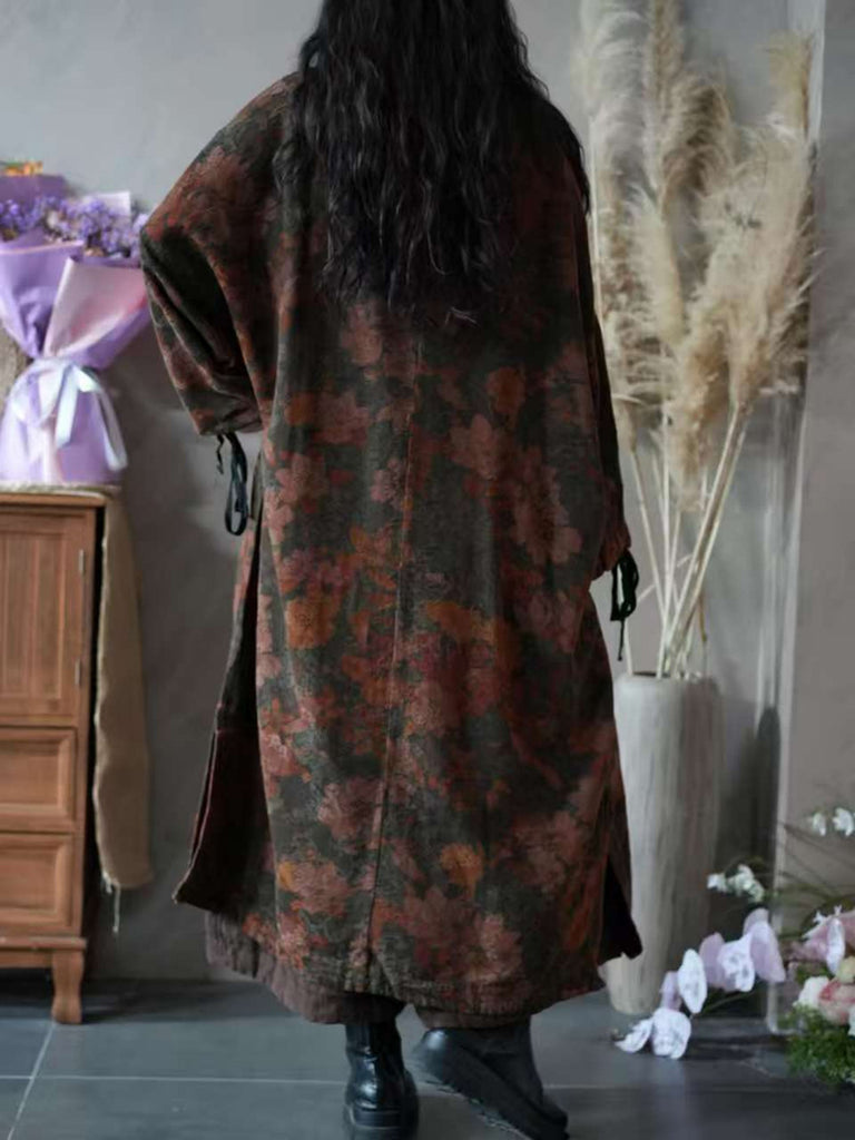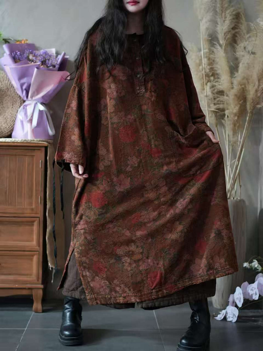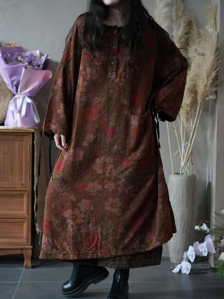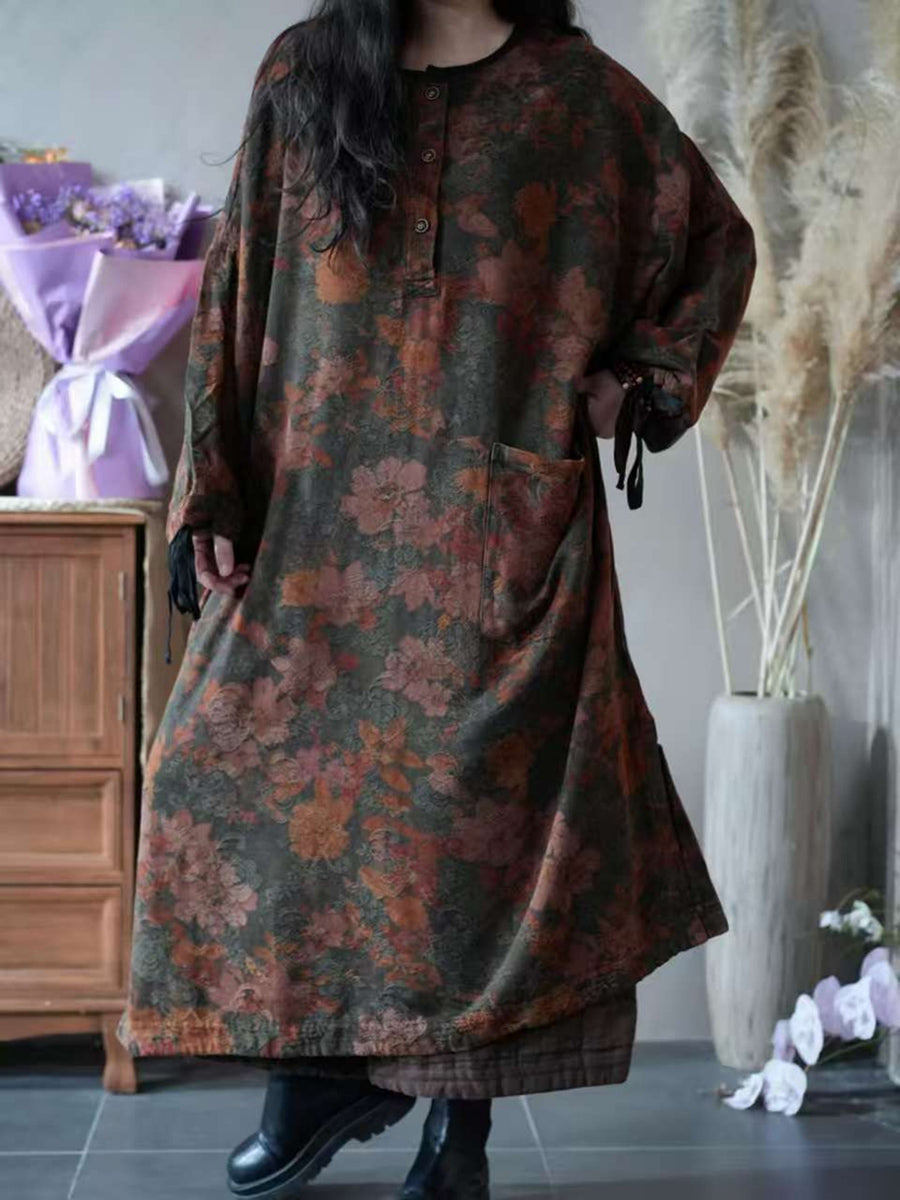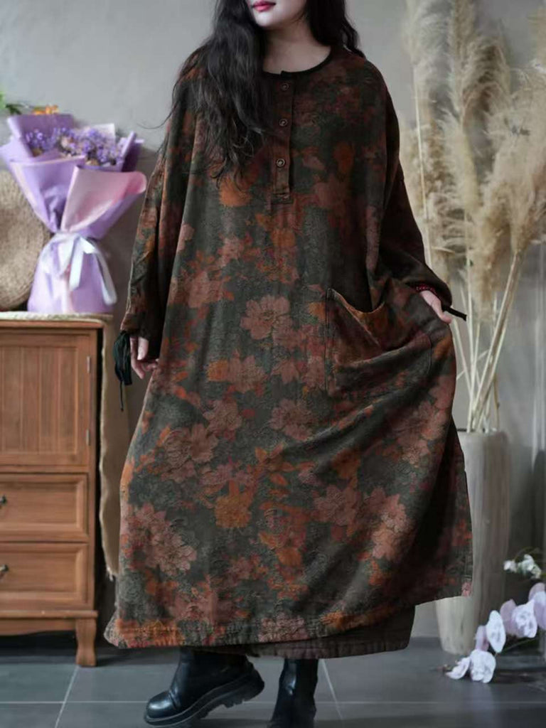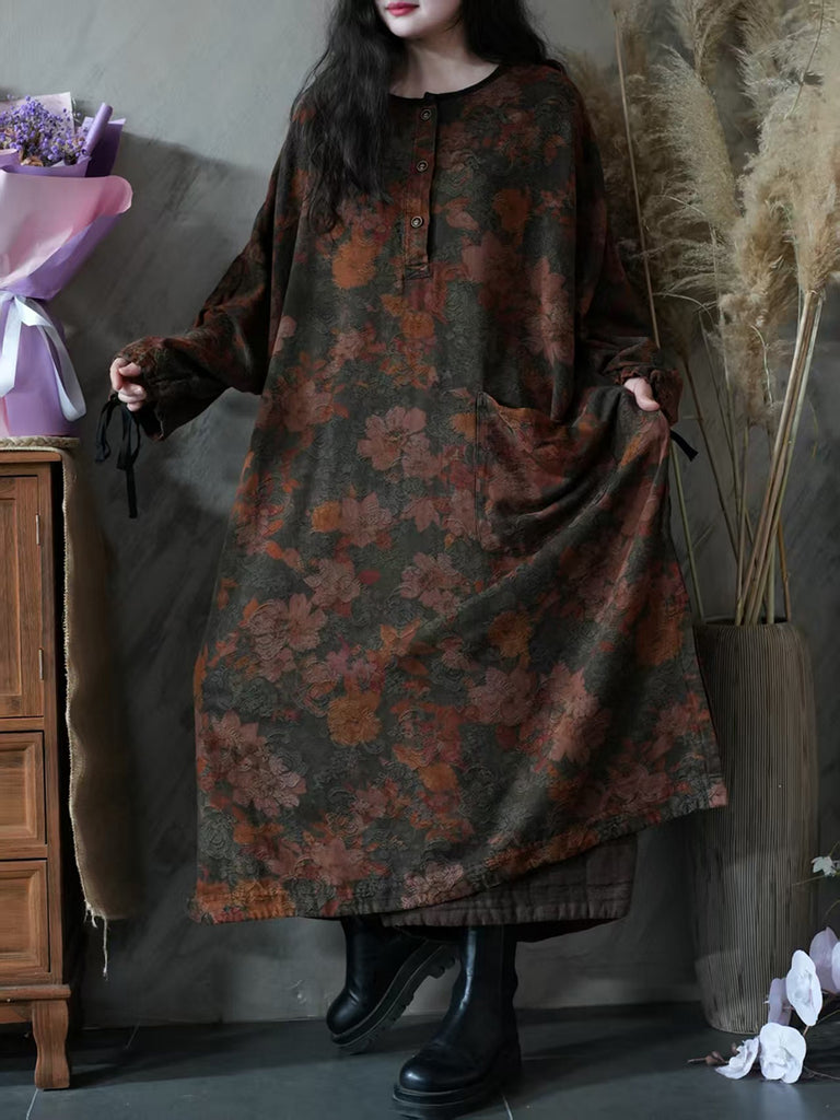 Vestido feminino vintage de outono com estampa floral e decote redondo