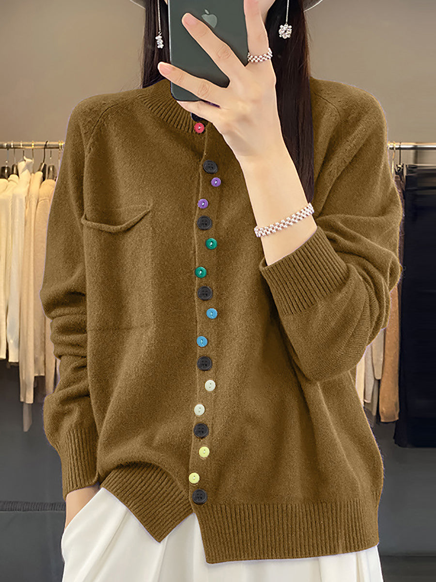 Suéter de malha de cor pura com gola redonda de lã feminina outono