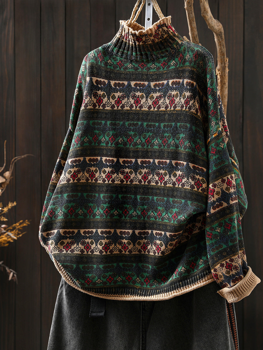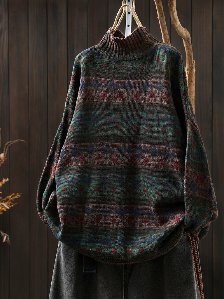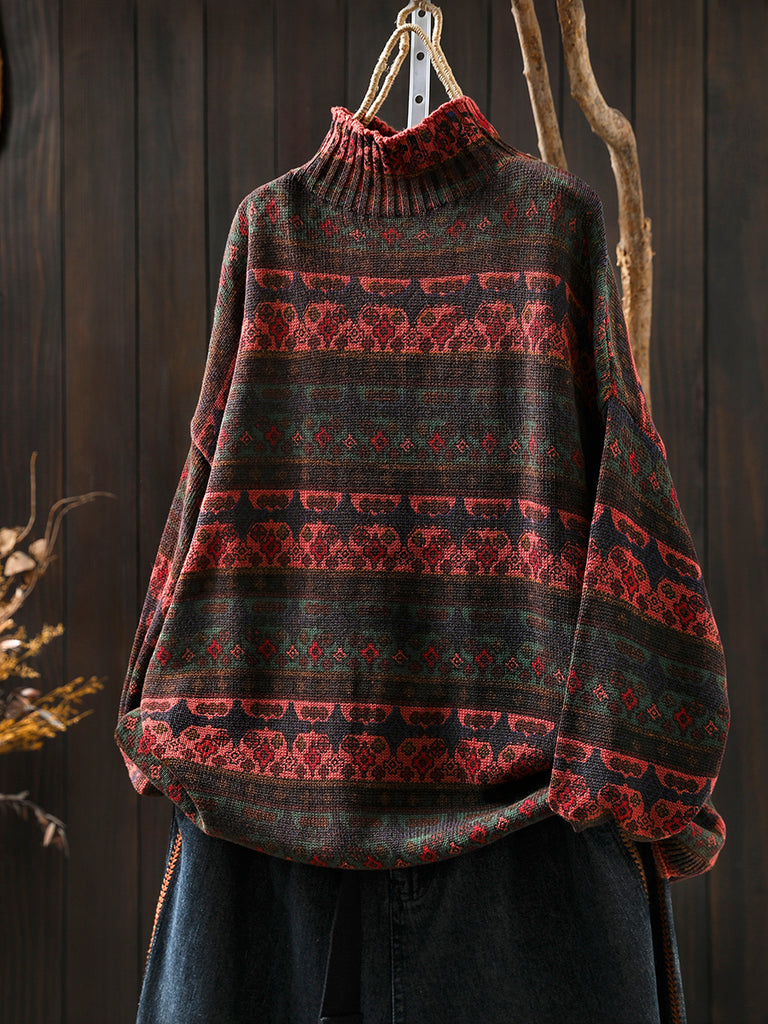 Suéter feminino vintage de algodão com listras e gola alta.