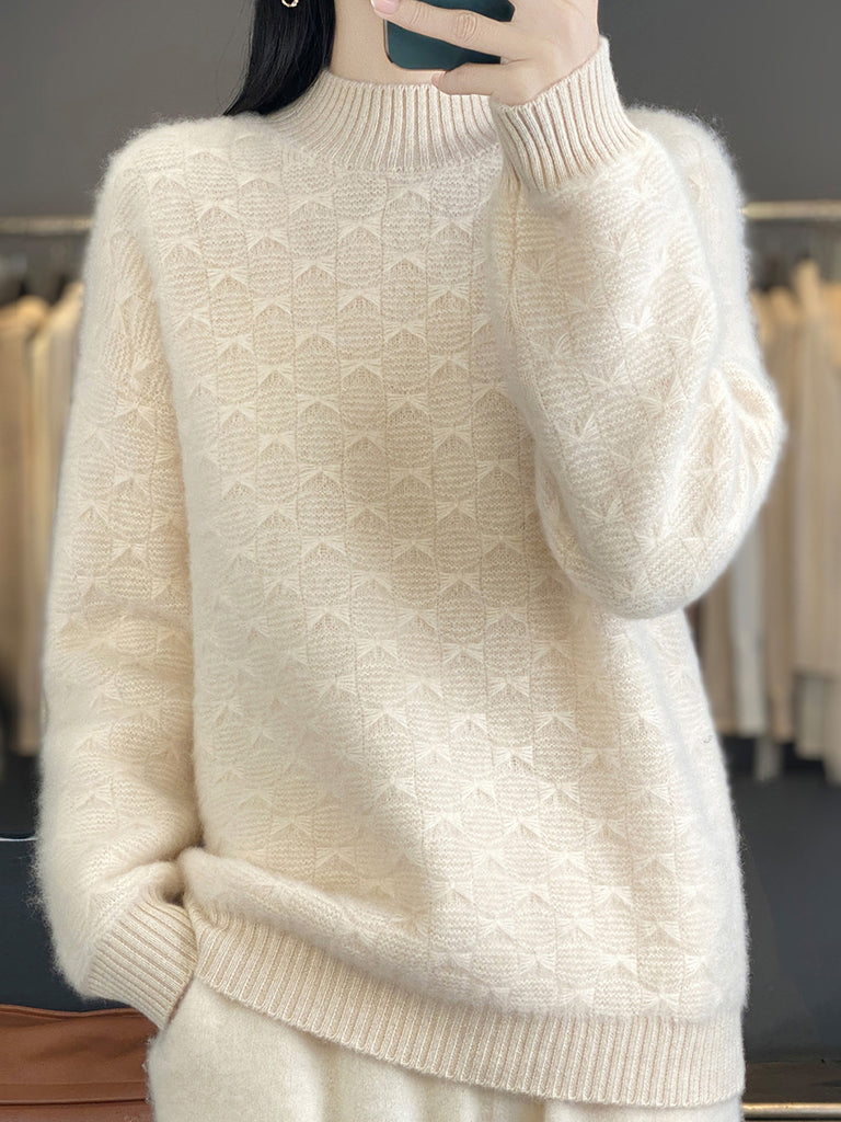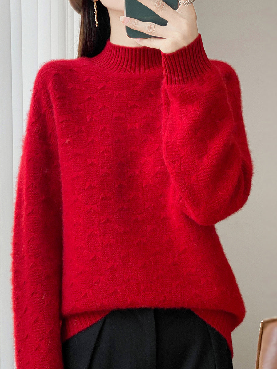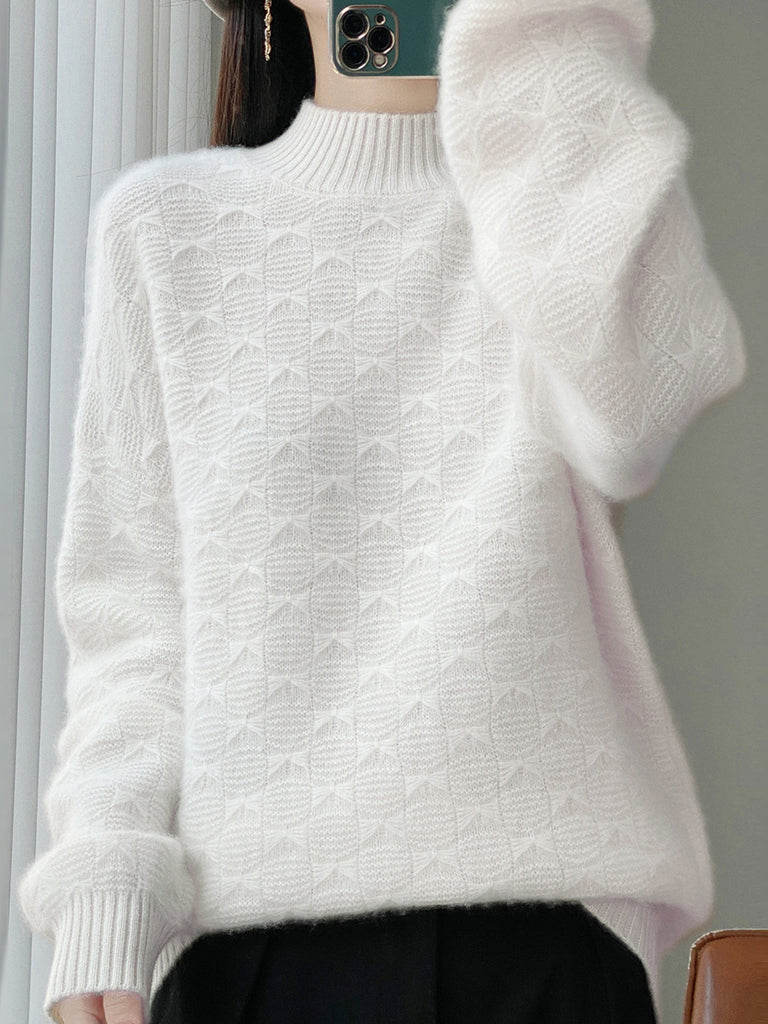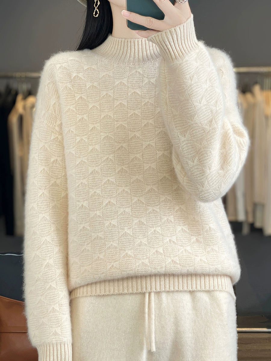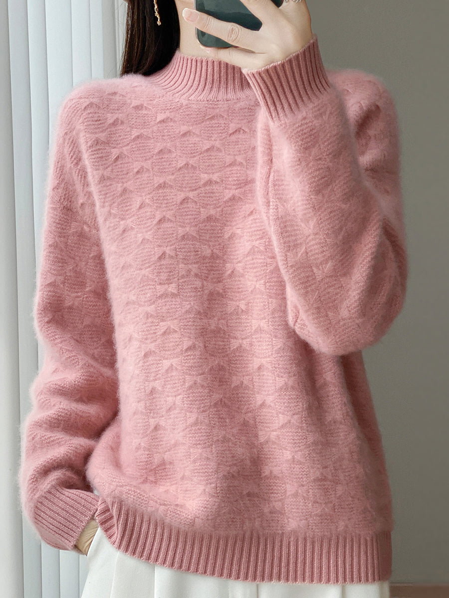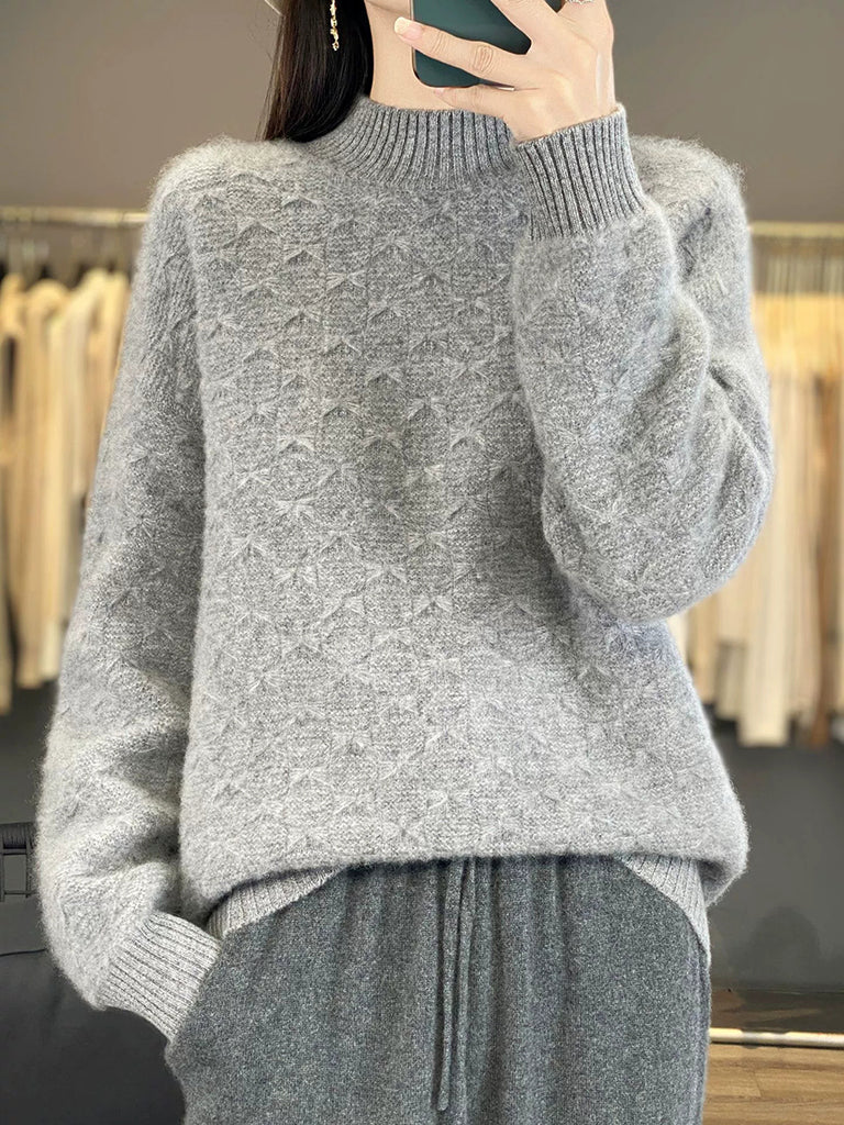 Suéter feminino de inverno de gola alta com laço em tricô, cor lisa.