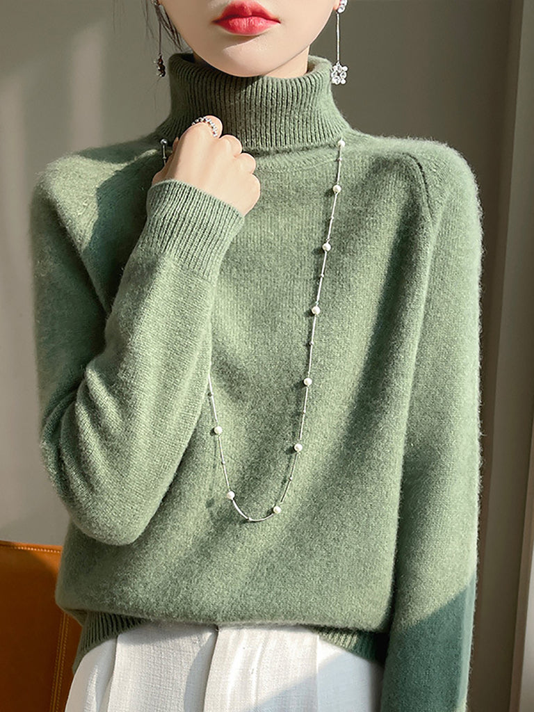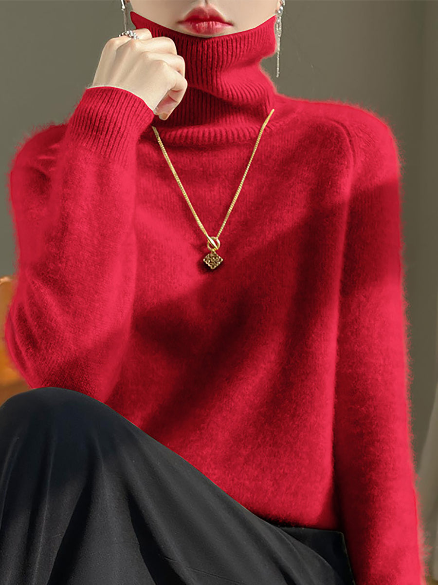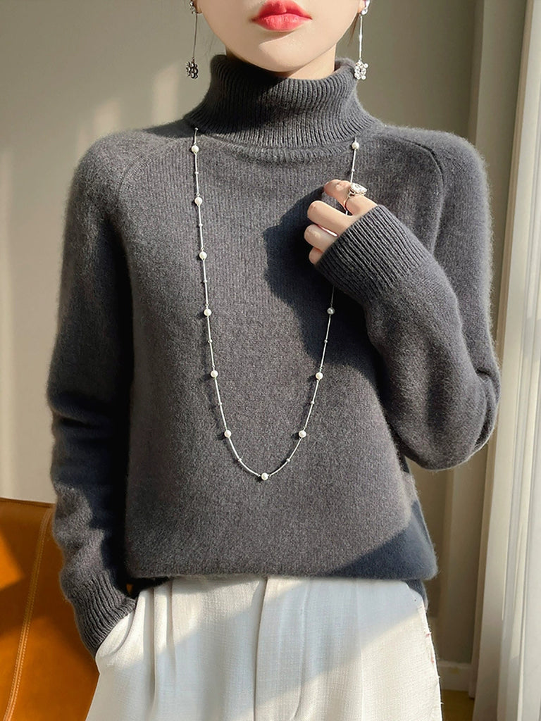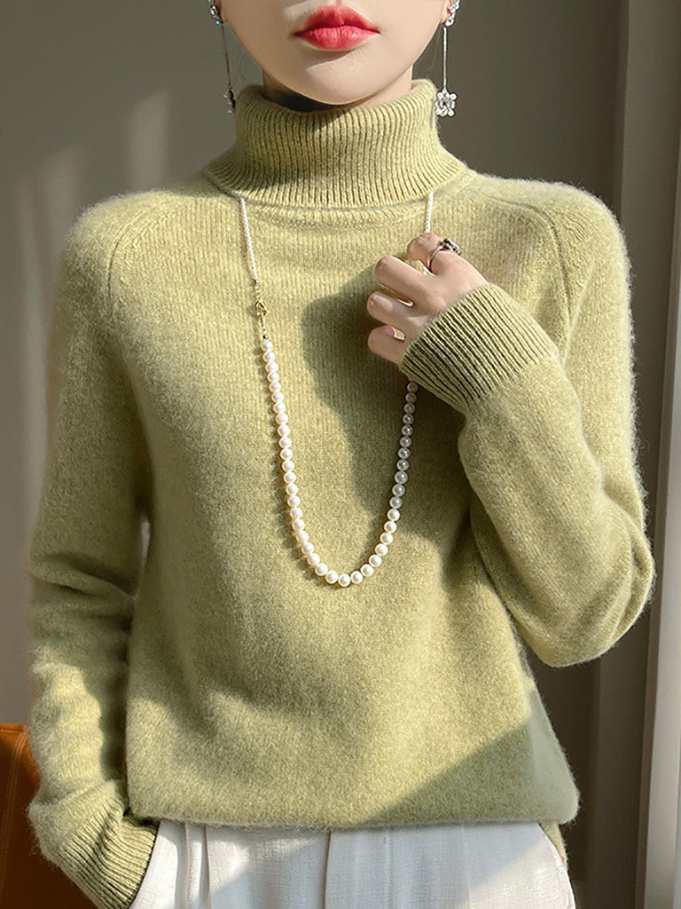 Suéter feminino de gola alta de cor lisa, 100% lã, para o inverno.