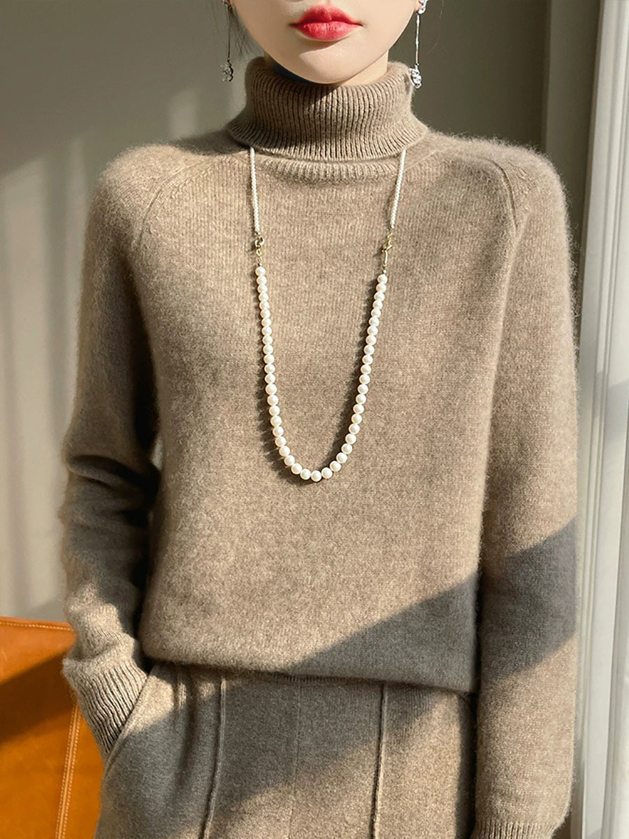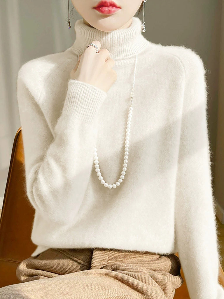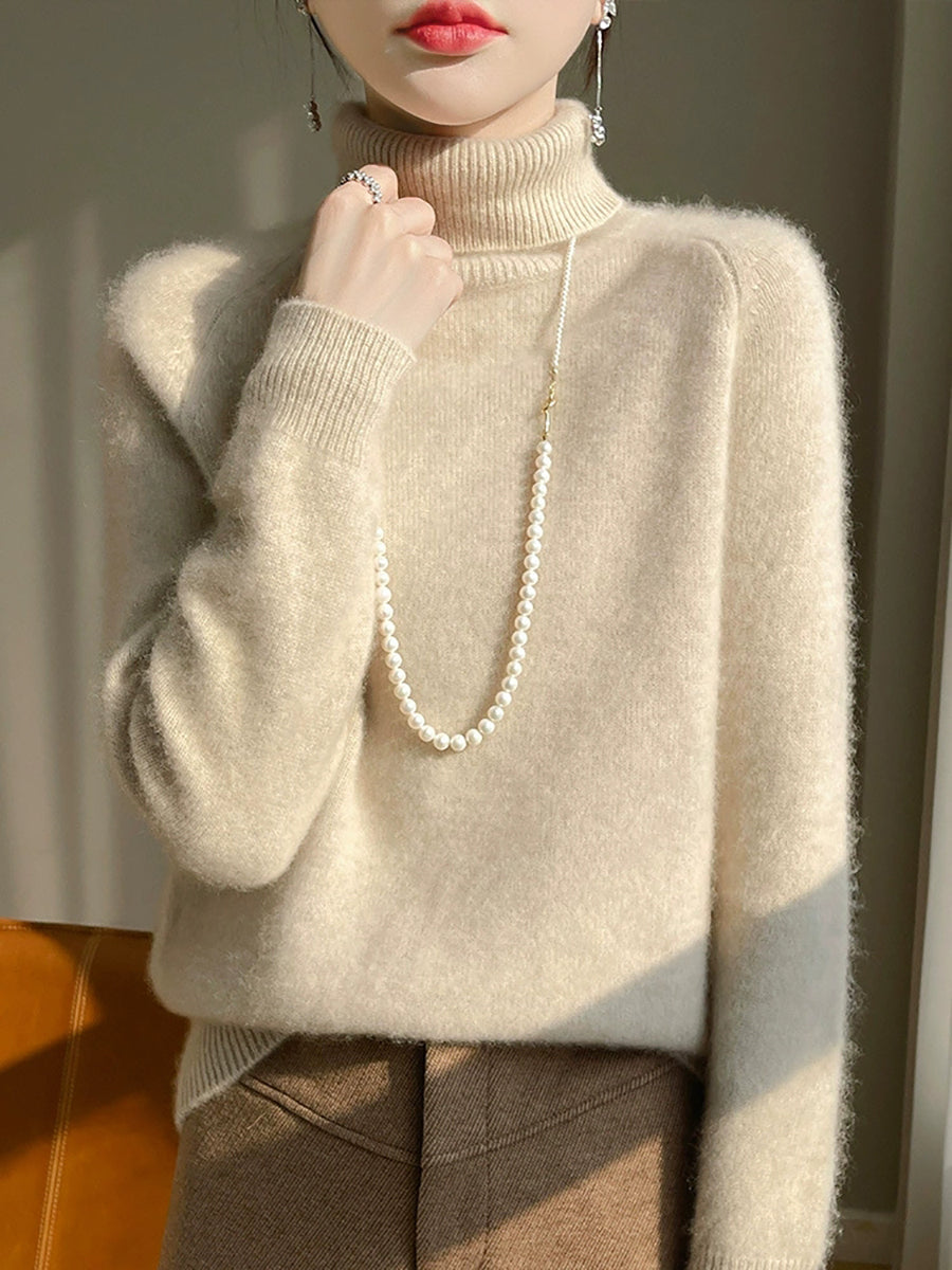 Suéter feminino de gola alta de cor lisa, 100% lã, para o inverno.