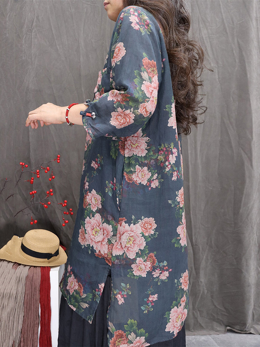 Blusa feminina artística com estampa floral de primavera, decote em V, 100% rami.