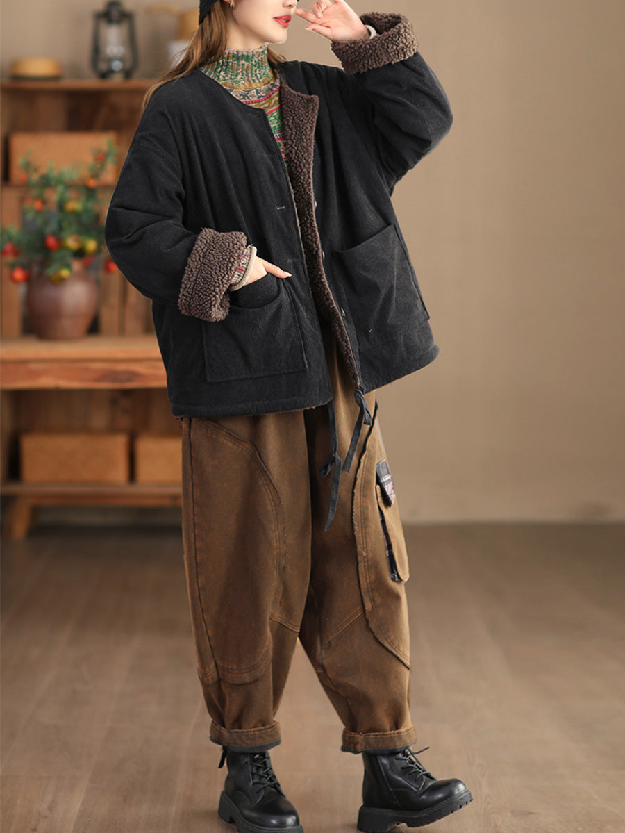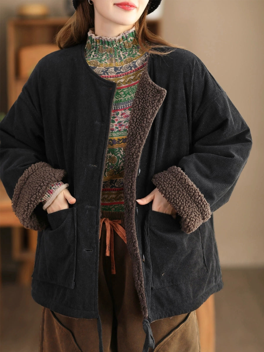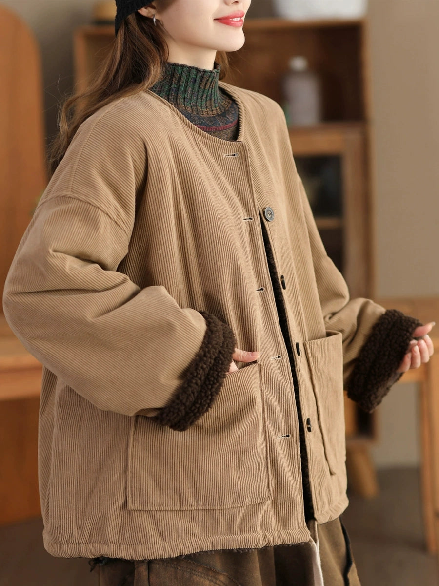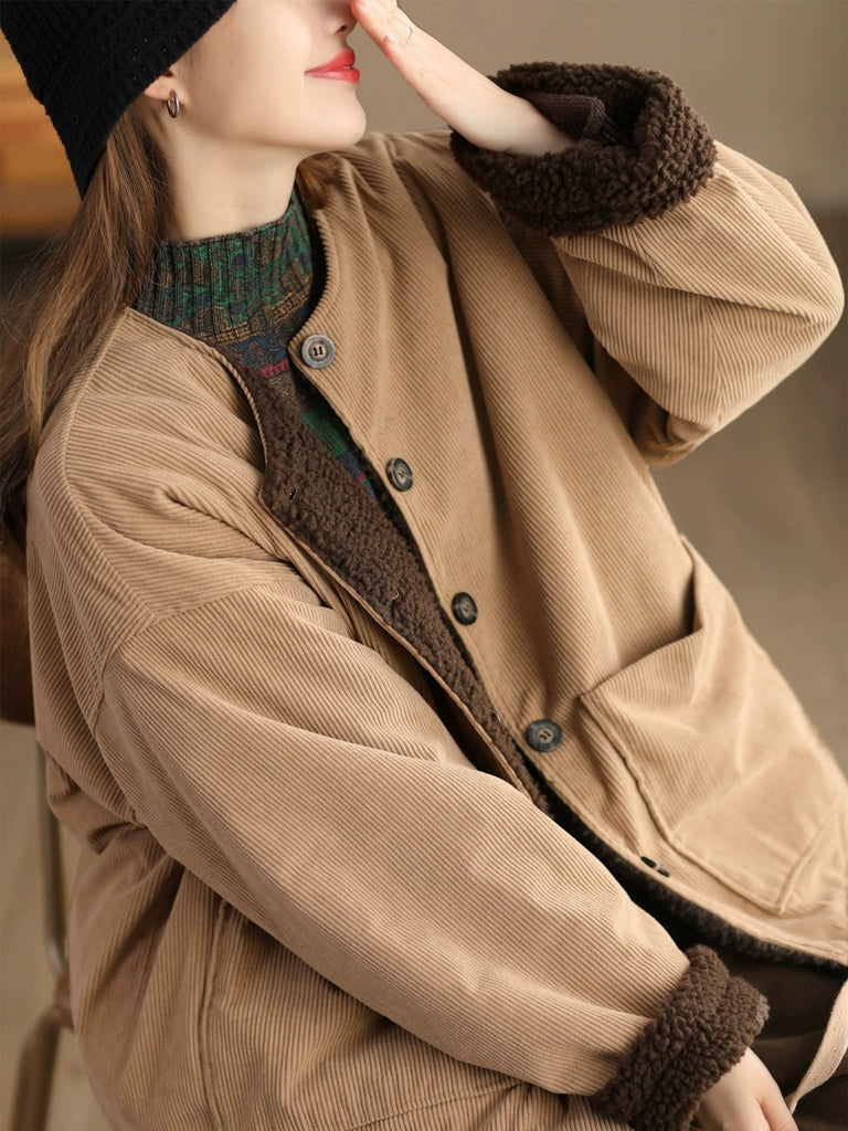 Jaqueta feminina vintage de inverno com gola redonda e forro de lã