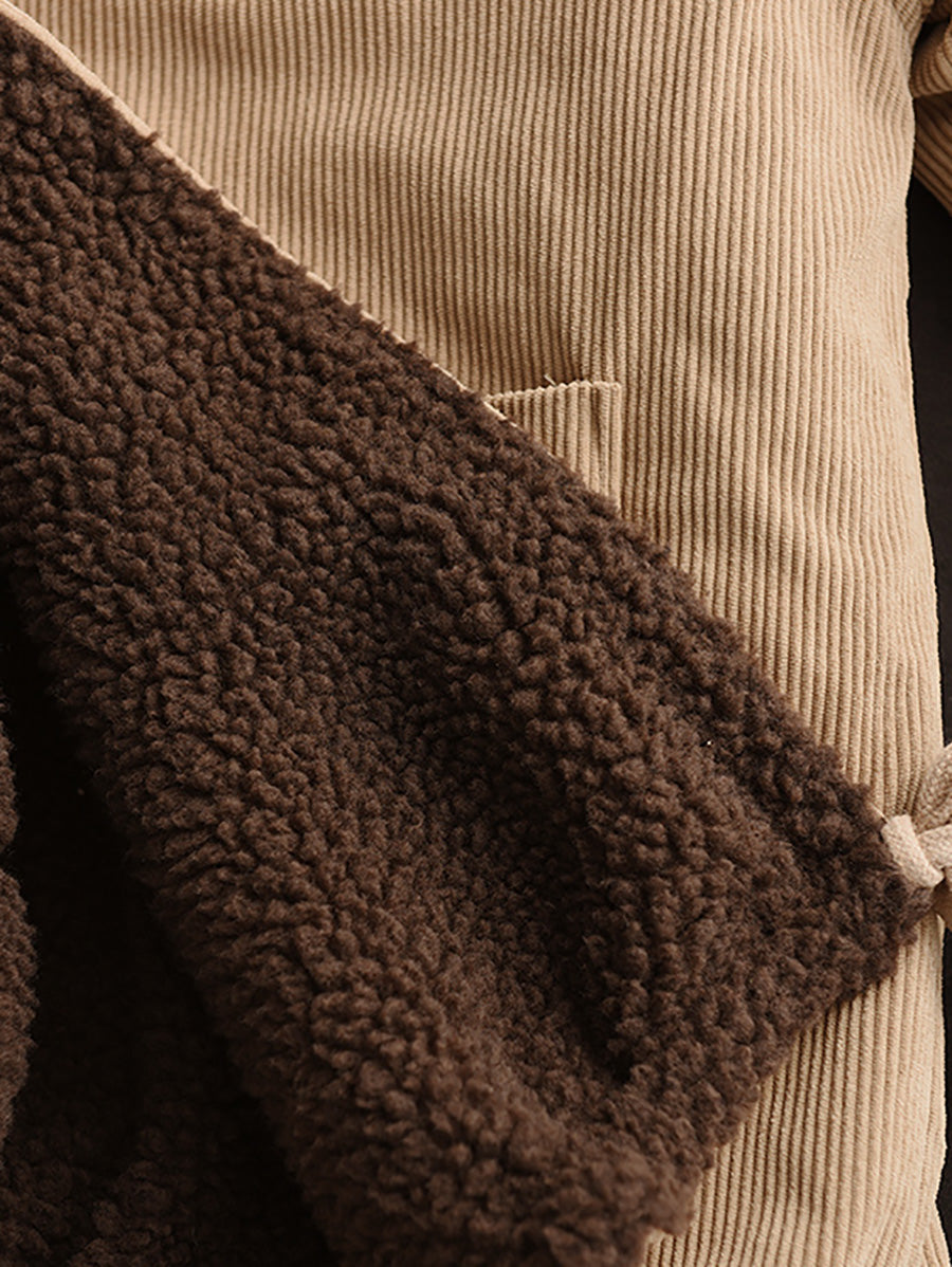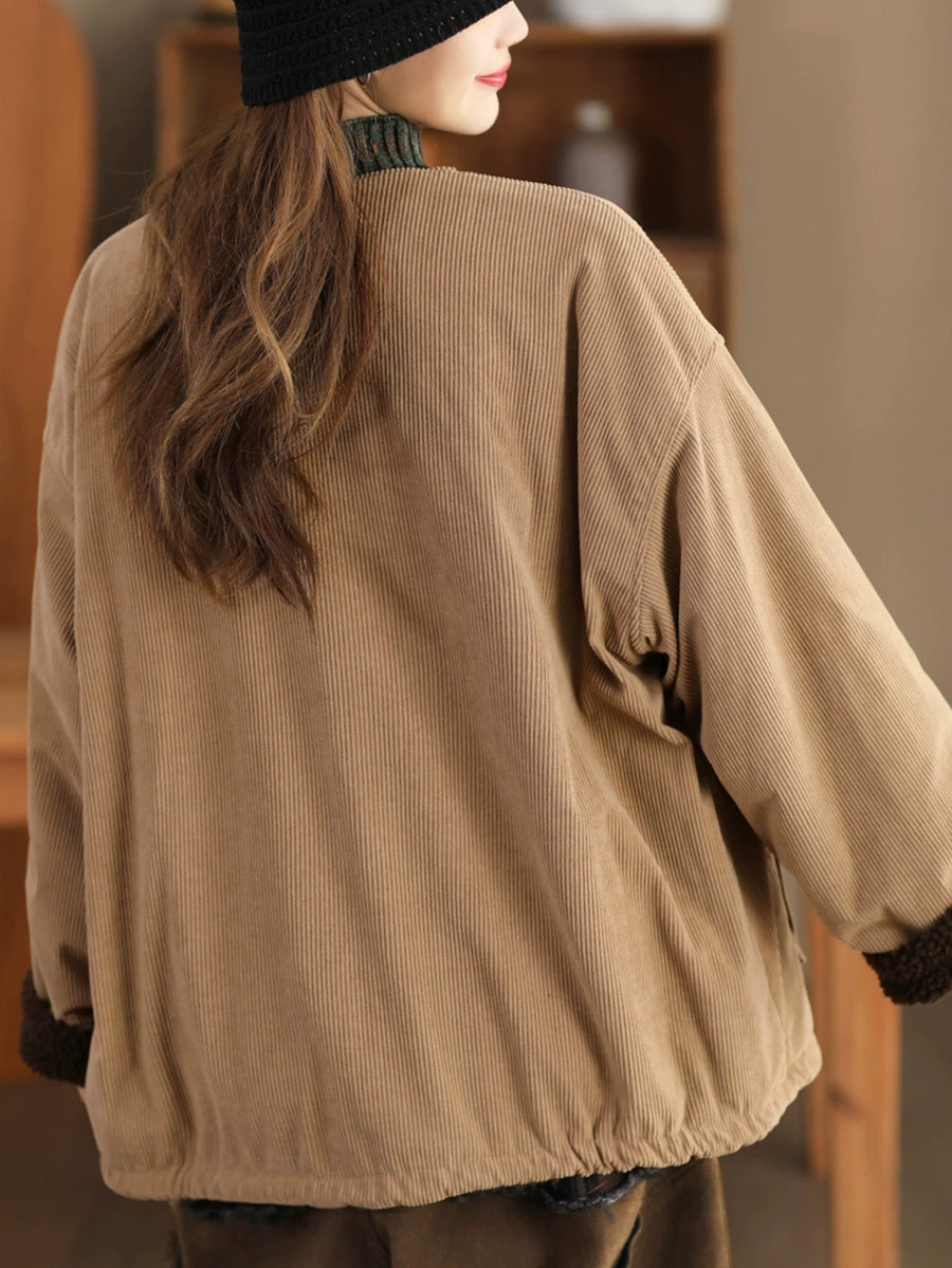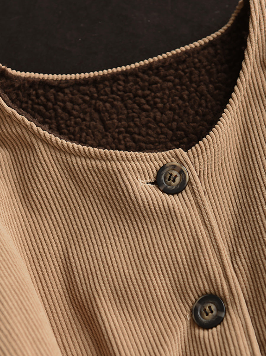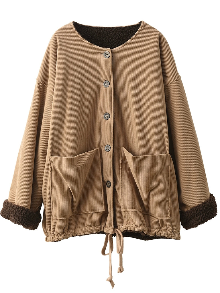 Jaqueta feminina vintage de inverno com gola redonda e forro de lã