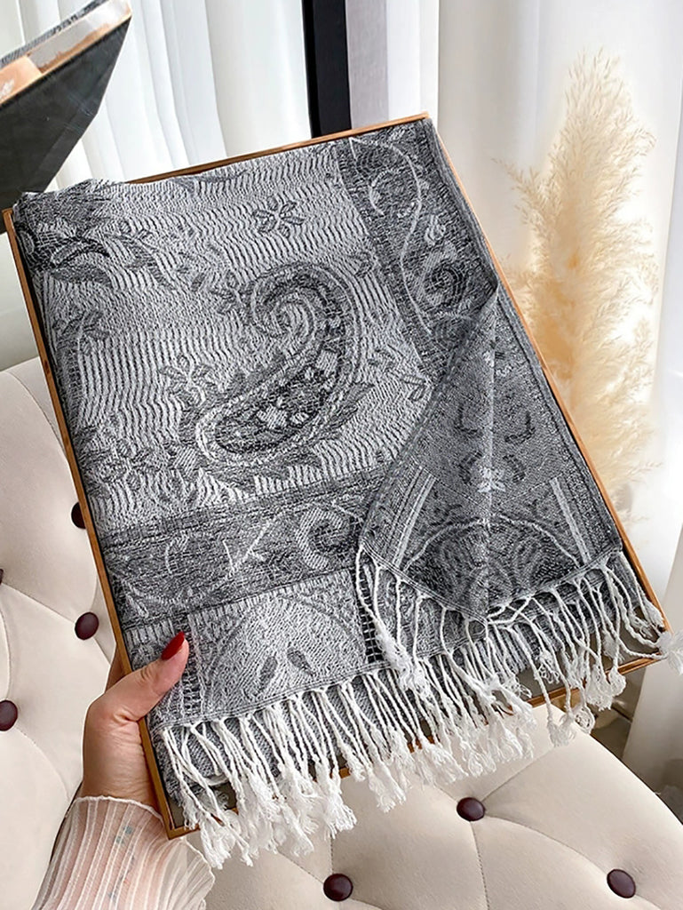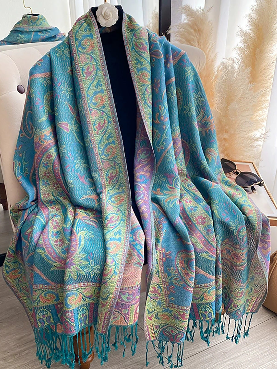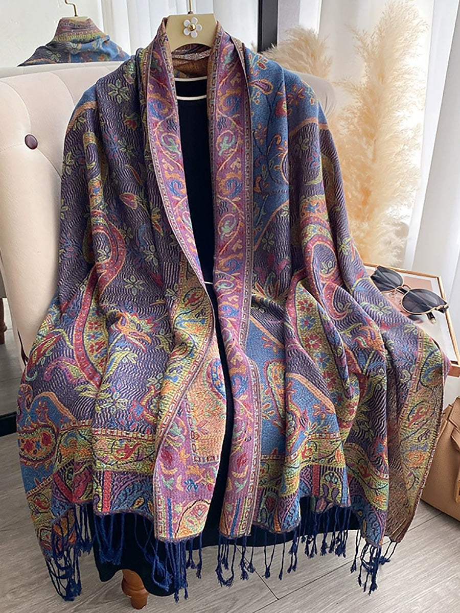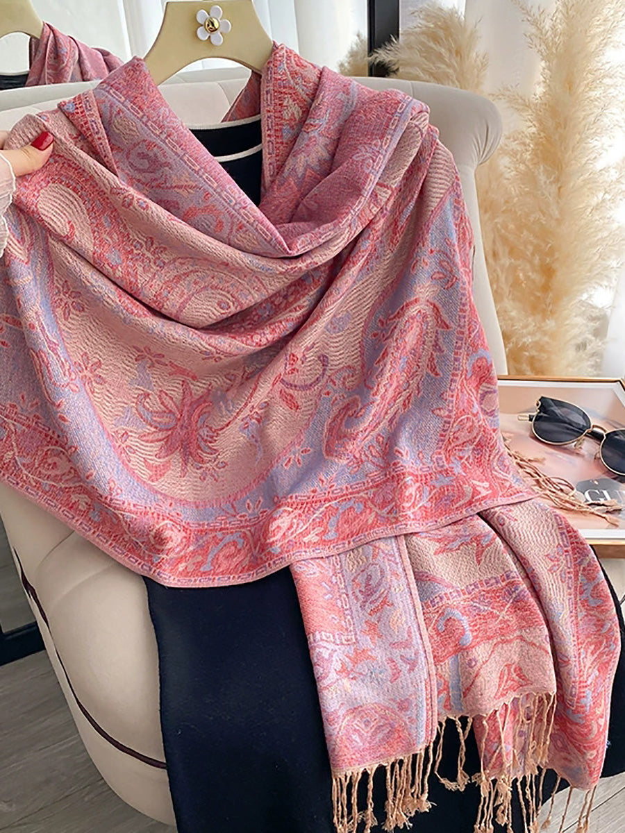 Xale feminino de inverno com estampa floral jacquard e franjas