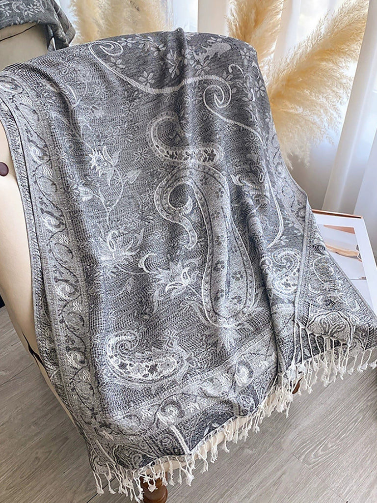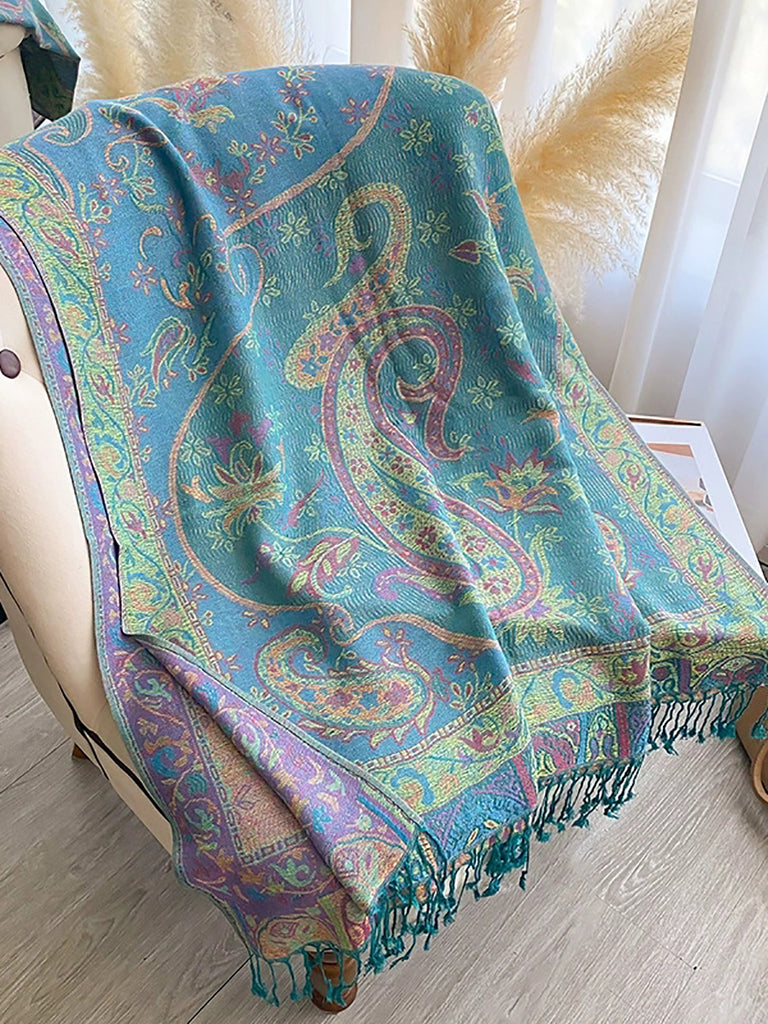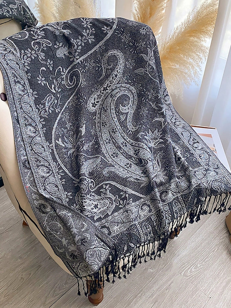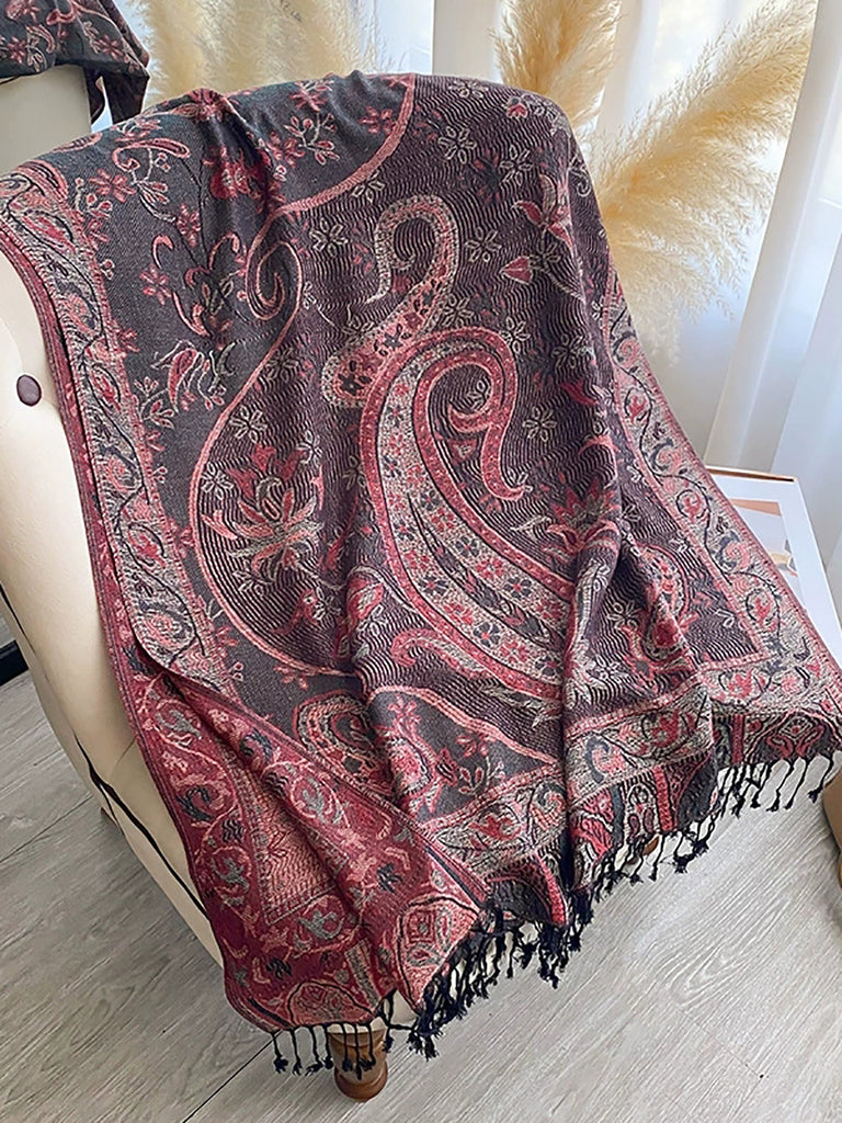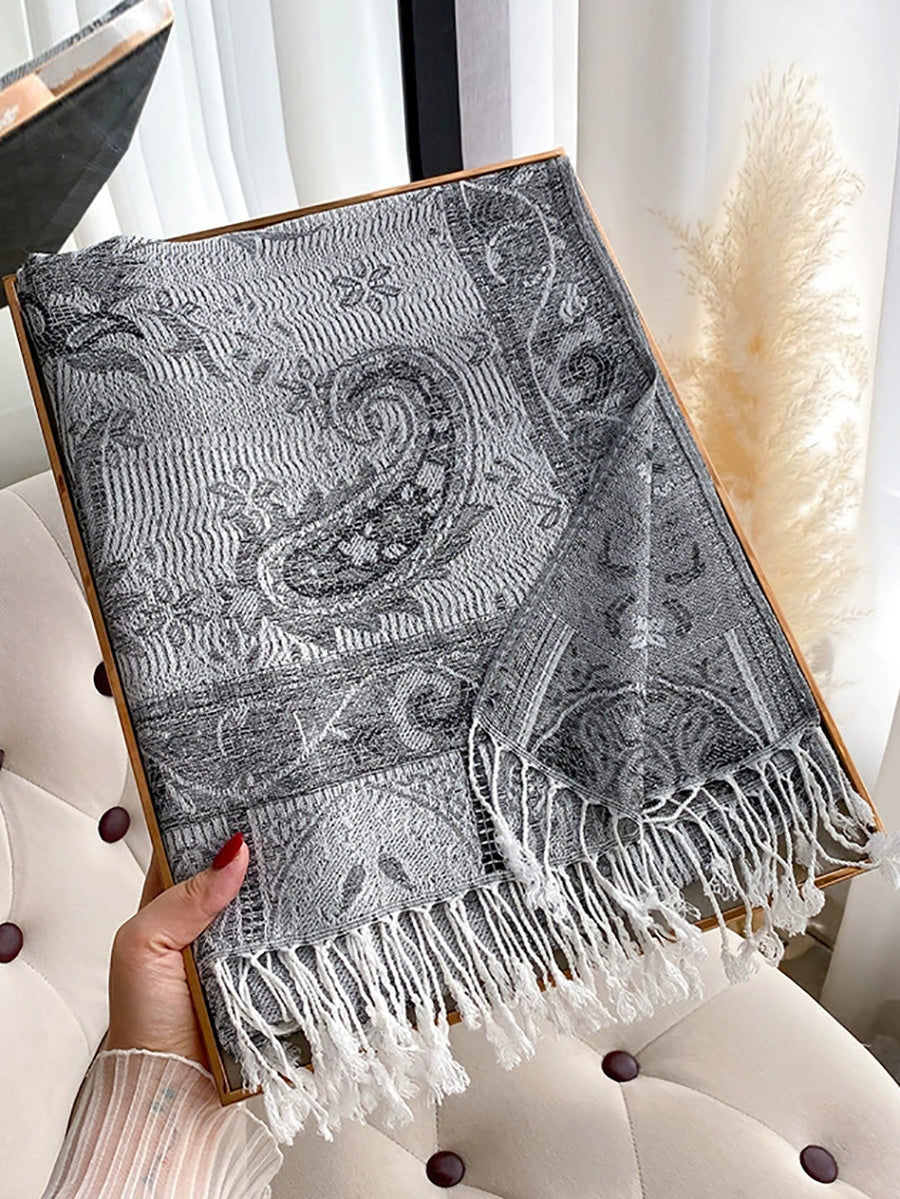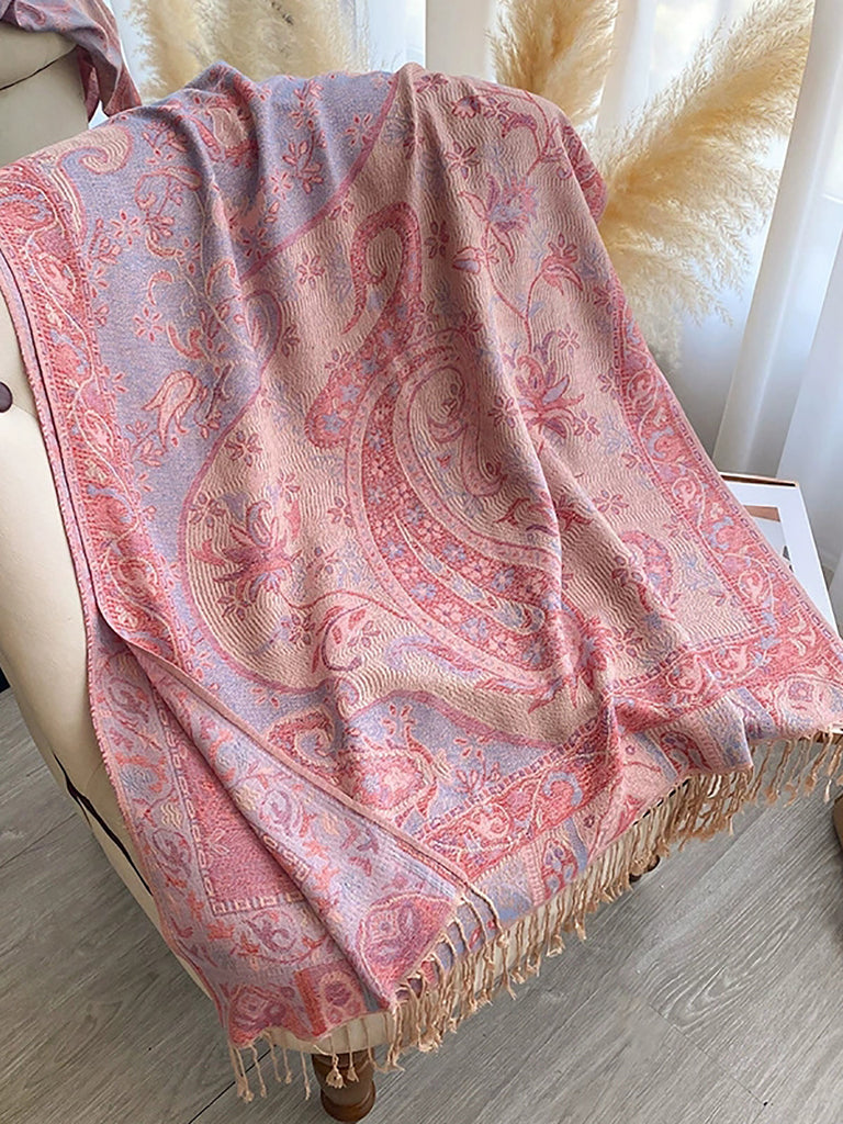 Xale feminino de inverno com estampa floral jacquard e franjas