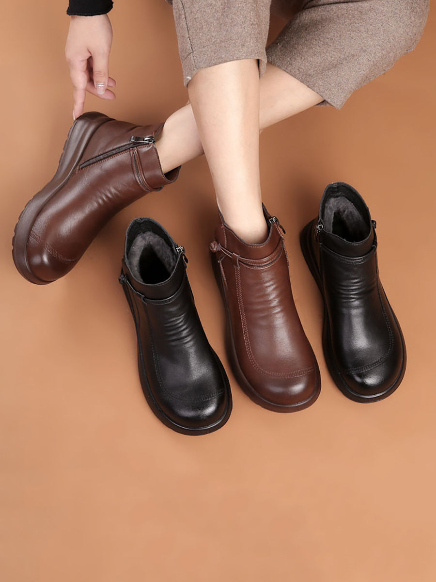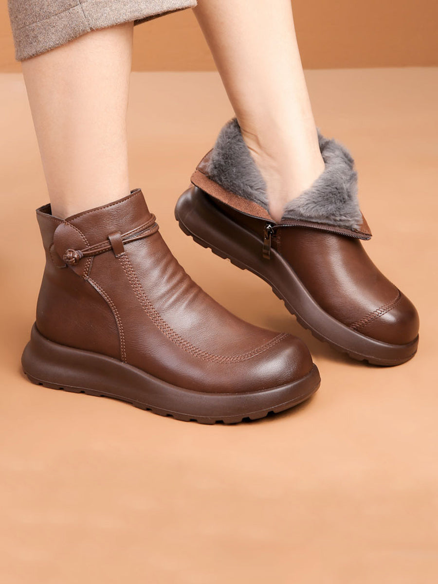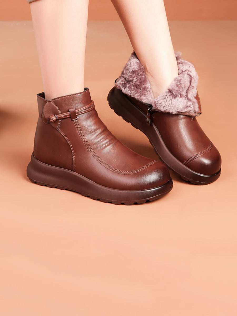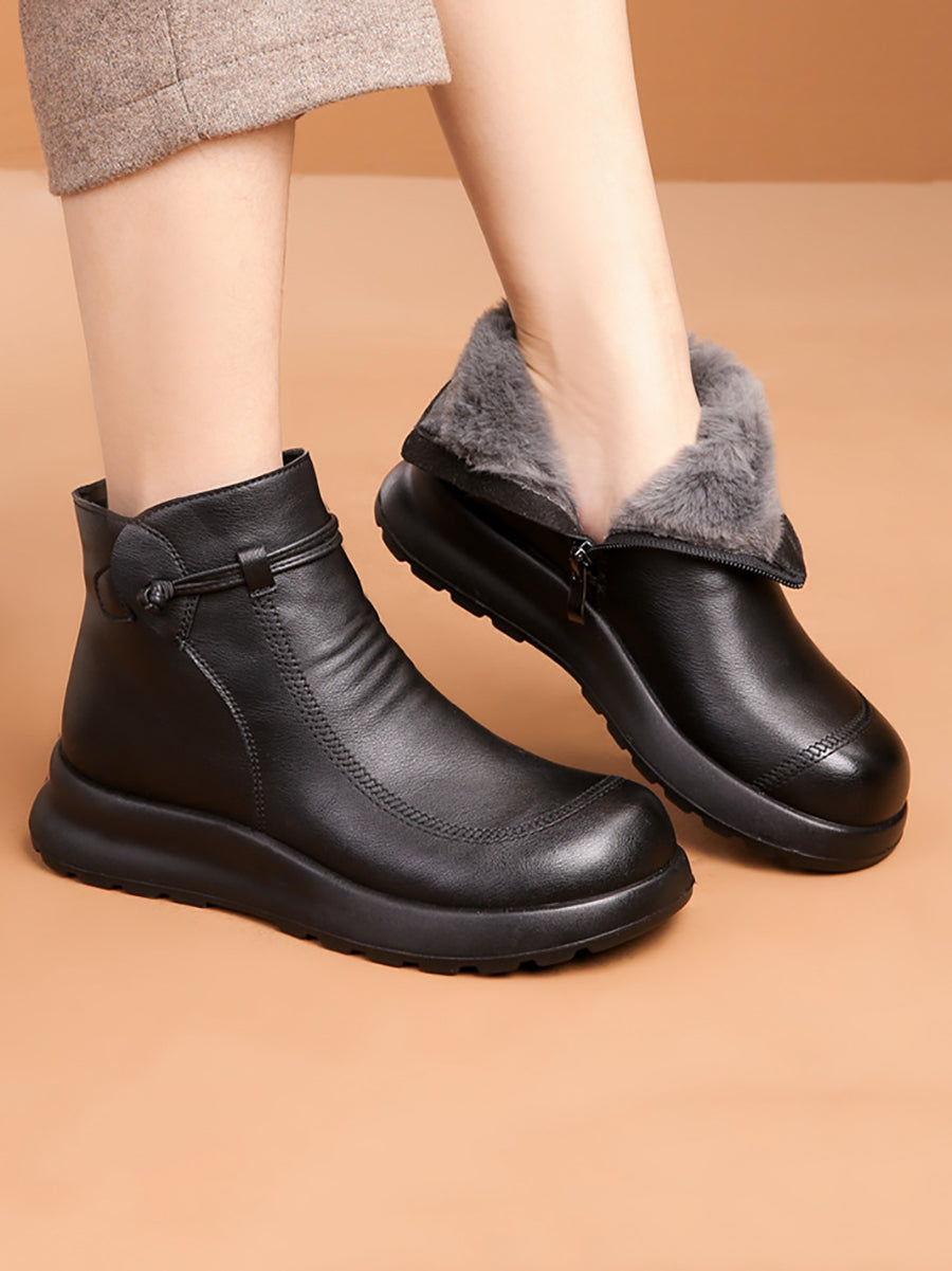 Botas de cano curto femininas de inverno em couro legítimo com forro de lã