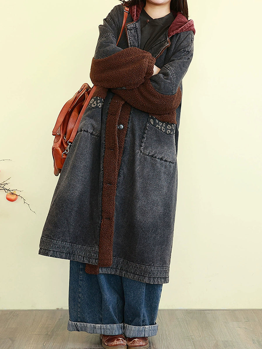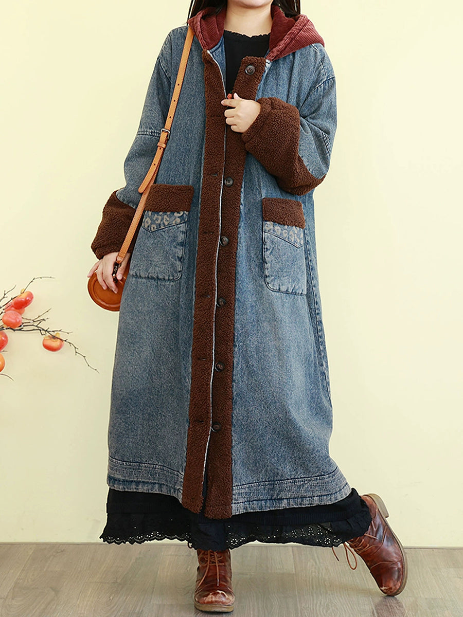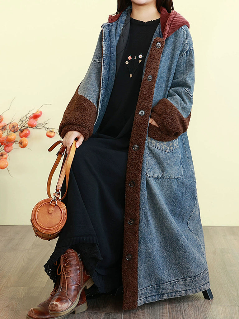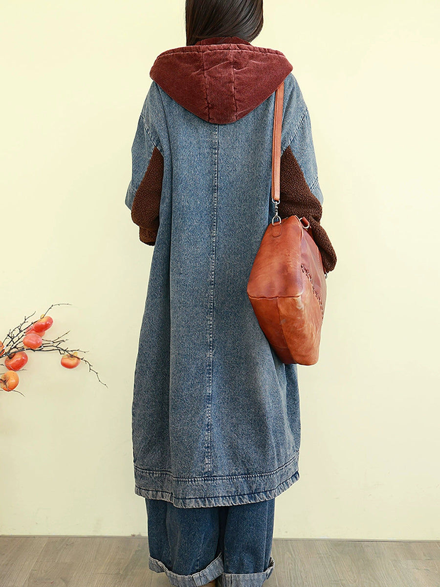 Casaco feminino de inverno vintage com capuz acolchoado em jeans e detalhes recortados