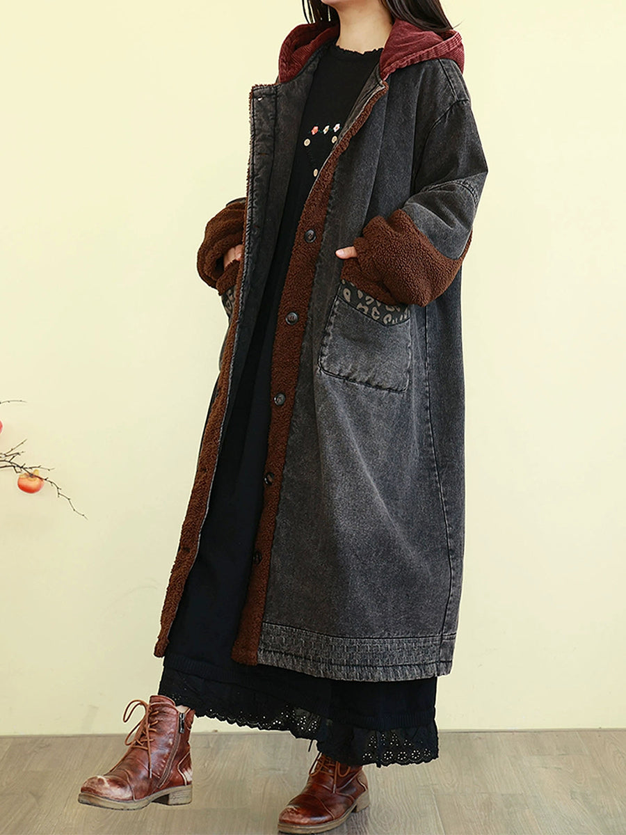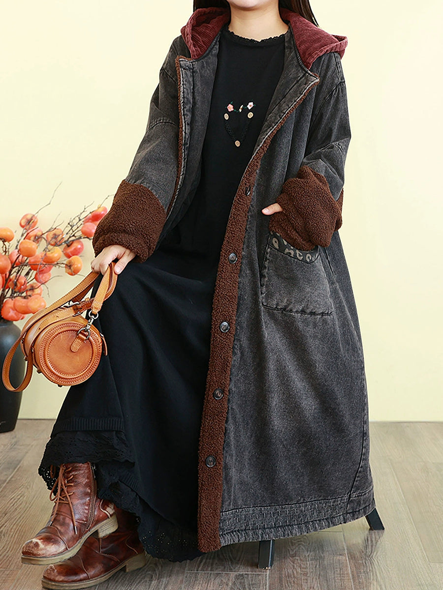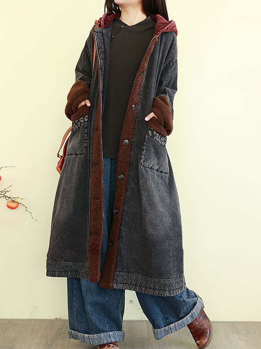 Casaco feminino de inverno vintage com capuz acolchoado em jeans e detalhes recortados
