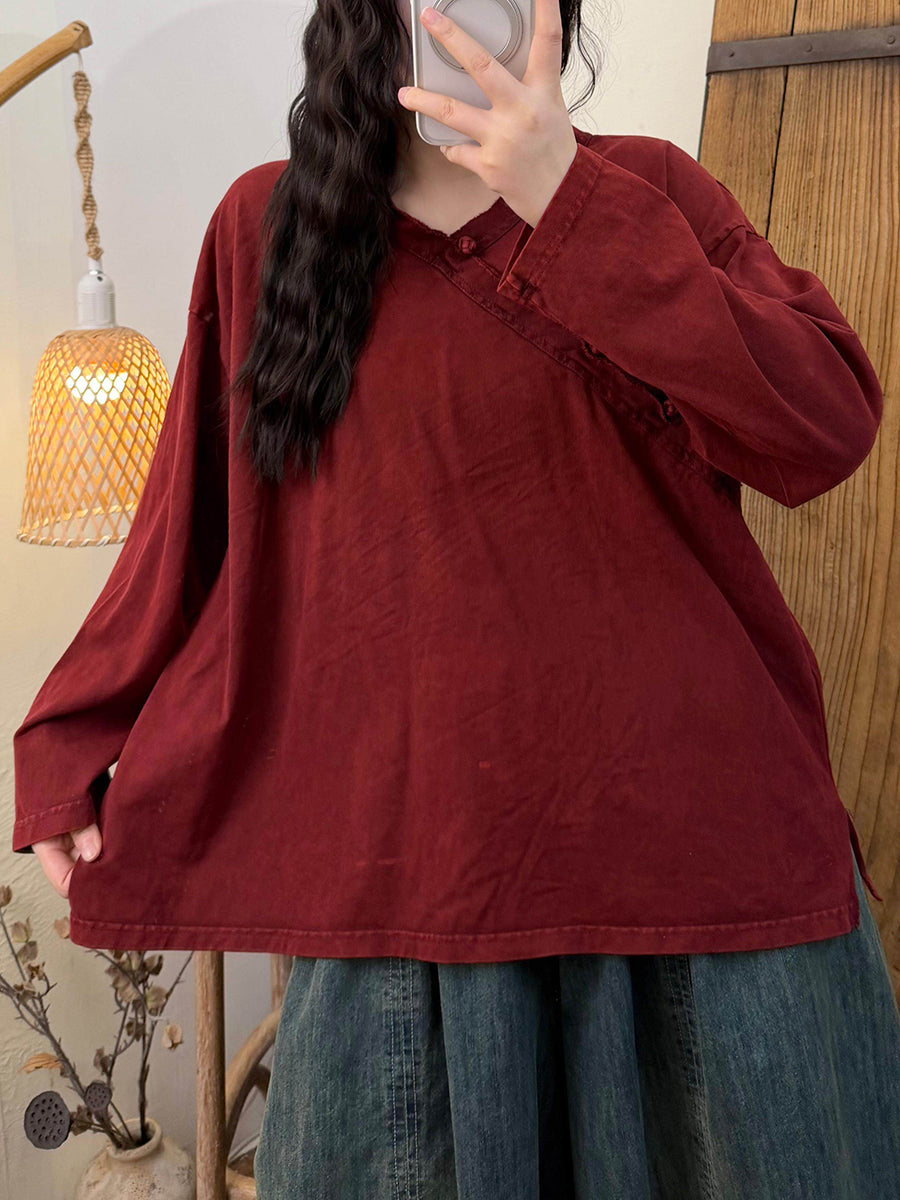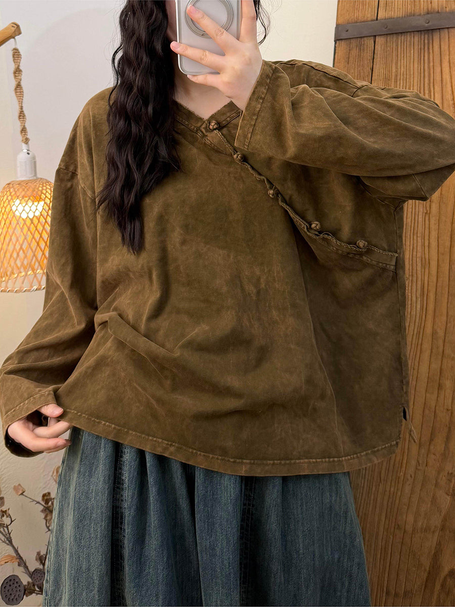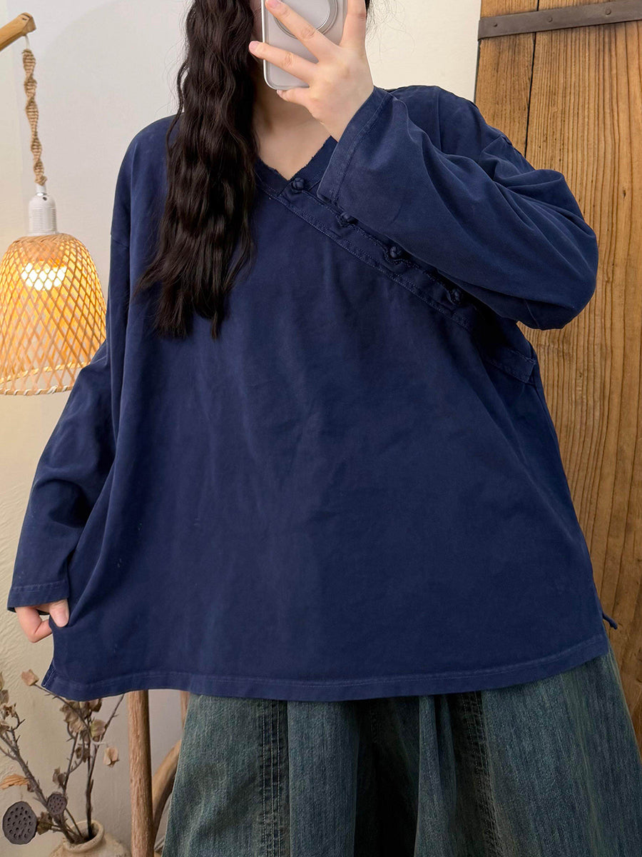 Blusa feminina de algodão com decote em V, estilo vintage e artístico para a primavera.