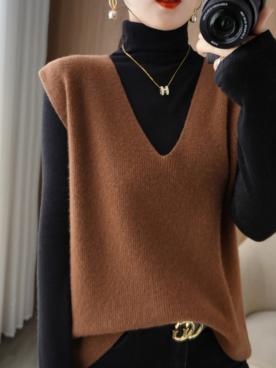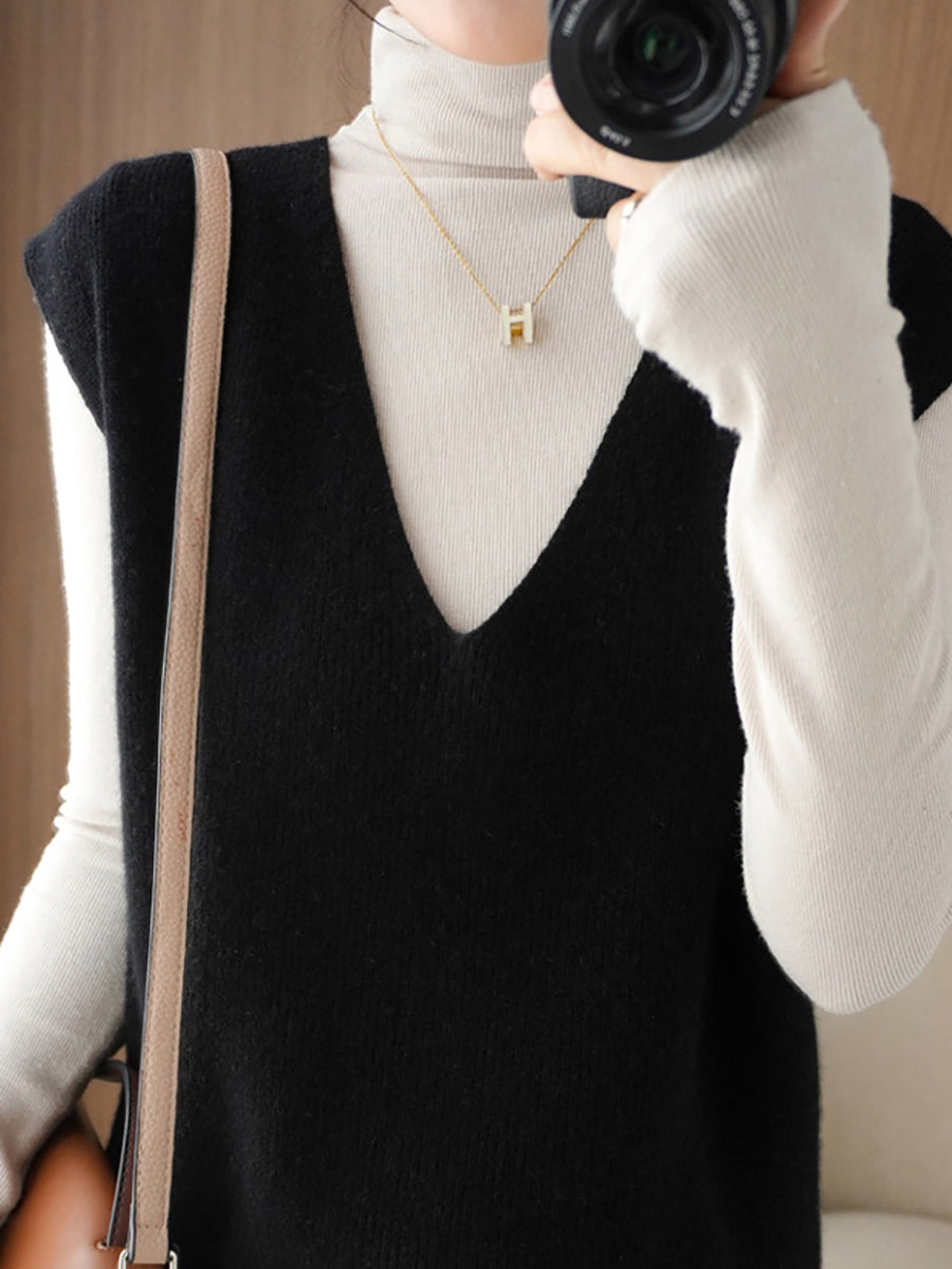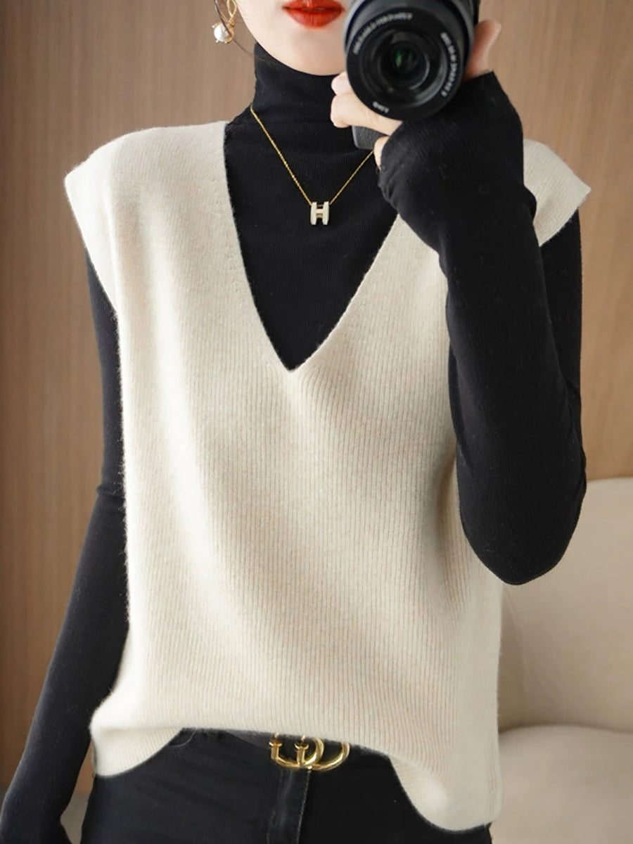 Colete feminino de tricô casual de outono, cor lisa, decote em V