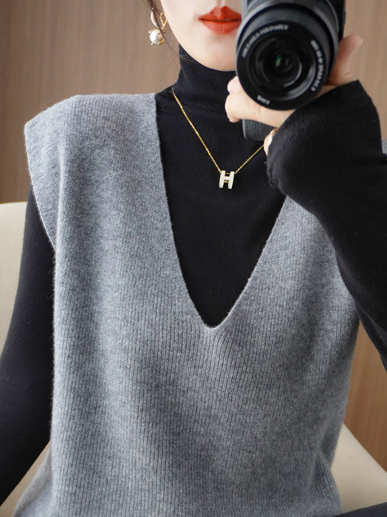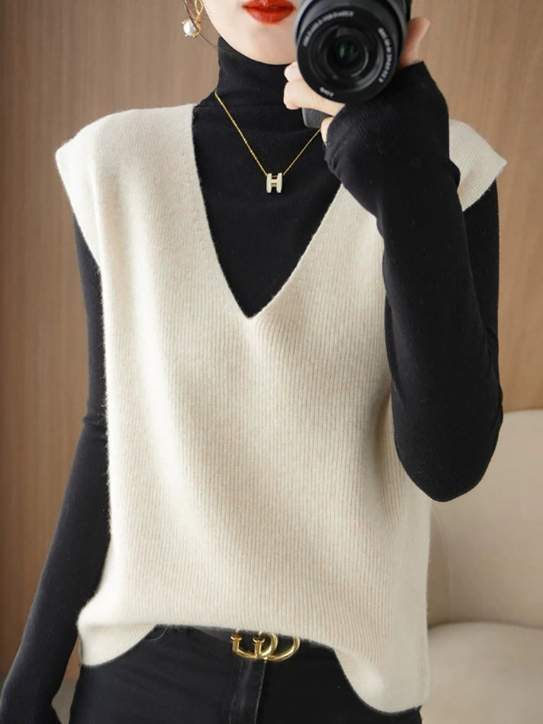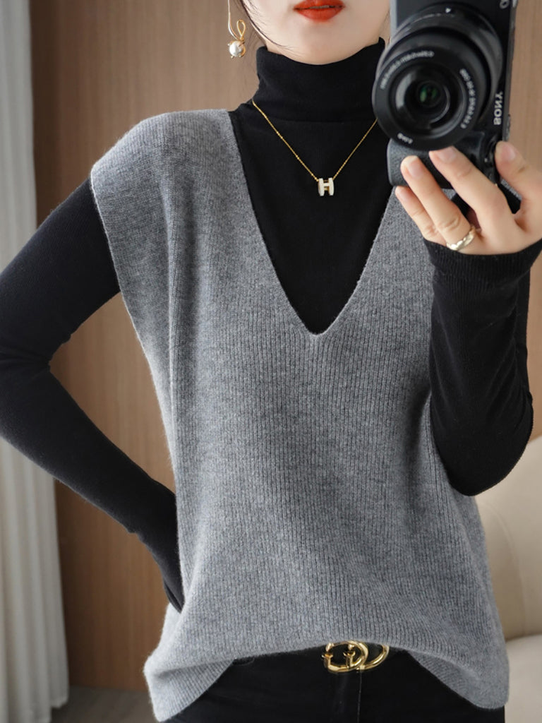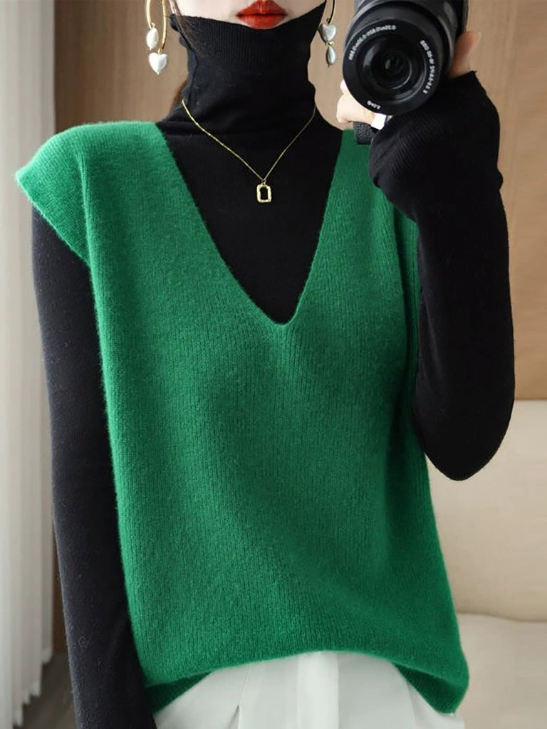 Colete feminino de tricô casual de outono, cor lisa, decote em V