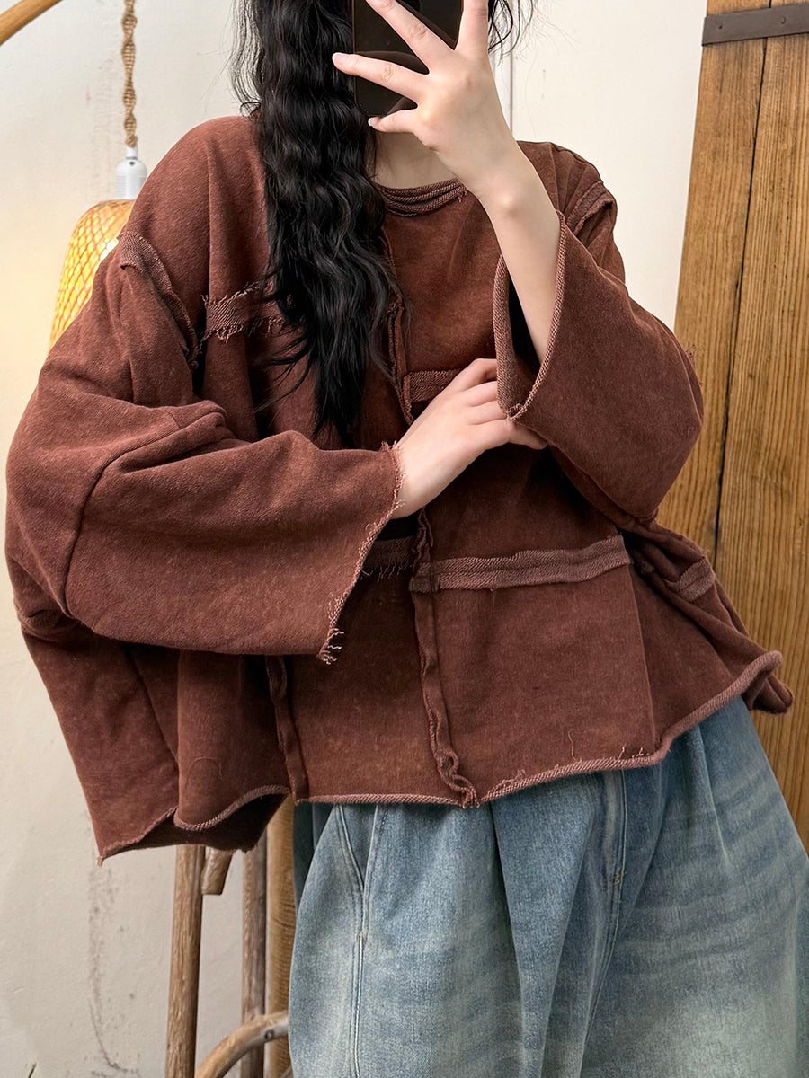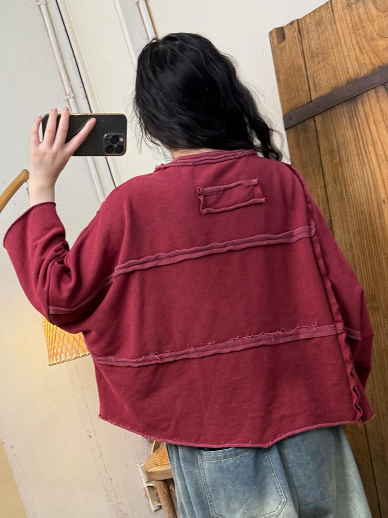 Camisa feminina retrô de outono com gola redonda de algodão puro e emendado
